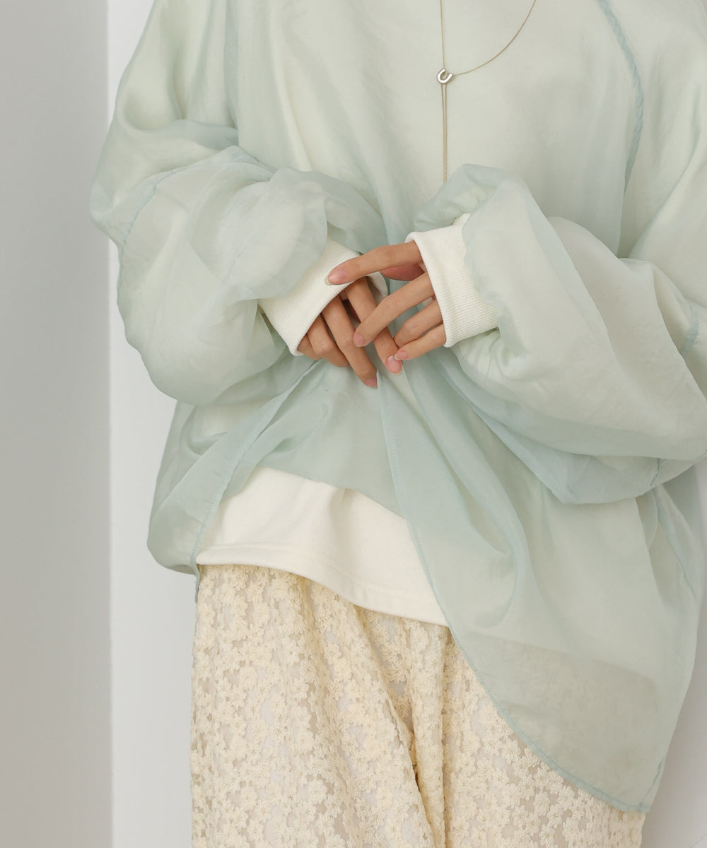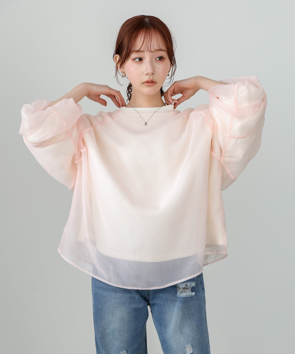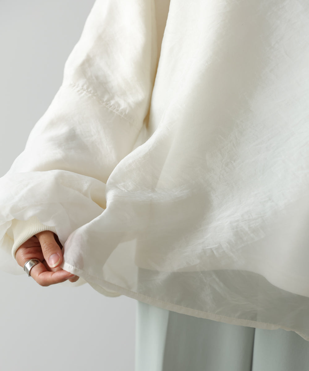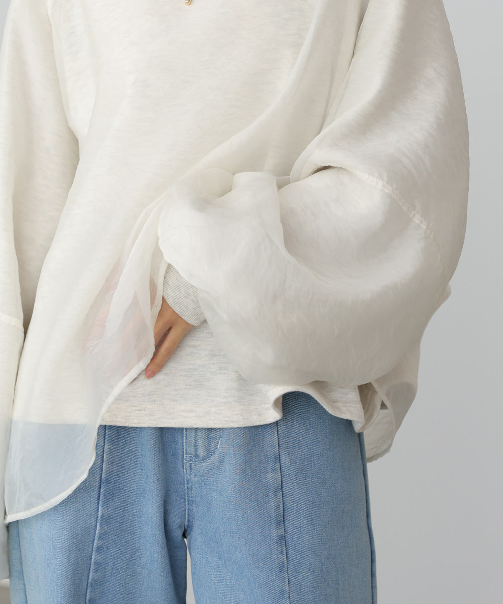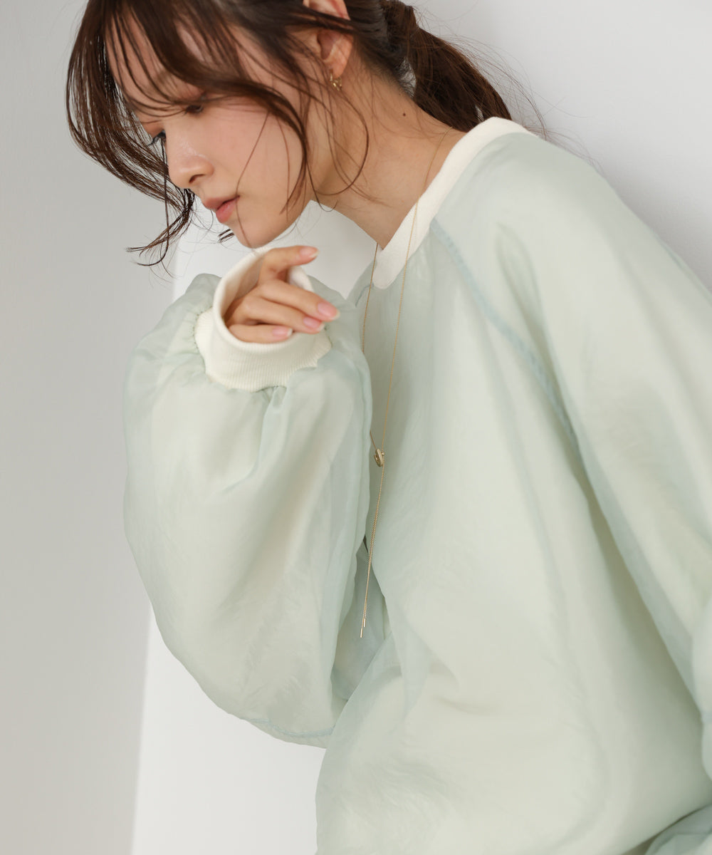 イージーな着心地の裏毛スウェットにオーガンジーをレイヤードして着映え抜群の1枚が出来上がりました!オーガンジー部分は光の当たり具合で様々な表情が浮かび上がります。ラグランスリーブの程よくルーズなシルエットがこなれ感を演出し、袖もぱふっと感があり 可愛らしいボリューム感でフェミニンさを引き立てます。バランスの取りやすい腰までのレングスも魅力的です。