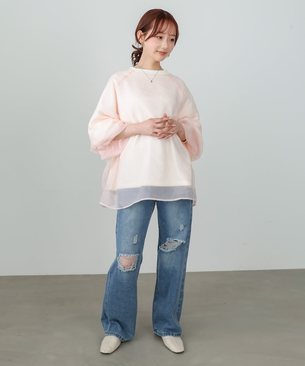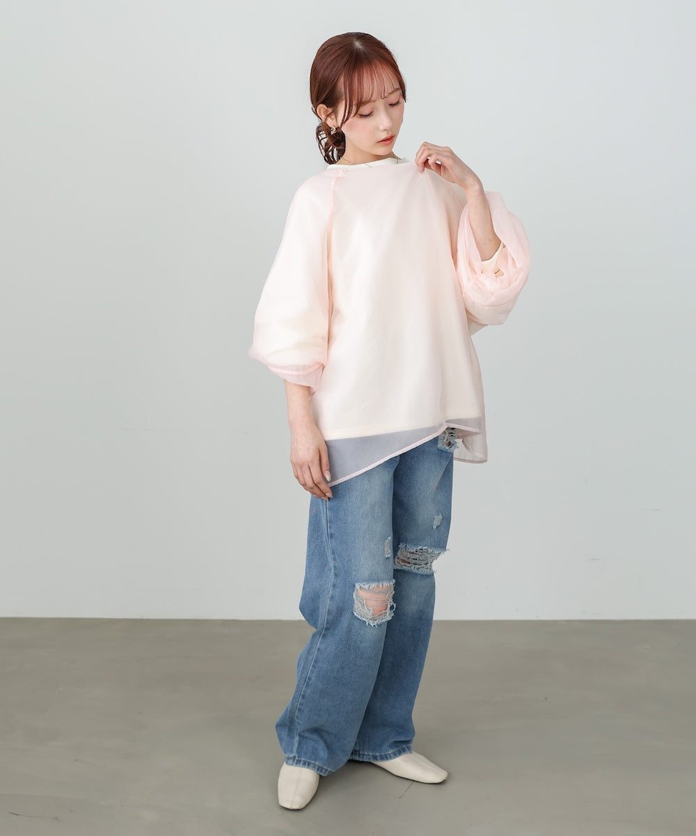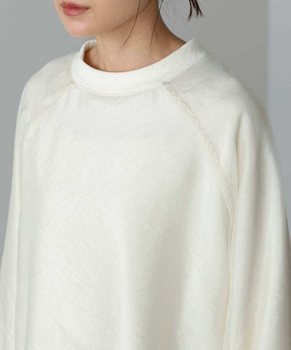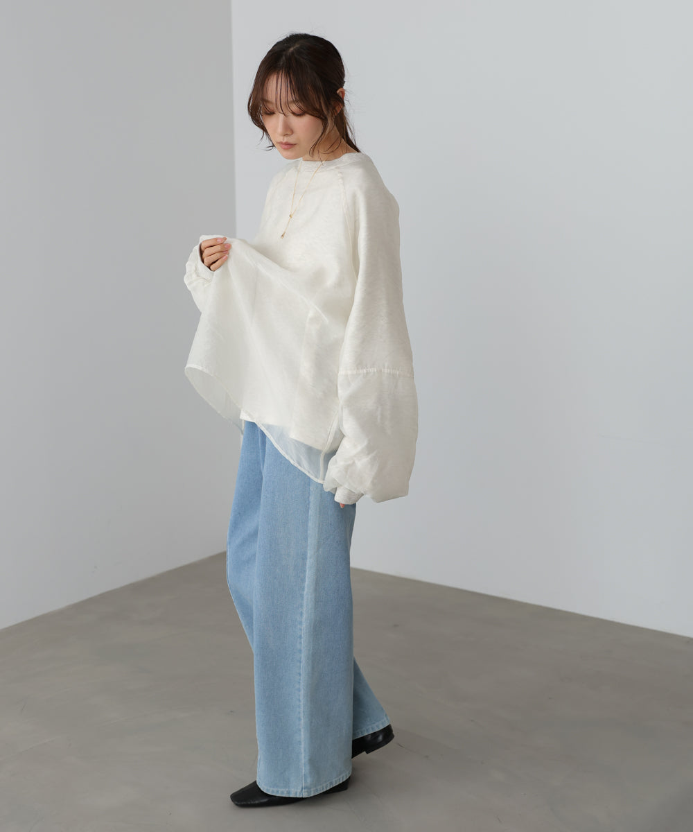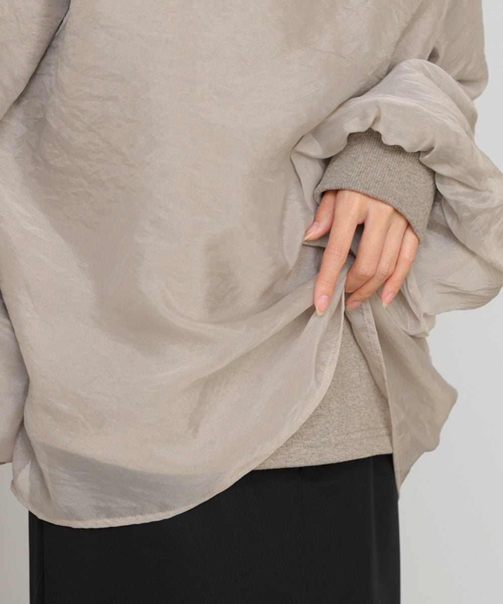 イージーな着心地の裏毛スウェットにオーガンジーをレイヤードして着映え抜群の1枚が出来上がりました!オーガンジー部分は光の当たり具合で様々な表情が浮かび上がります。ラグランスリーブの程よくルーズなシルエットがこなれ感を演出し、袖もぱふっと感があり 可愛らしいボリューム感でフェミニンさを引き立てます。バランスの取りやすい腰までのレングスも魅力的です。
