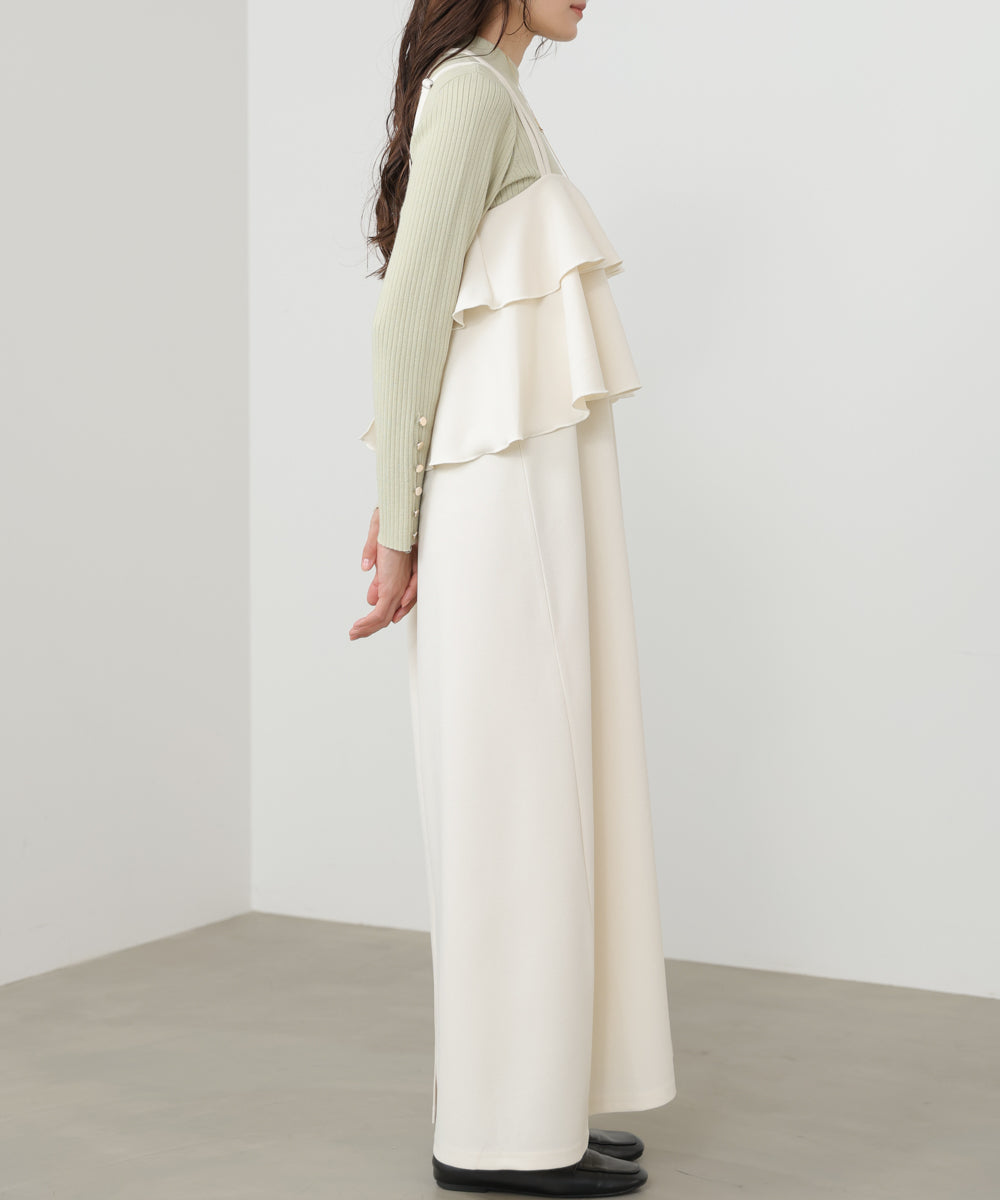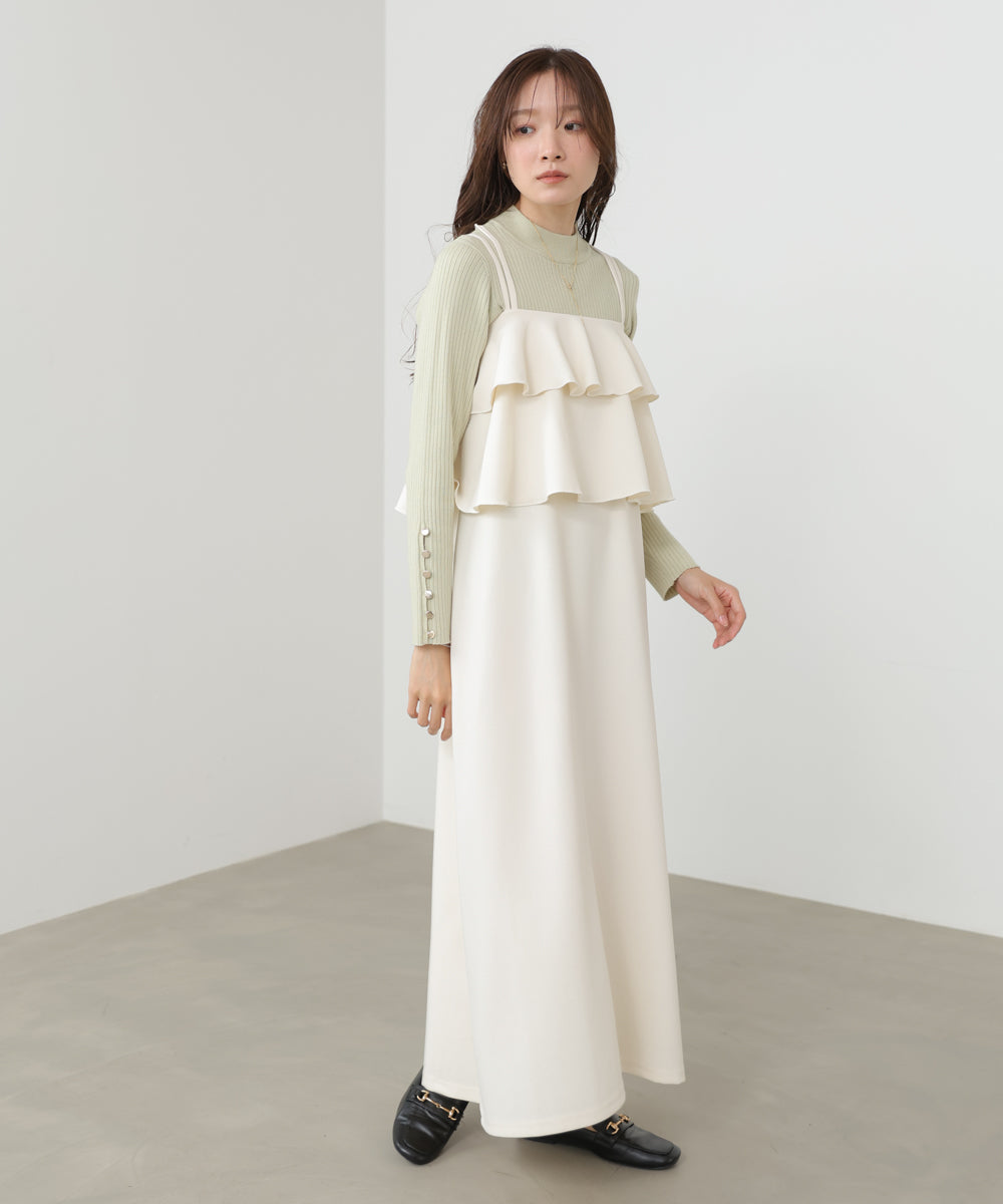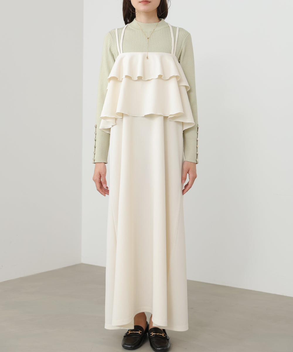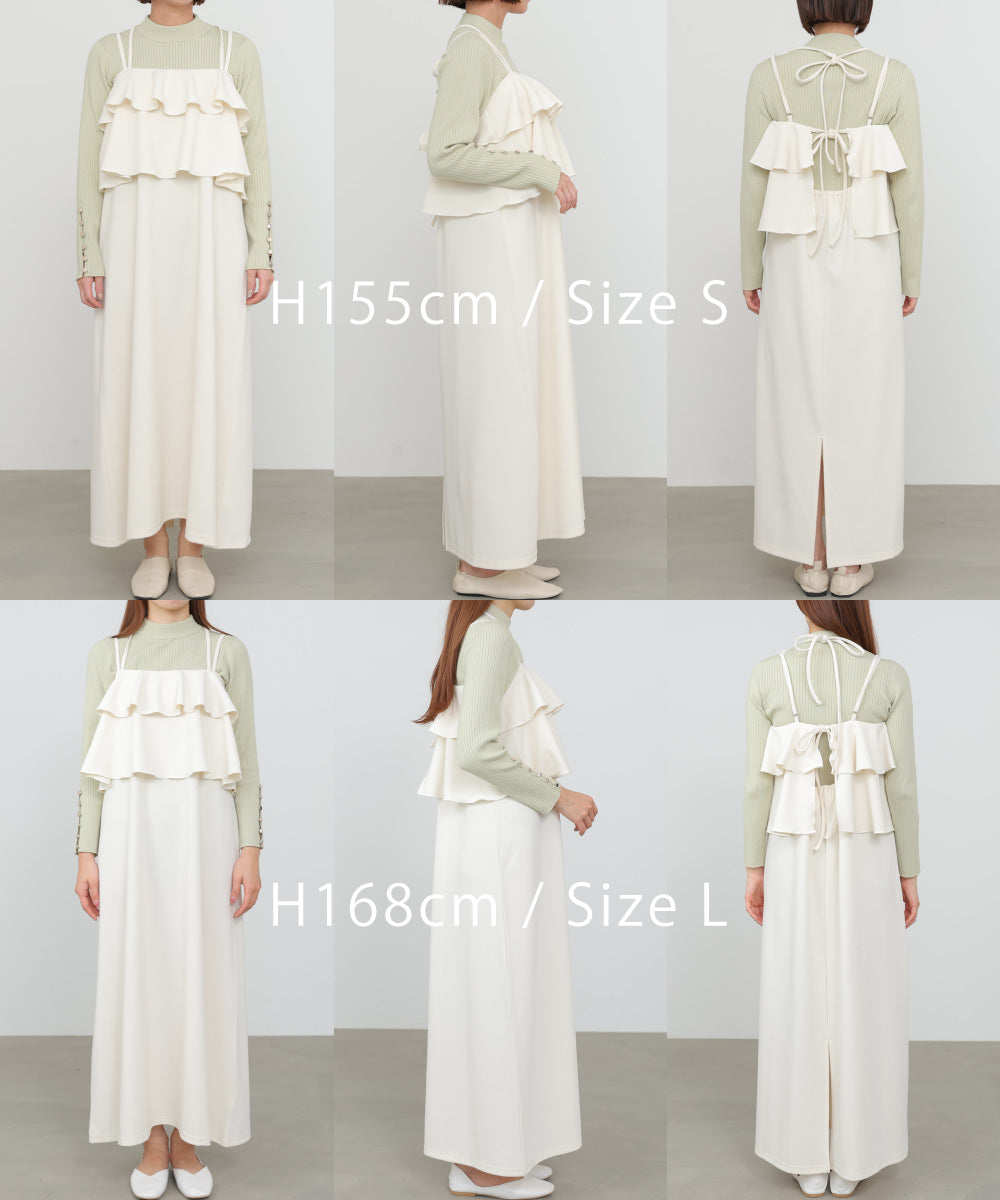 Sサイズを着用しました。肩部分で長さ調節ができるので低身長の方でも長さを調節できてうれしかったです!胸元のティアードデザインがさりげなくガーリーにしてくれます。