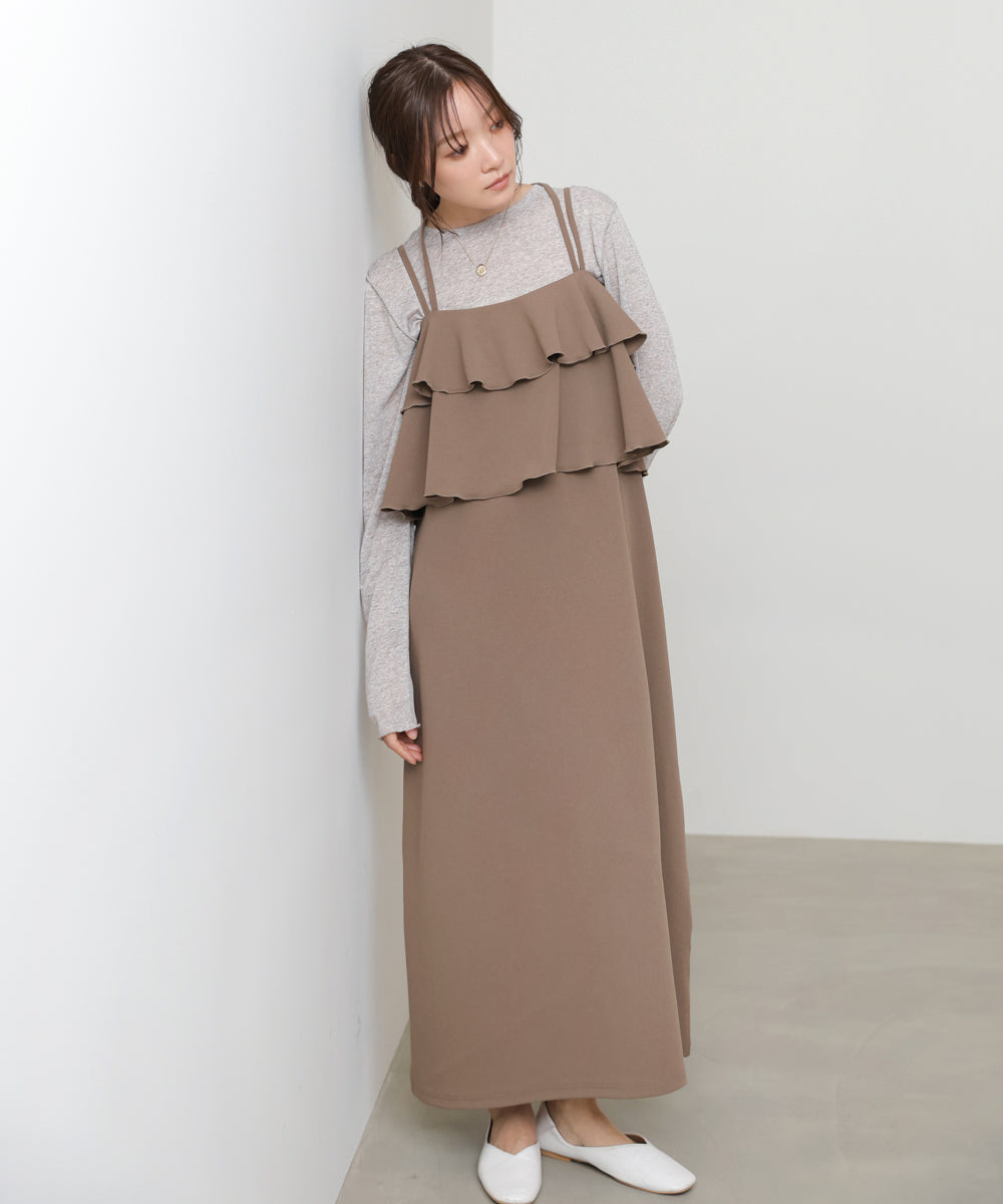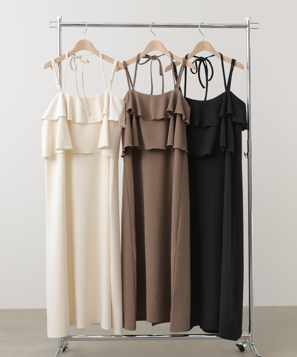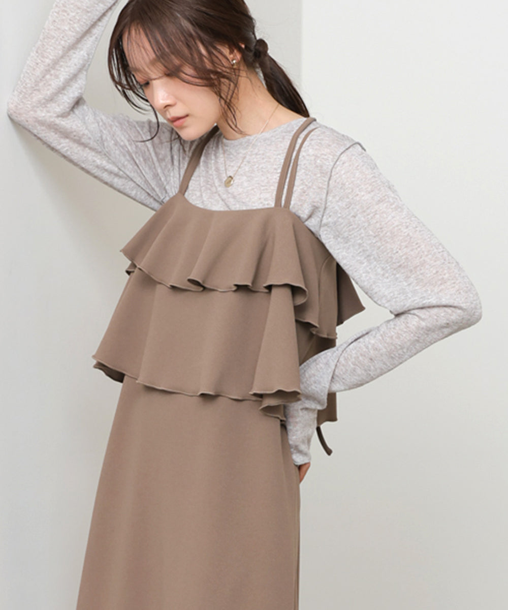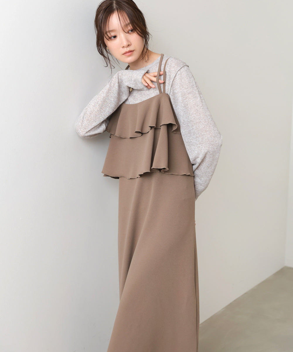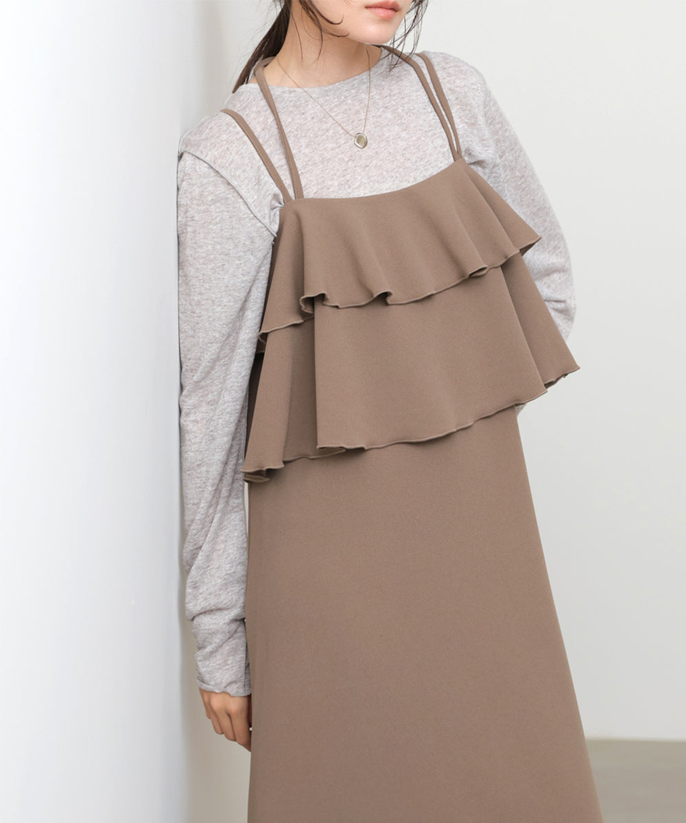 胸元に施したティアードデザインが、さりげなく華やかさを添えるキャミワンピース。甘さを抑えたデザインと、すとんと落ちるシルエットで大人っぽく着こなせる一枚です。落ち感のある素材が縦ラインを強調し、自然とスタイルアップ効果も期待できます。シンプルながらも表情のあるデザインで、幅広いシーンに対応します。