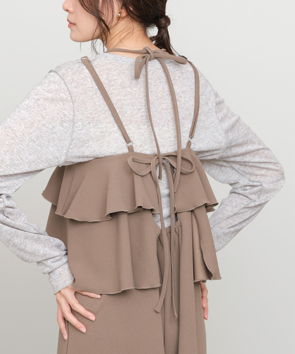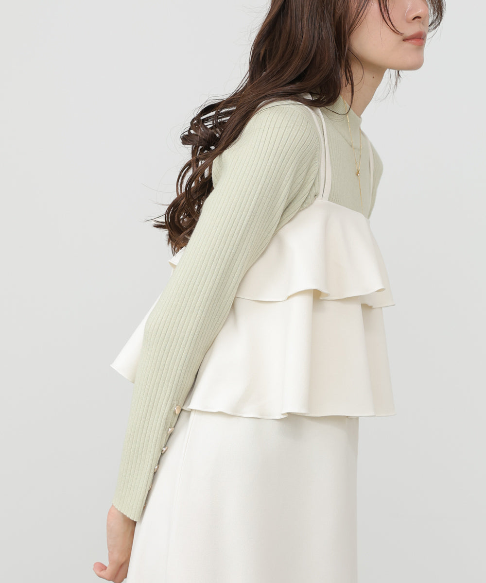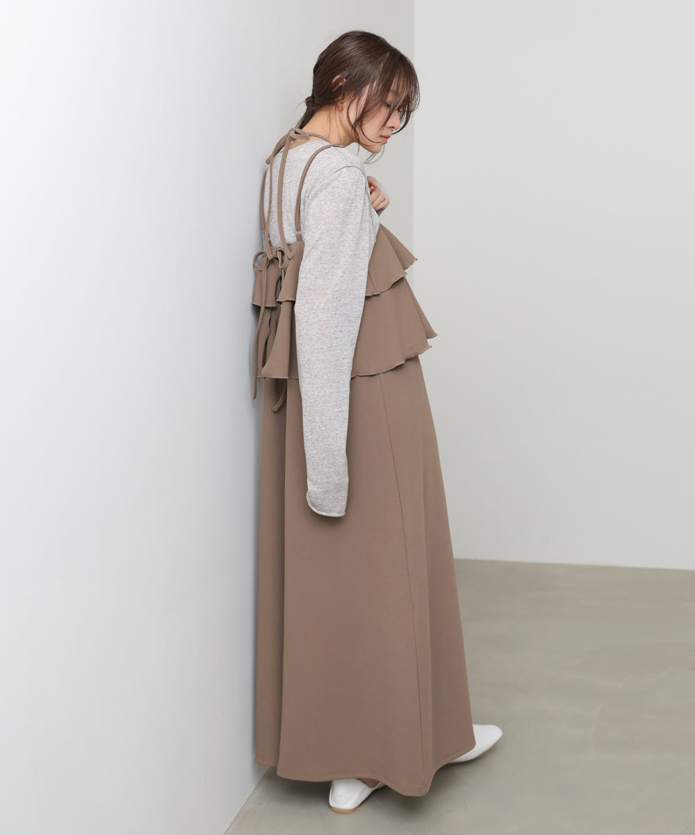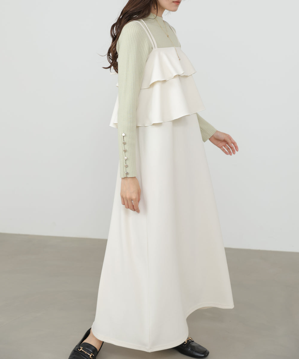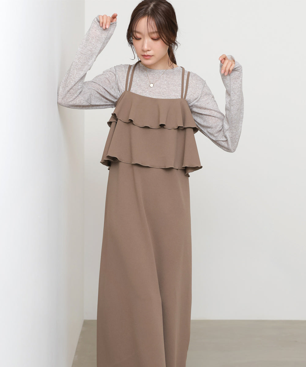 胸元に施したティアードデザインが、さりげなく華やかさを添えるキャミワンピース。甘さを抑えたデザインと、すとんと落ちるシルエットで大人っぽく着こなせる一枚です。落ち感のある素材が縦ラインを強調し、自然とスタイルアップ効果も期待できます。シンプルながらも表情のあるデザインで、幅広いシーンに対応します。