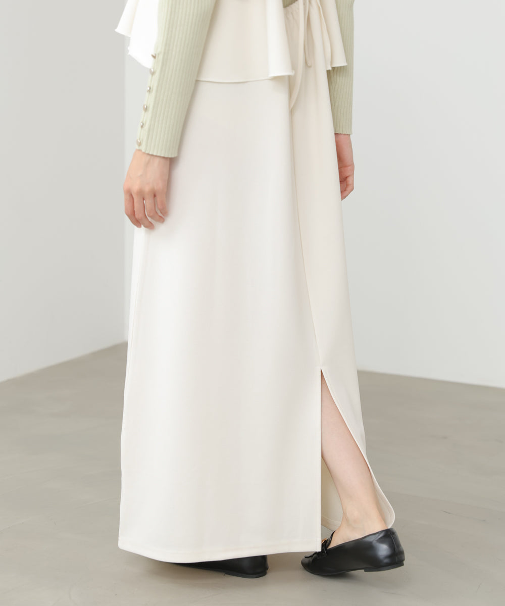 ポリエステルベースにポリウレタンを混紡した、なめらかで落ち感のある素材を使用。程よく厚みがあり、身体のラインを拾いにくく安心感のある着心地です。ストレッチ性も備えており、デイリーに着やすいのも魅力です。