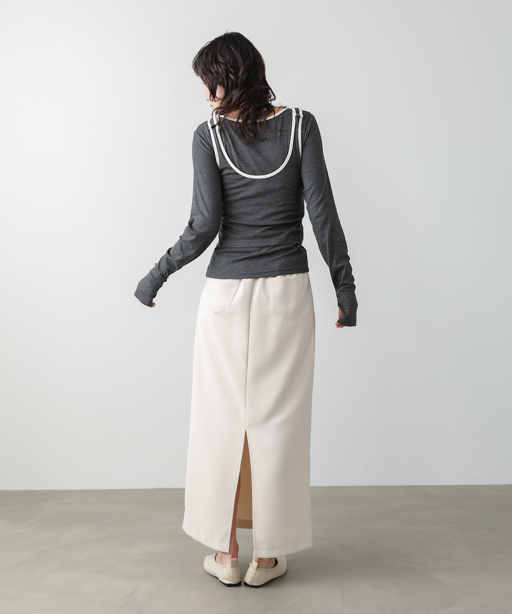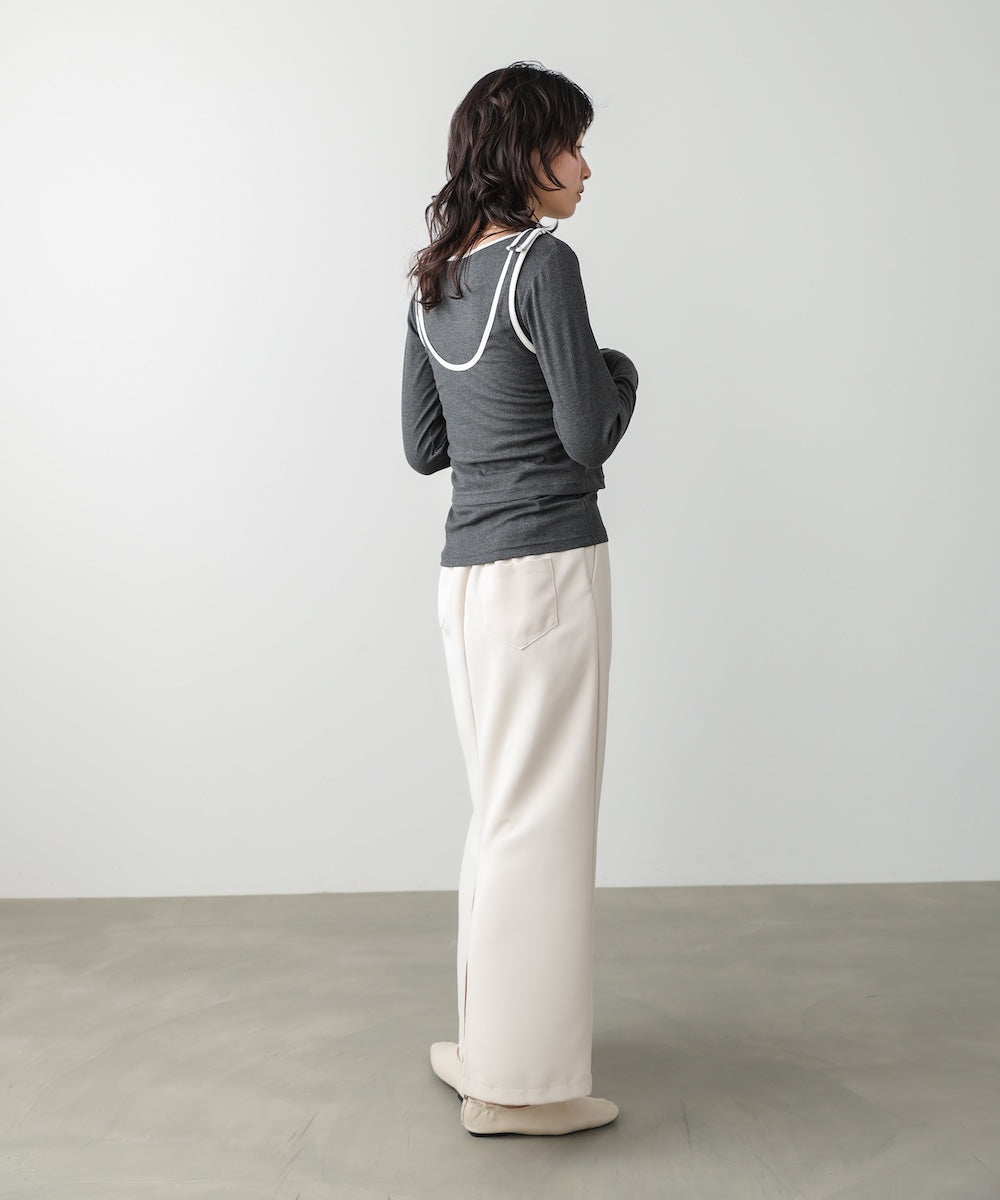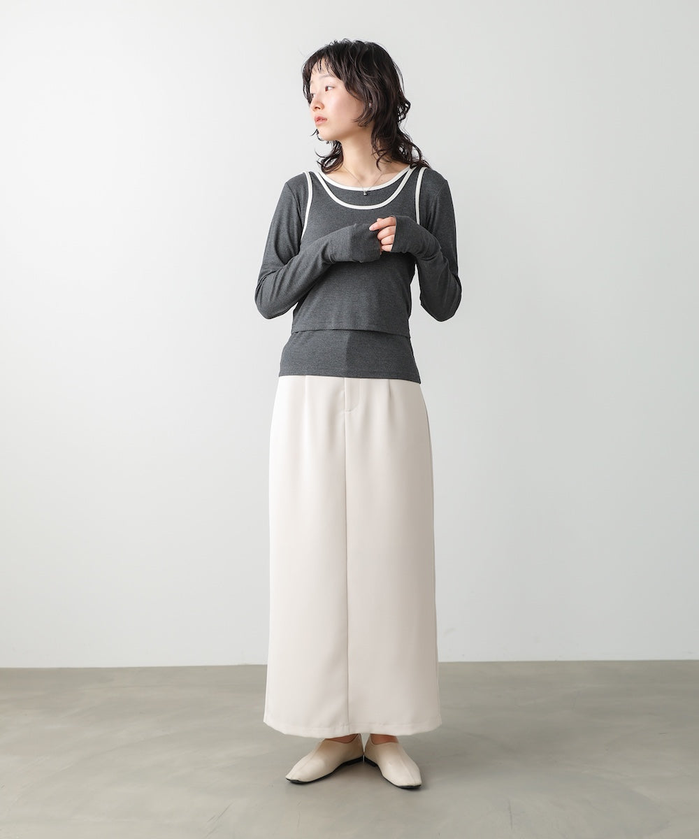 配色パイピングがさりげなく映える、レイヤードが完成するトップス&タンクのSET。シンプルながらも、首元やラインにメリハリがあり、着るだけでこなれた印象に。インナーにはサムホールがついています。タンクトップはボタン付きで長さ調節ができるため、インナーの見せ方を気分やコーデに合わせてアレンジ可能です。裾部分にはギャザーが入っていてこなれ感を演出します。アイボリー・チャコール・ブルーそれぞれに、白の配色が映え、程よく抜け感のある大人カジュアルな雰囲気を楽しめます。