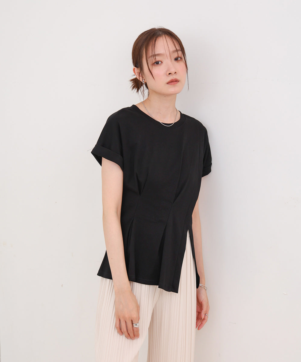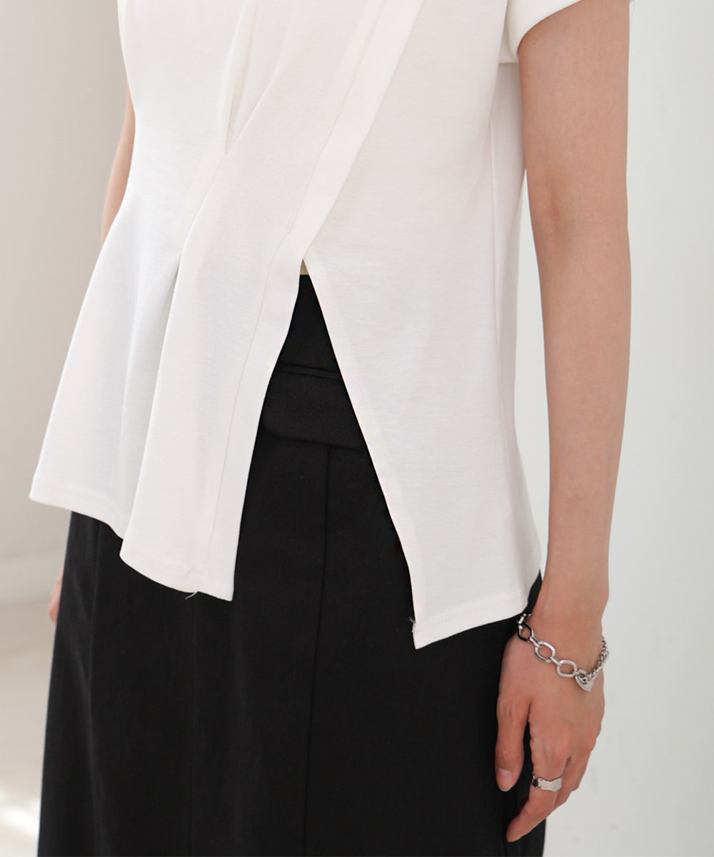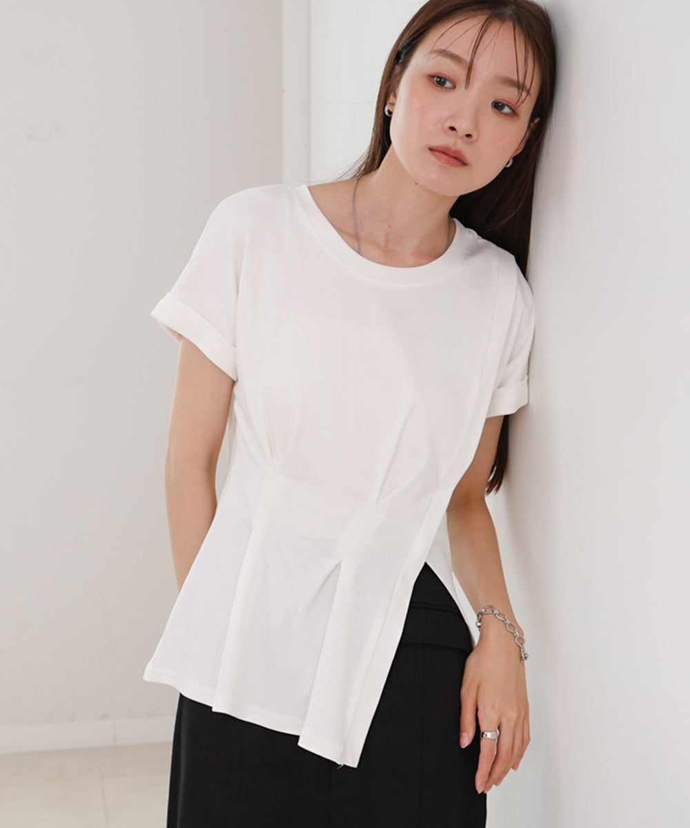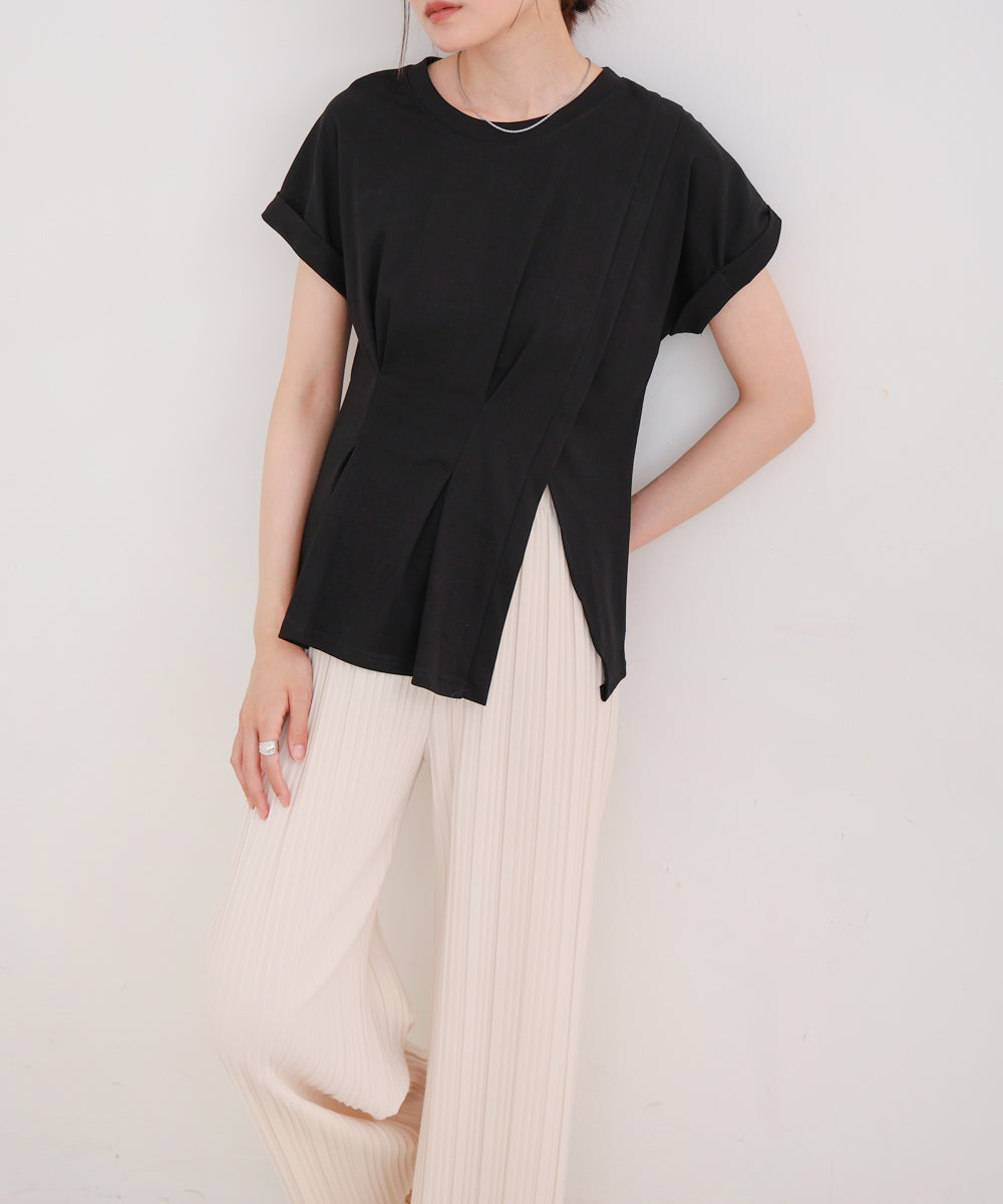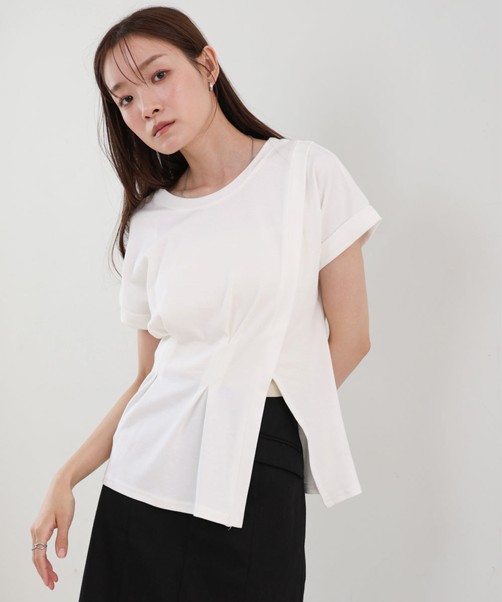 上品な抜け感と立体感を演出する、フロントタックデザインのスリット入りトップス。ミニマルな中にもディテールで差がつく、大人のためのニュアンスアイテムです。フロントに施したタックが、さりげなく縦ラインを強調し、すっきりとした印象に。柔らかな生地感が身体のラインを拾いすぎず、タック部分によってスタイルアップしてみえます。Mサイズのみのワンサイズ仕様で、ほどよいゆとりのあるシルエットに仕上げています。