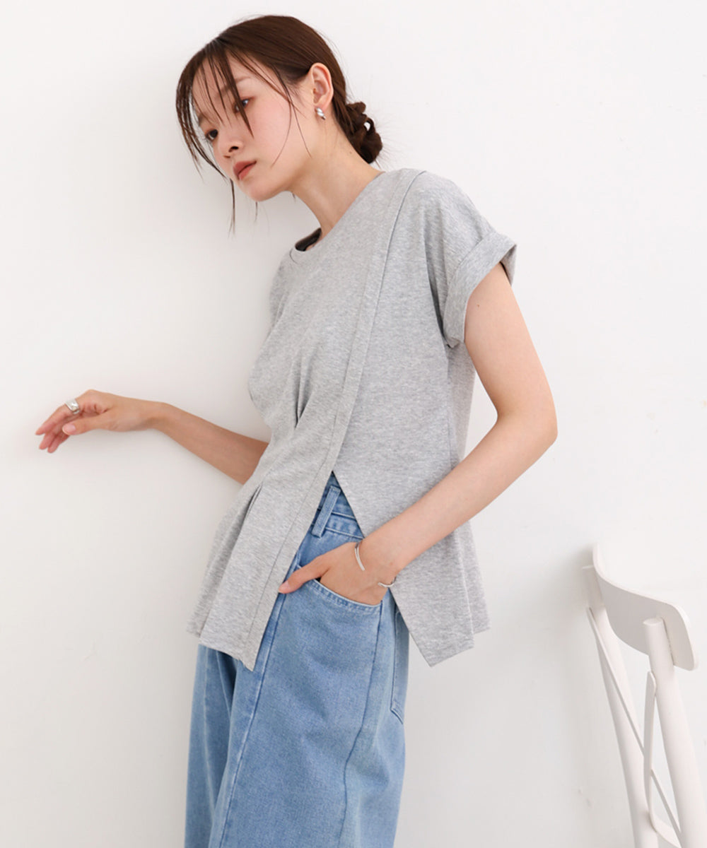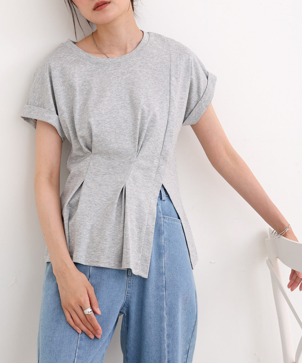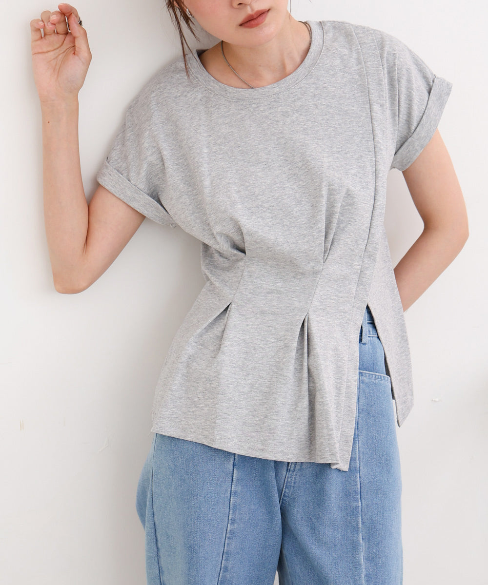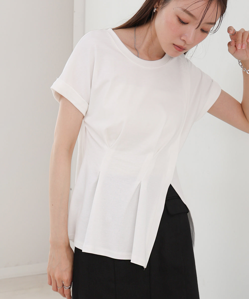 上品な抜け感と立体感を演出する、フロントタックデザインのスリット入りトップス。ミニマルな中にもディテールで差がつく、大人のためのニュアンスアイテムです。フロントに施したタックが、さりげなく縦ラインを強調し、すっきりとした印象に。柔らかな生地感が身体のラインを拾いすぎず、タック部分によってスタイルアップしてみえます。Mサイズのみのワンサイズ仕様で、ほどよいゆとりのあるシルエットに仕上げています。