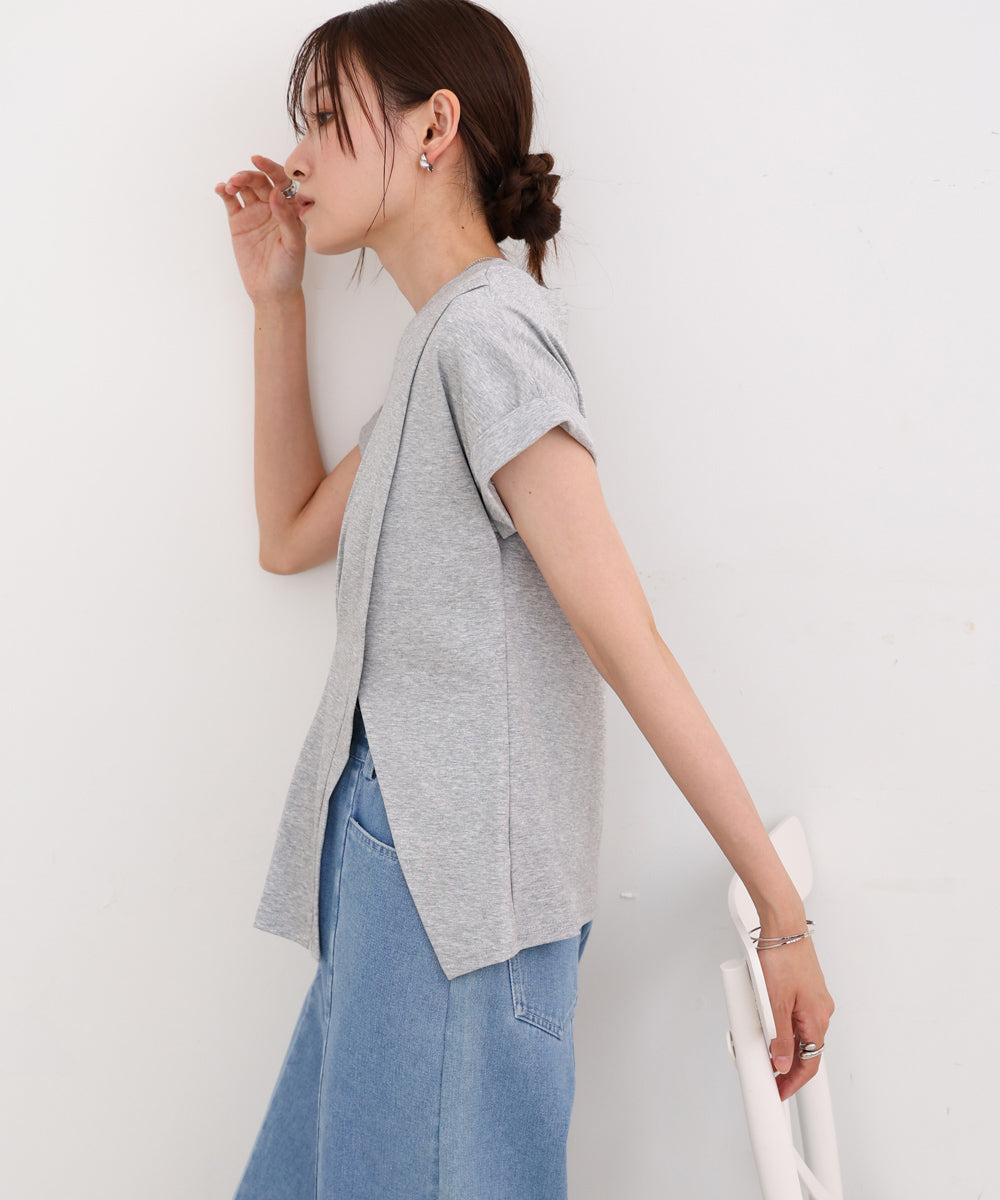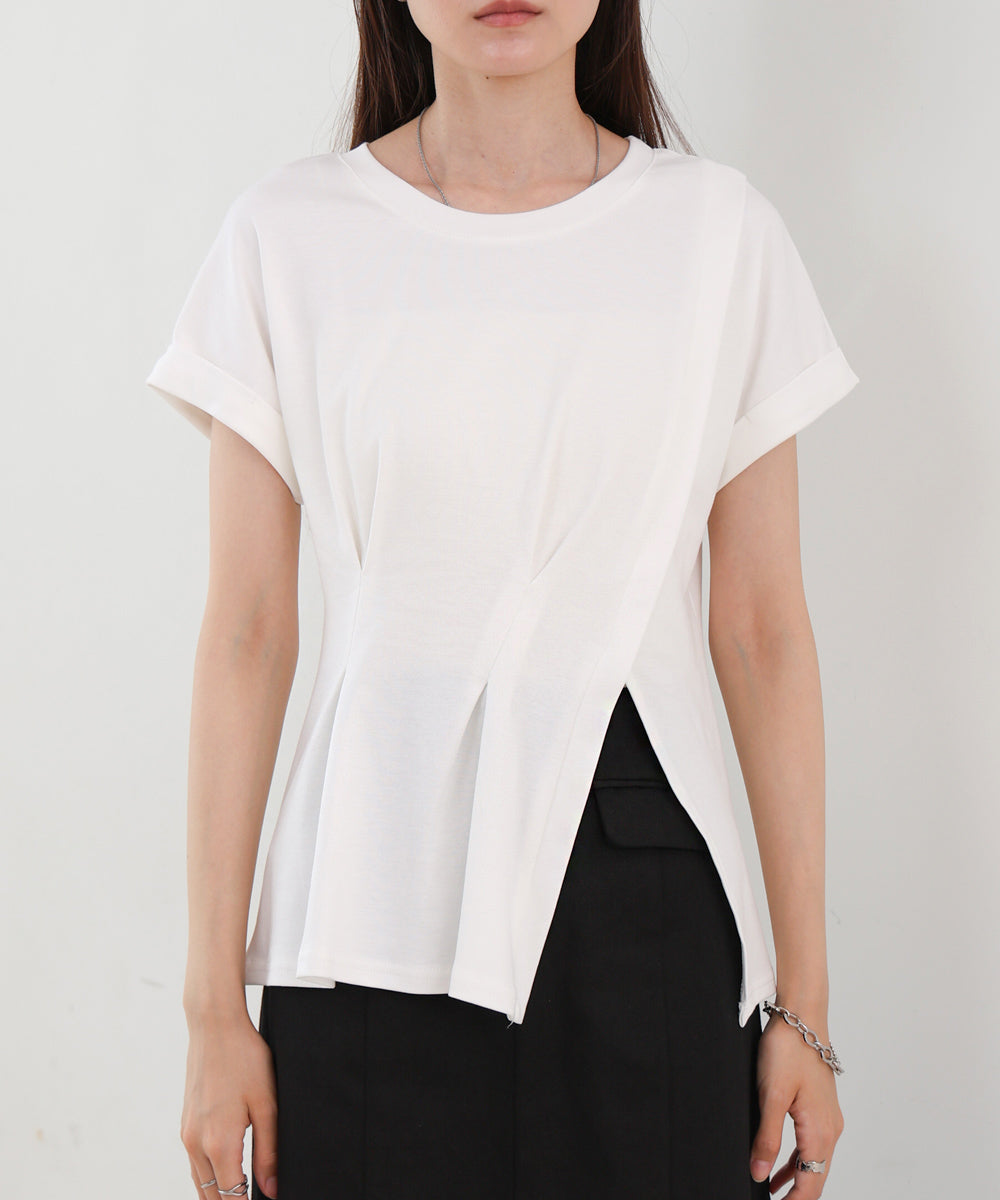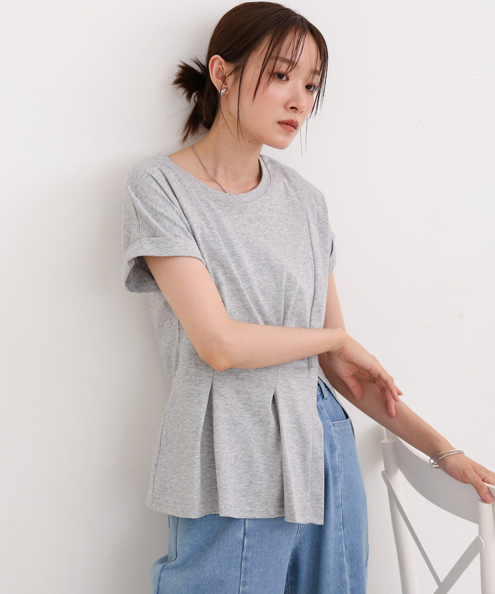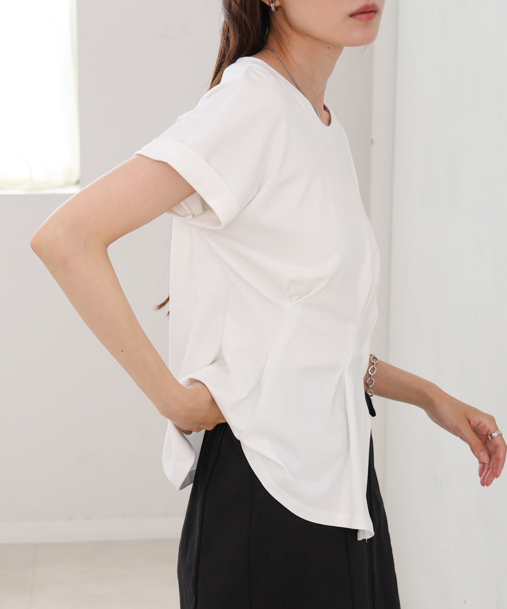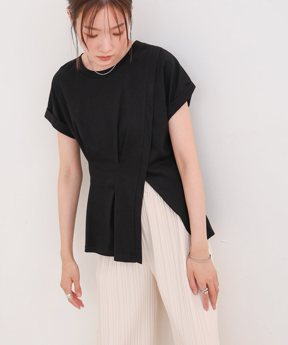 上品な抜け感と立体感を演出する、フロントタックデザインのスリット入りトップス。ミニマルな中にもディテールで差がつく、大人のためのニュアンスアイテムです。フロントに施したタックが、さりげなく縦ラインを強調し、すっきりとした印象に。柔らかな生地感が身体のラインを拾いすぎず、タック部分によってスタイルアップしてみえます。Mサイズのみのワンサイズ仕様で、ほどよいゆとりのあるシルエットに仕上げています。
