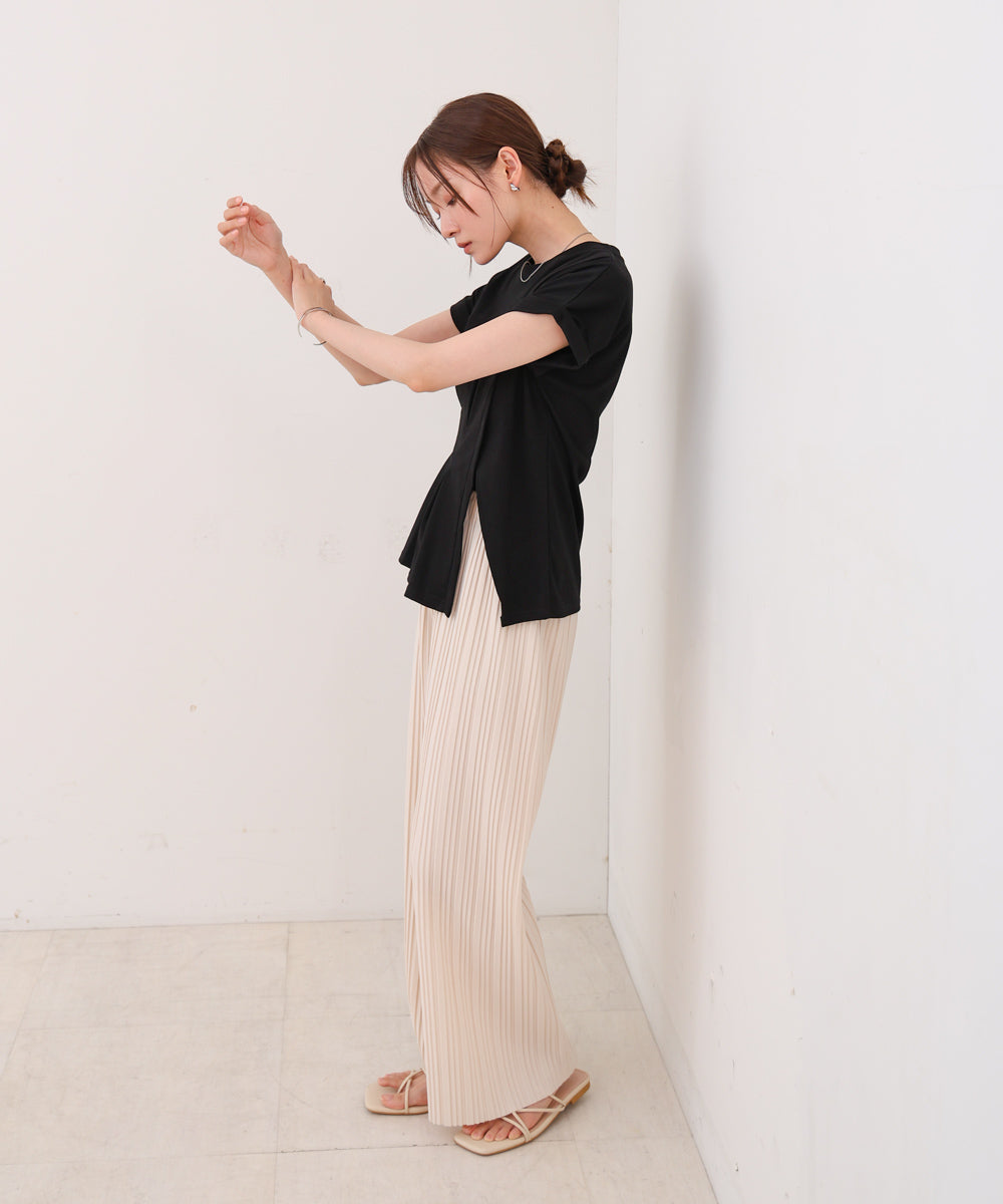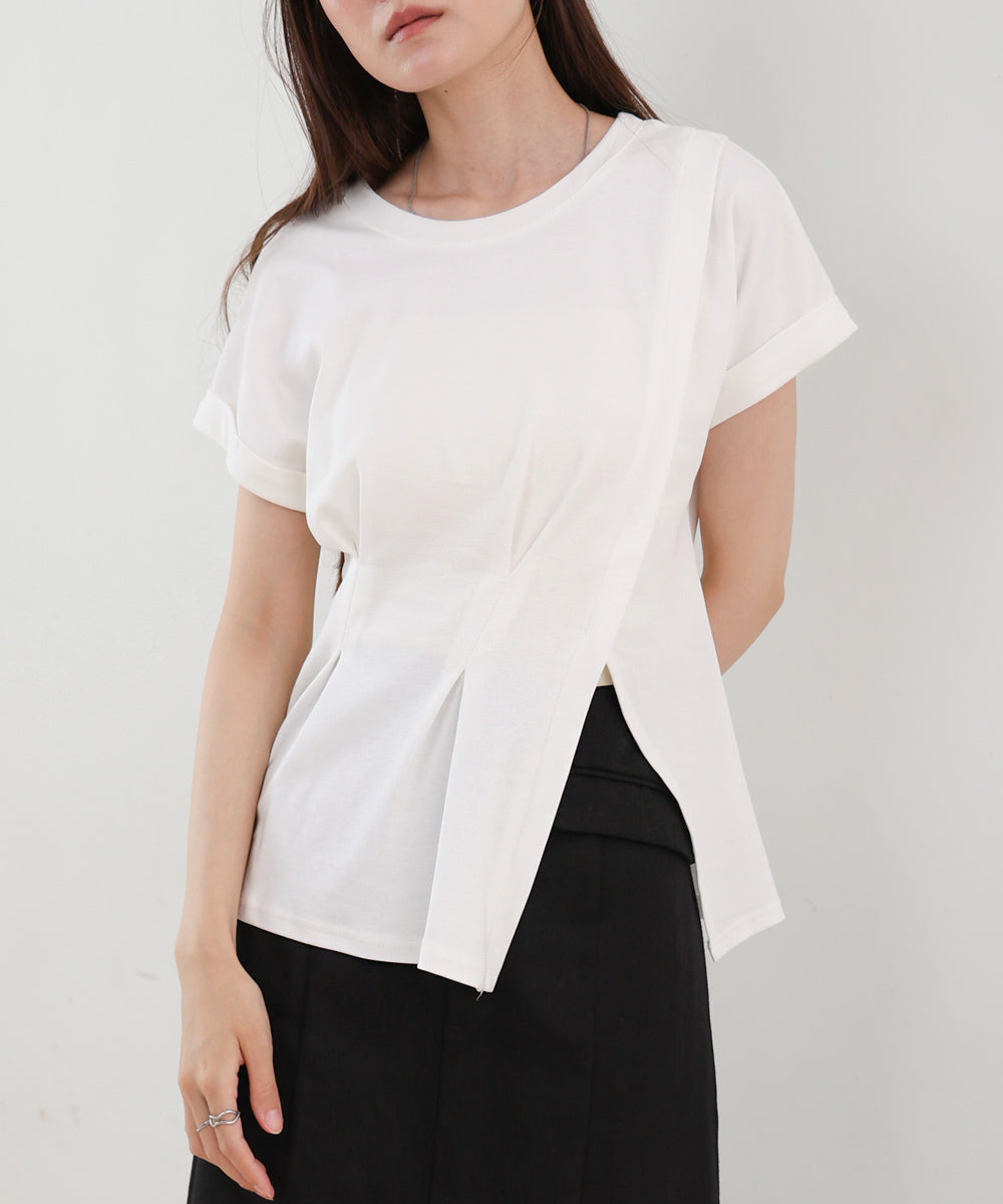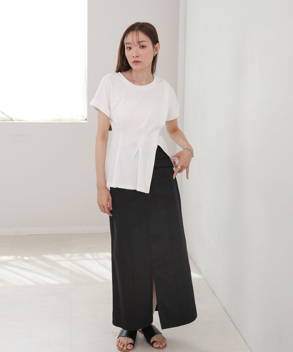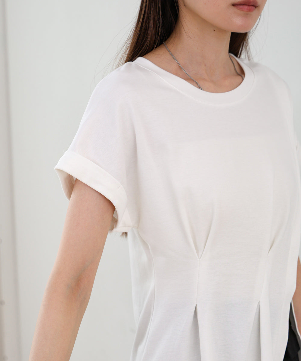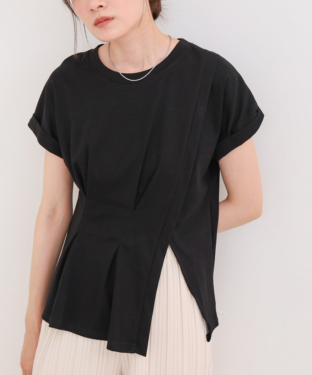 上品な抜け感と立体感を演出する、フロントタックデザインのスリット入りトップス。ミニマルな中にもディテールで差がつく、大人のためのニュアンスアイテムです。フロントに施したタックが、さりげなく縦ラインを強調し、すっきりとした印象に。柔らかな生地感が身体のラインを拾いすぎず、タック部分によってスタイルアップしてみえます。Mサイズのみのワンサイズ仕様で、ほどよいゆとりのあるシルエットに仕上げています。
