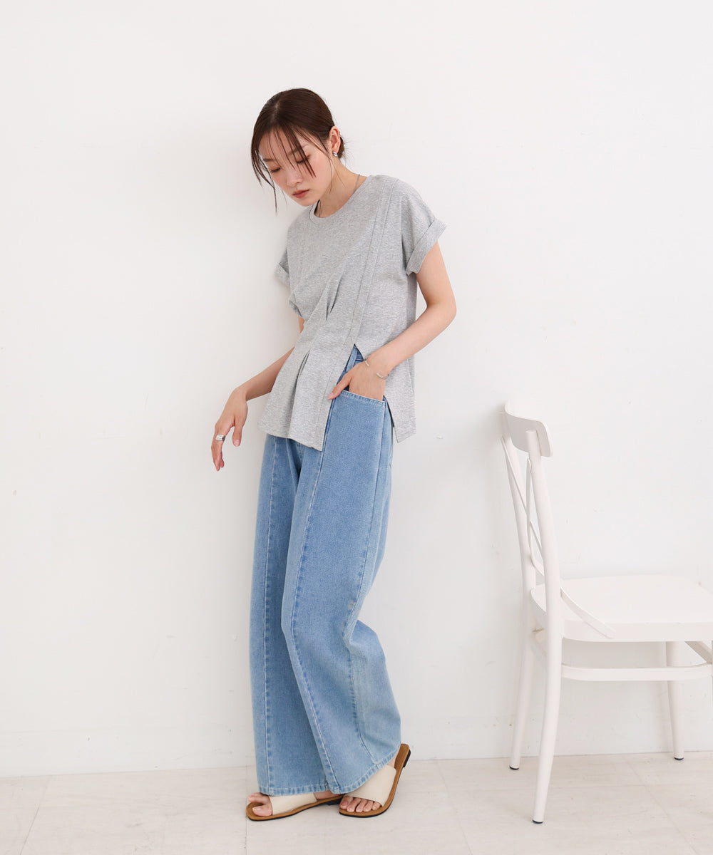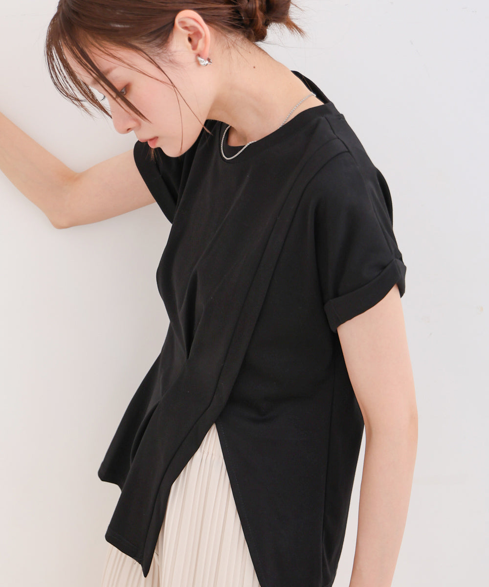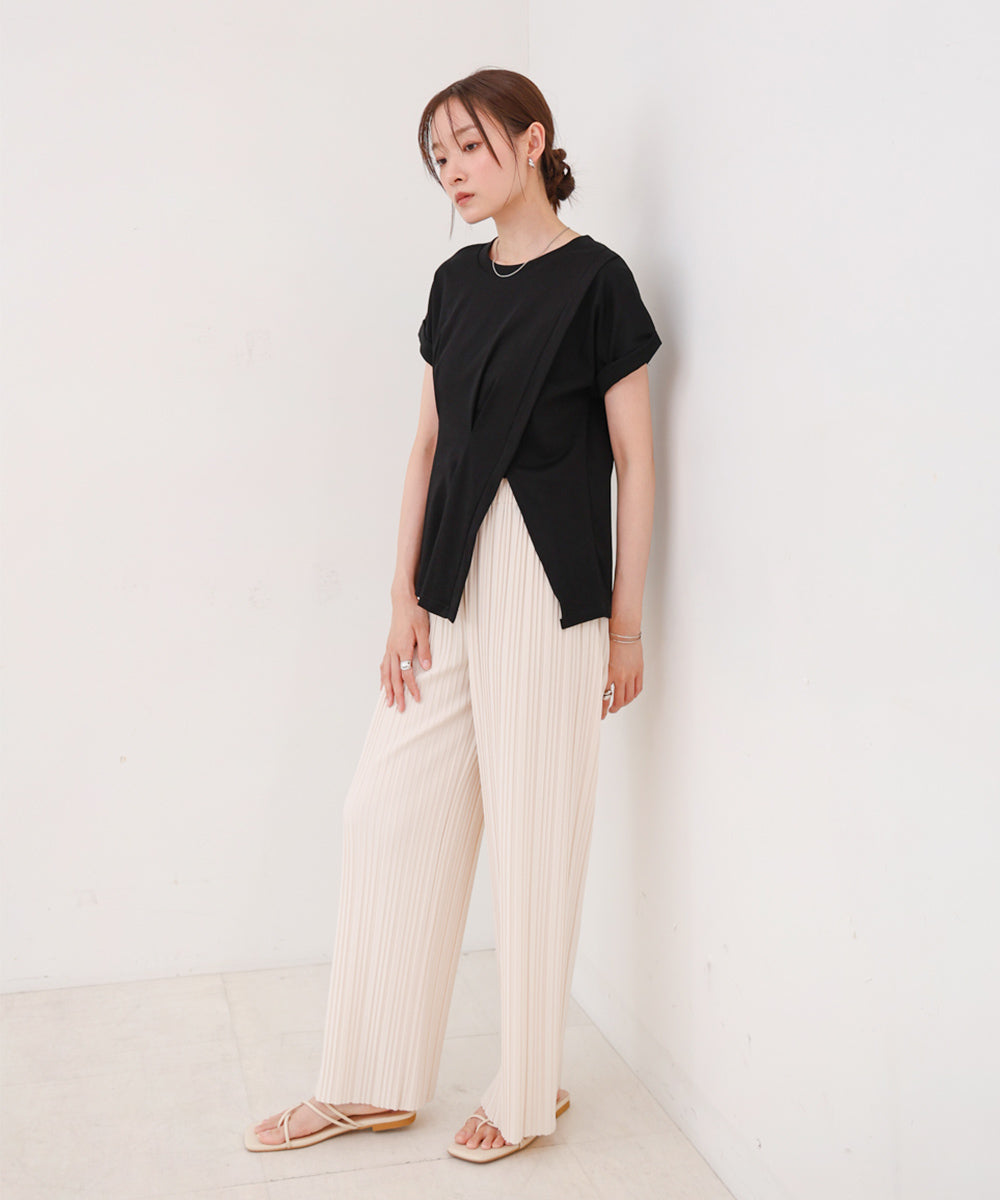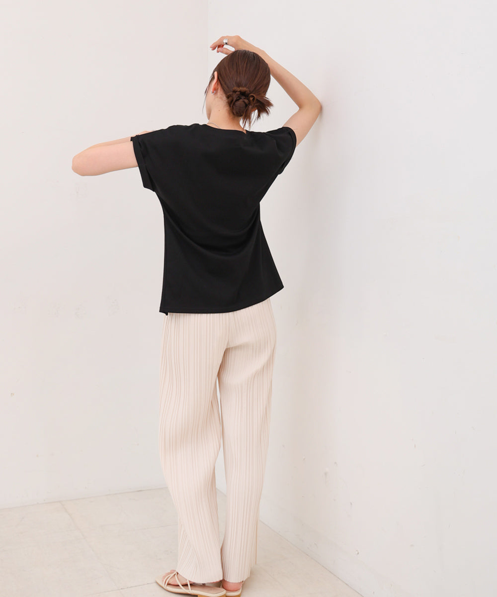 上品な抜け感と立体感を演出する、フロントタックデザインのスリット入りトップス。ミニマルな中にもディテールで差がつく、大人のためのニュアンスアイテムです。フロントに施したタックが、さりげなく縦ラインを強調し、すっきりとした印象に。柔らかな生地感が身体のラインを拾いすぎず、タック部分によってスタイルアップしてみえます。Mサイズのみのワンサイズ仕様で、ほどよいゆとりのあるシルエットに仕上げています。