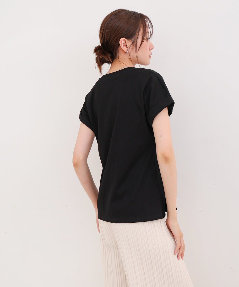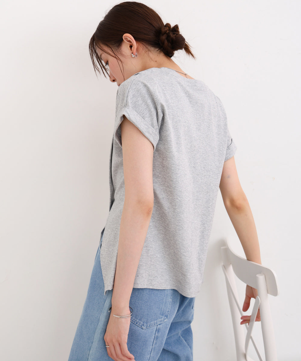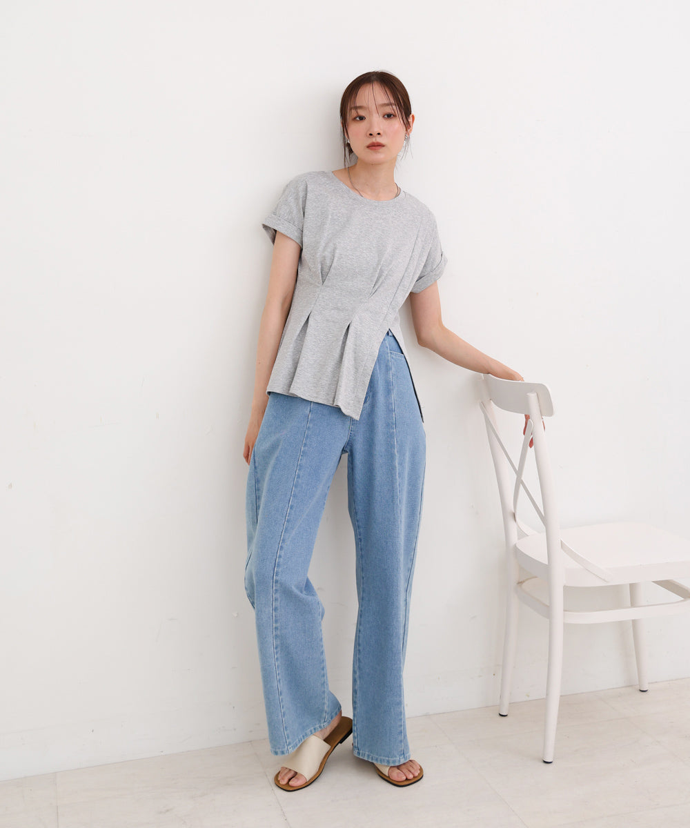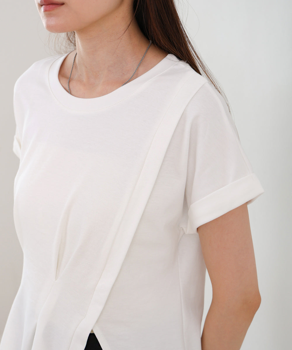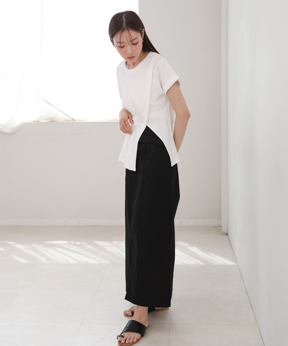 上品な抜け感と立体感を演出する、フロントタックデザインのスリット入りトップス。ミニマルな中にもディテールで差がつく、大人のためのニュアンスアイテムです。フロントに施したタックが、さりげなく縦ラインを強調し、すっきりとした印象に。柔らかな生地感が身体のラインを拾いすぎず、タック部分によってスタイルアップしてみえます。Mサイズのみのワンサイズ仕様で、ほどよいゆとりのあるシルエットに仕上げています。
