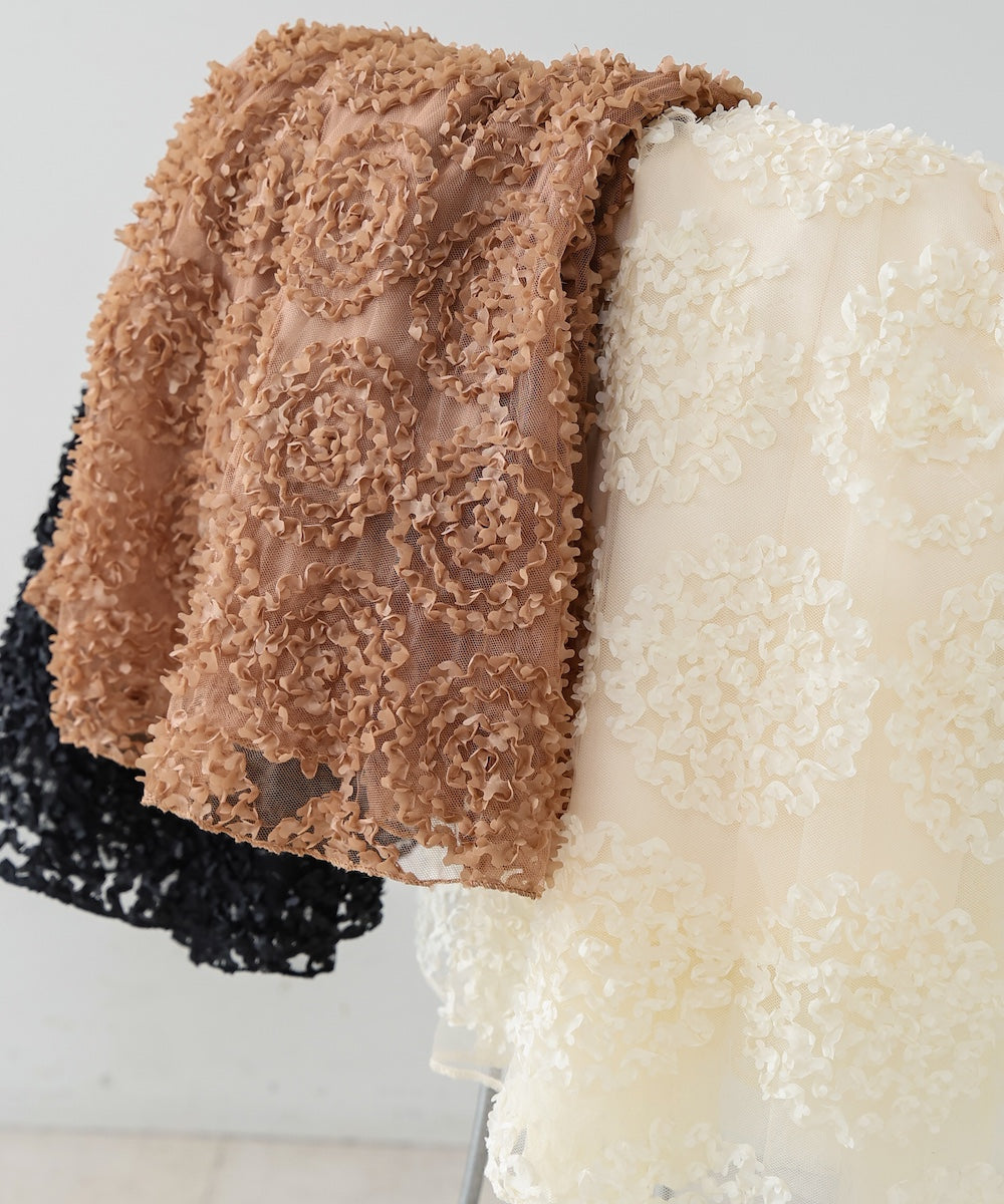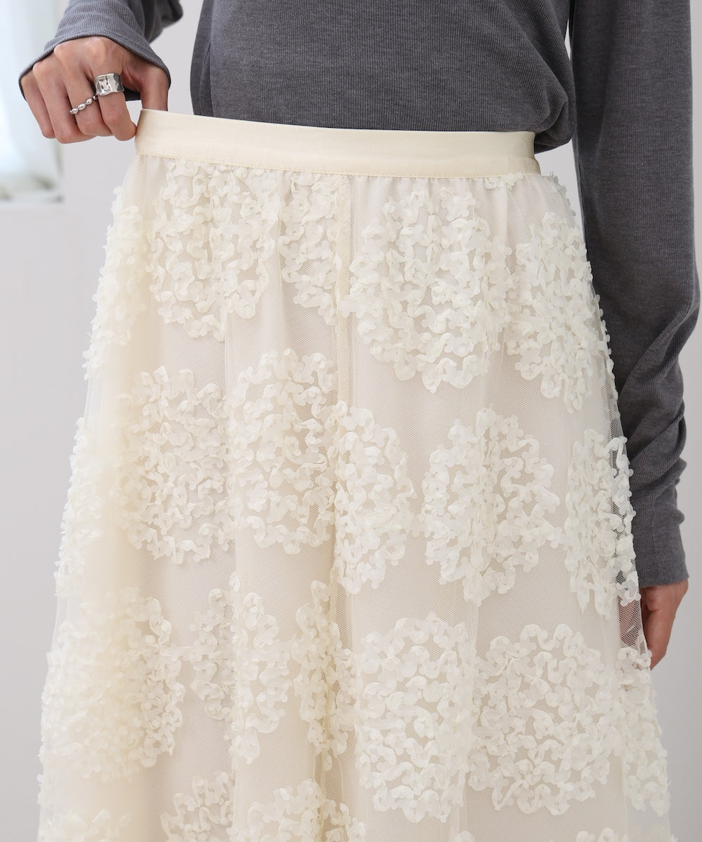 小さい丸形のレースがサークル状にちりばめられた目を惹くようなデザインスカートです。ふわっと広がるチュールが上品な雰囲気とフェミンニさの両方を醸し出してくれます。またウエスト部分がゴムになっているのでしっかりとフィットします。ブラウスと合わせてヘアスタイルもアップヘアにすると二次会や同窓会コーデにもなるのでおすすめです。