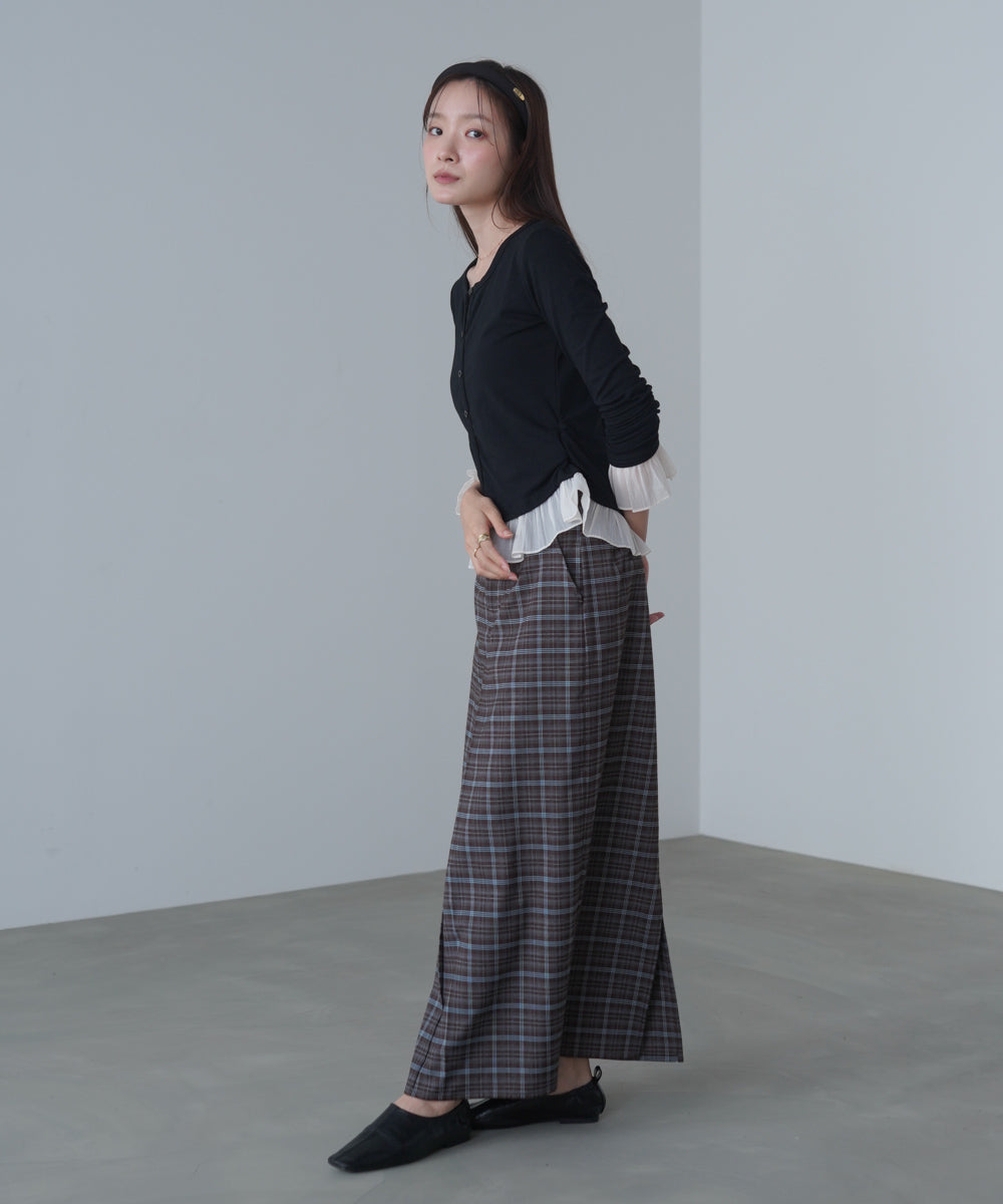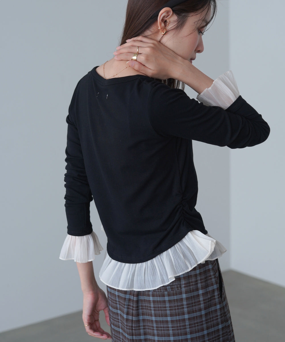なめらかで伸縮性のある着心地が特徴。柔らかく体に沿う素材感でストレスフリーに着られます。フリル部分は、軽やかで形がきれいに出やすい質感です。