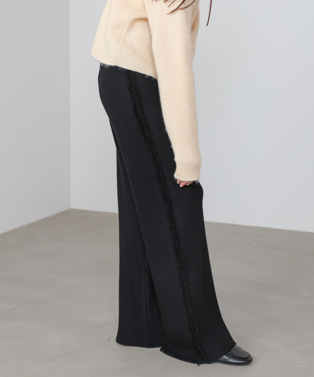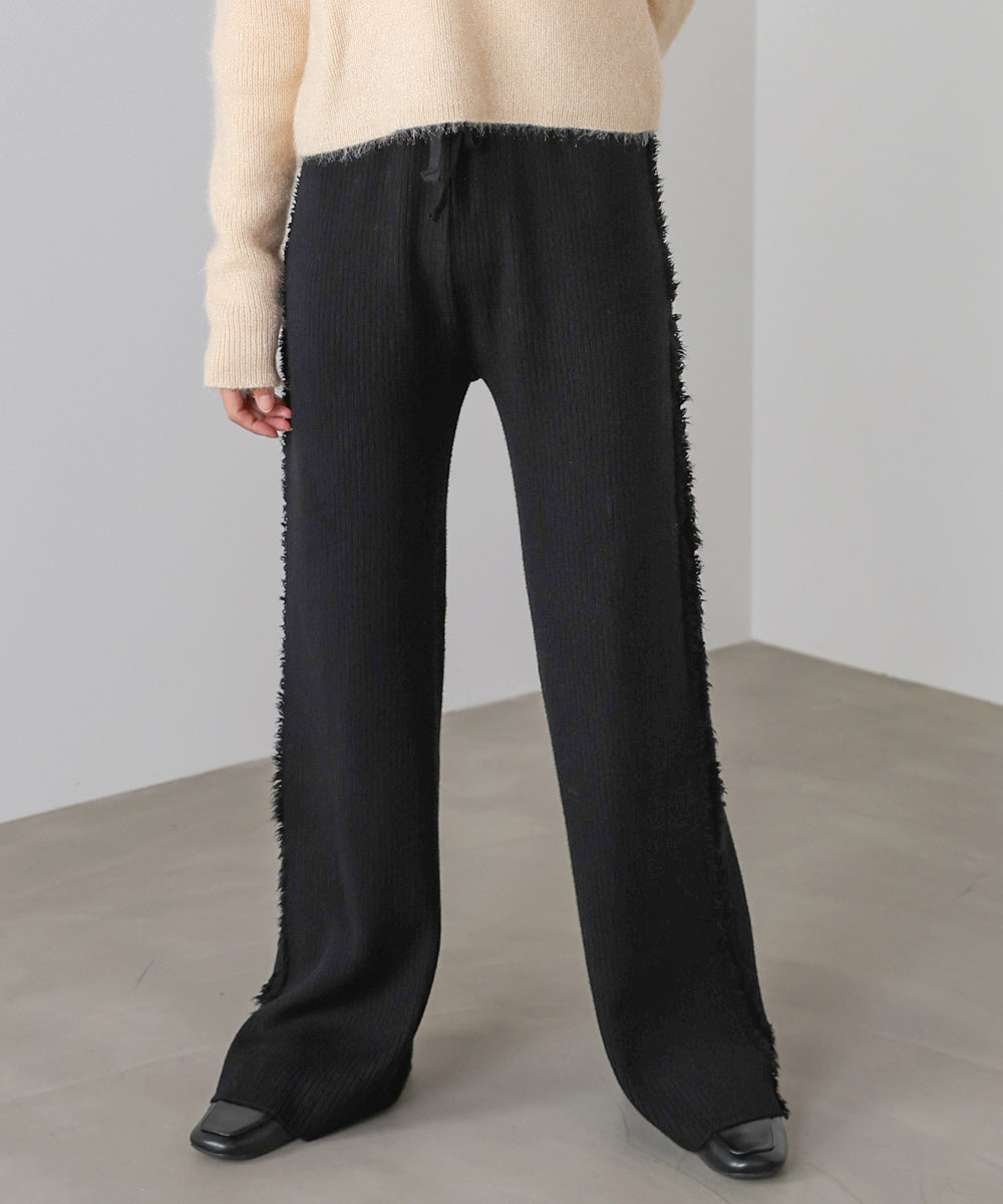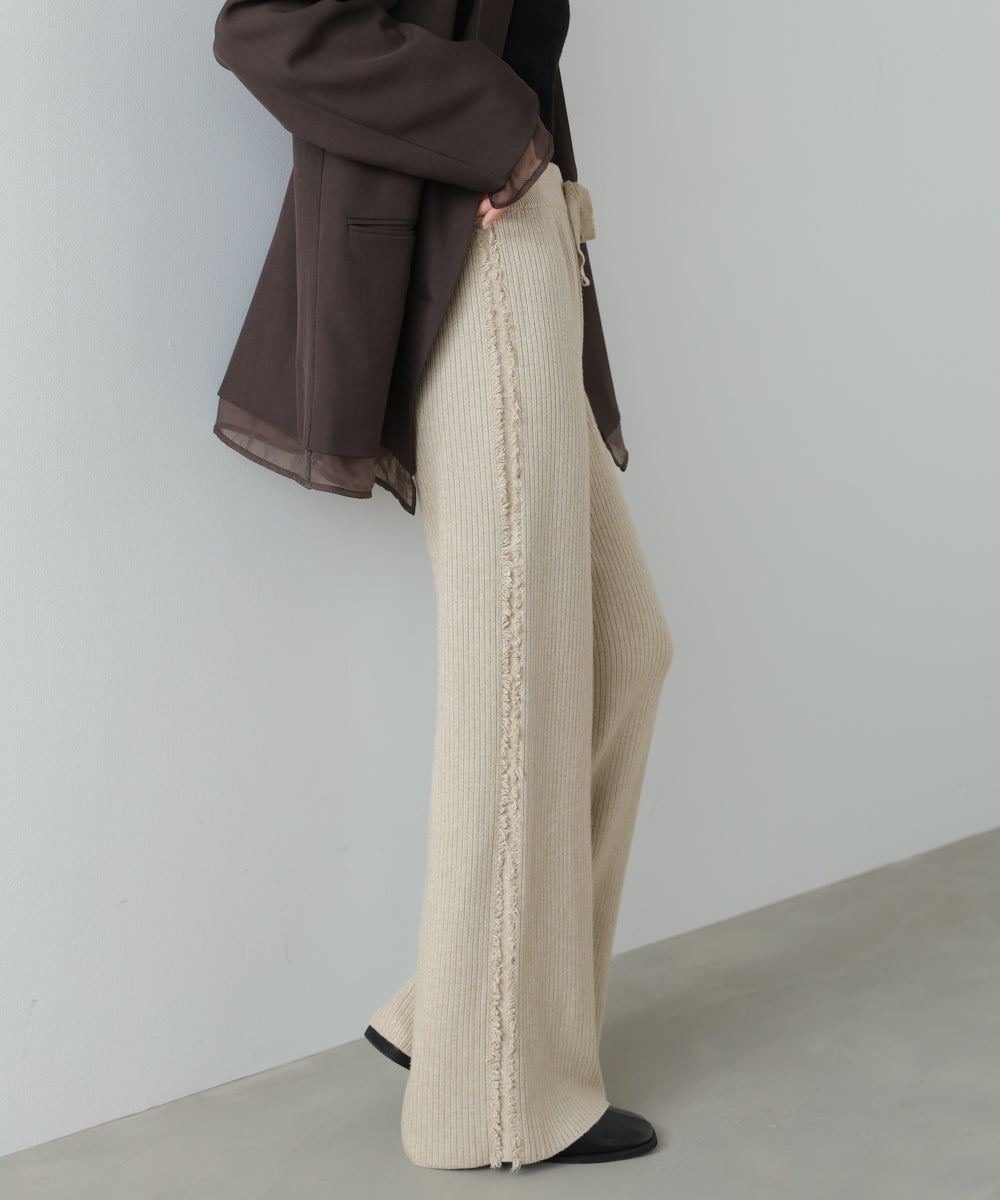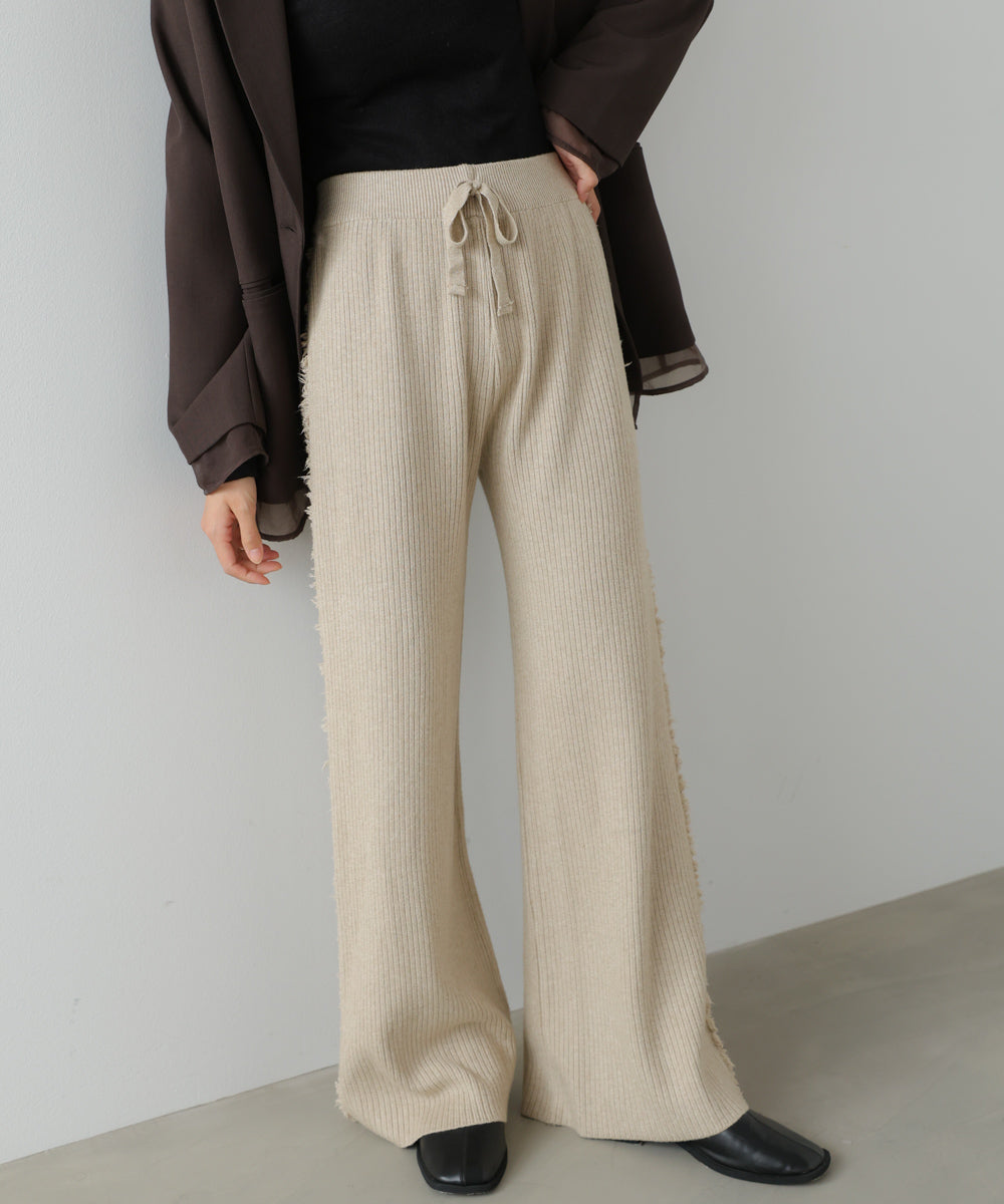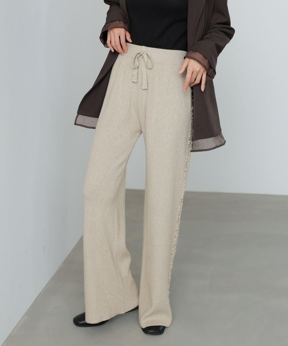 サイドに揺れるフリンジが目を惹く、デザイン性のあるニットパンツ。同色のフリンジが動くたびに表情を出し、スタイリングにさりげない個性をプラスします。フロントの飾りリボンがポイントになり、カジュアルながらもほんのり甘さのある印象に。伸びのある素材でリラクシーな履き心地ながら、きれい見えも叶う優秀アイテムです。