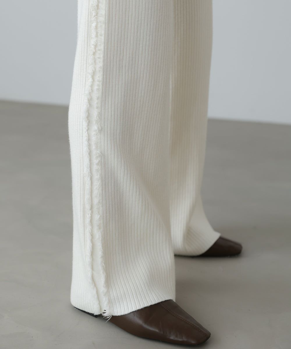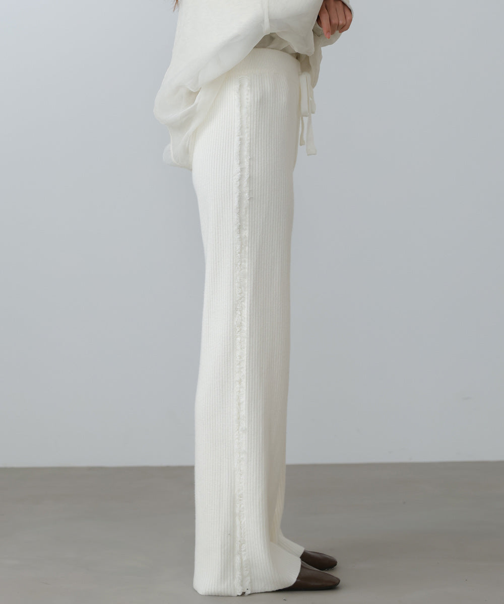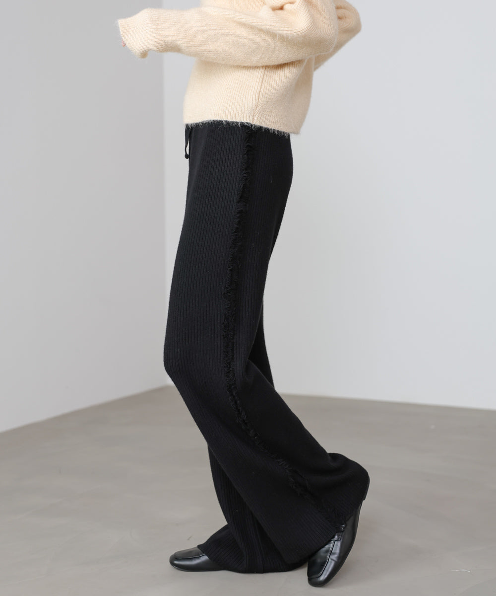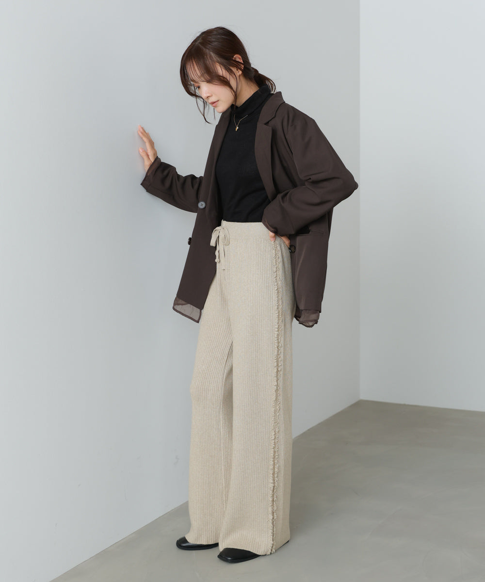 サイドに揺れるフリンジが目を惹く、デザイン性のあるニットパンツ。同色のフリンジが動くたびに表情を出し、スタイリングにさりげない個性をプラスします。フロントの飾りリボンがポイントになり、カジュアルながらもほんのり甘さのある印象に。伸びのある素材でリラクシーな履き心地ながら、きれい見えも叶う優秀アイテムです。