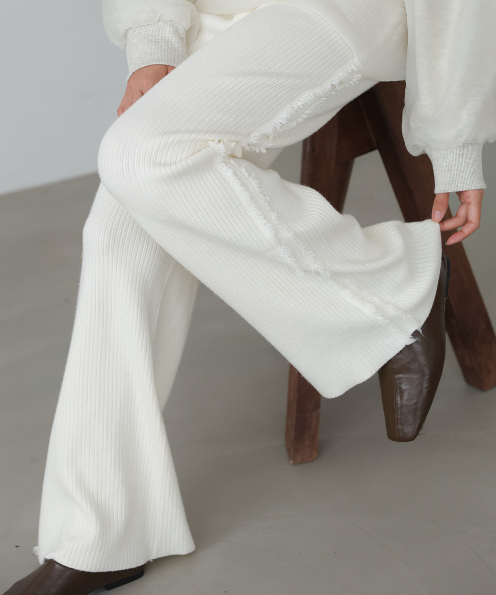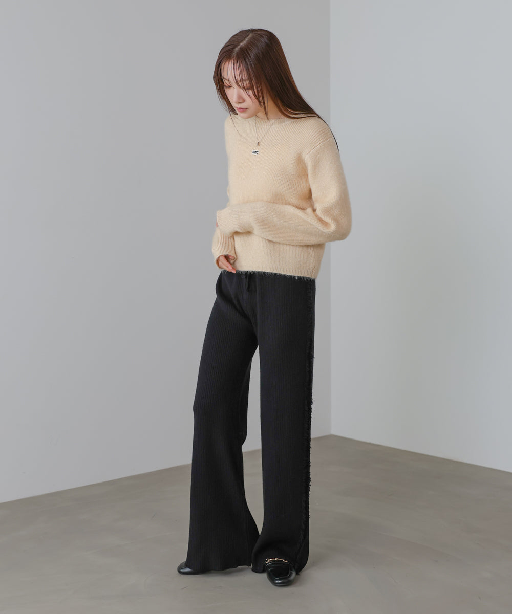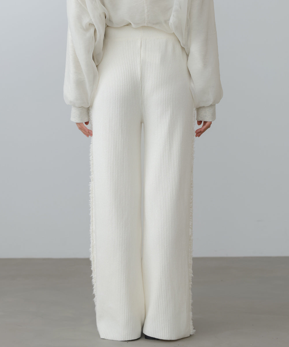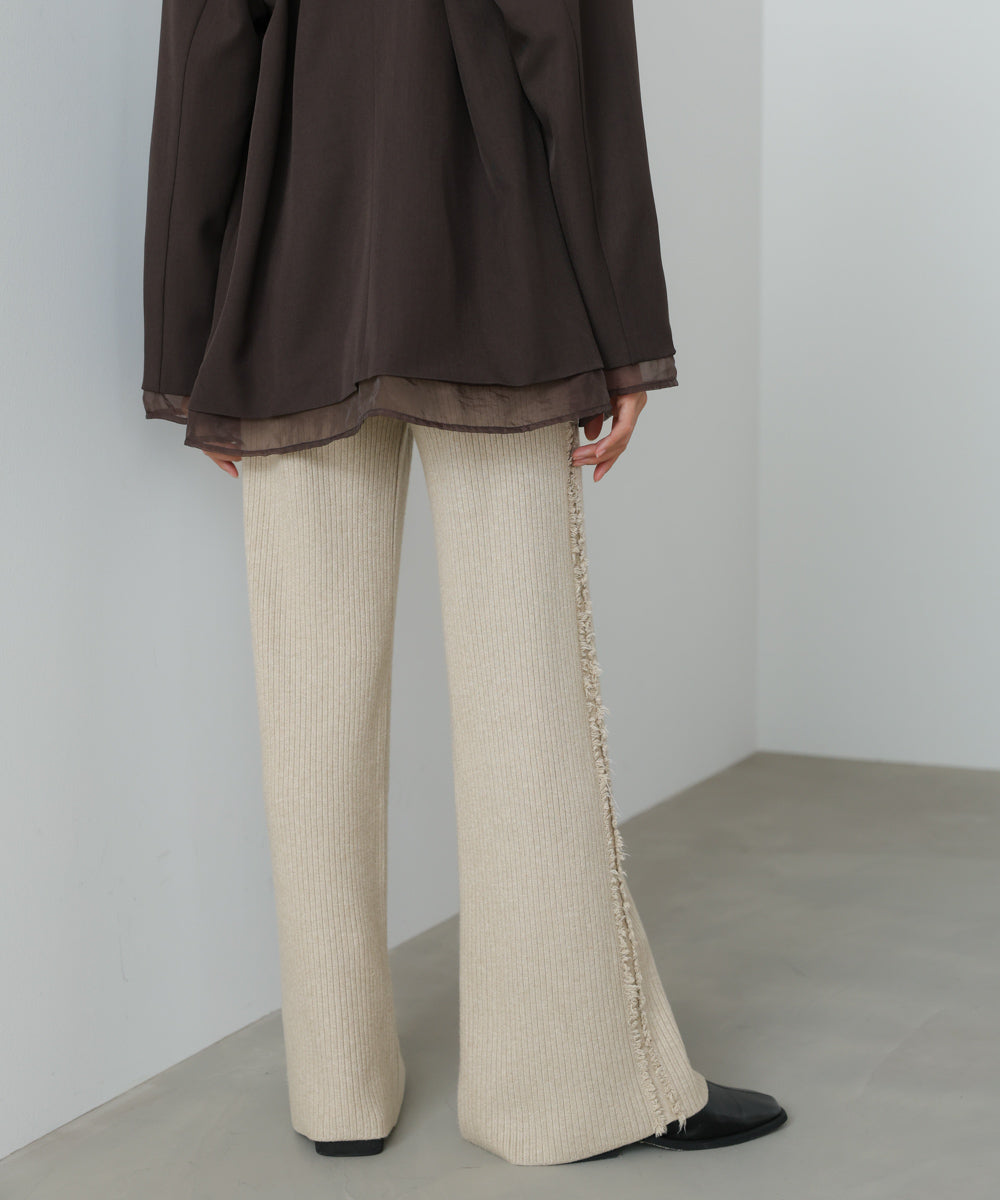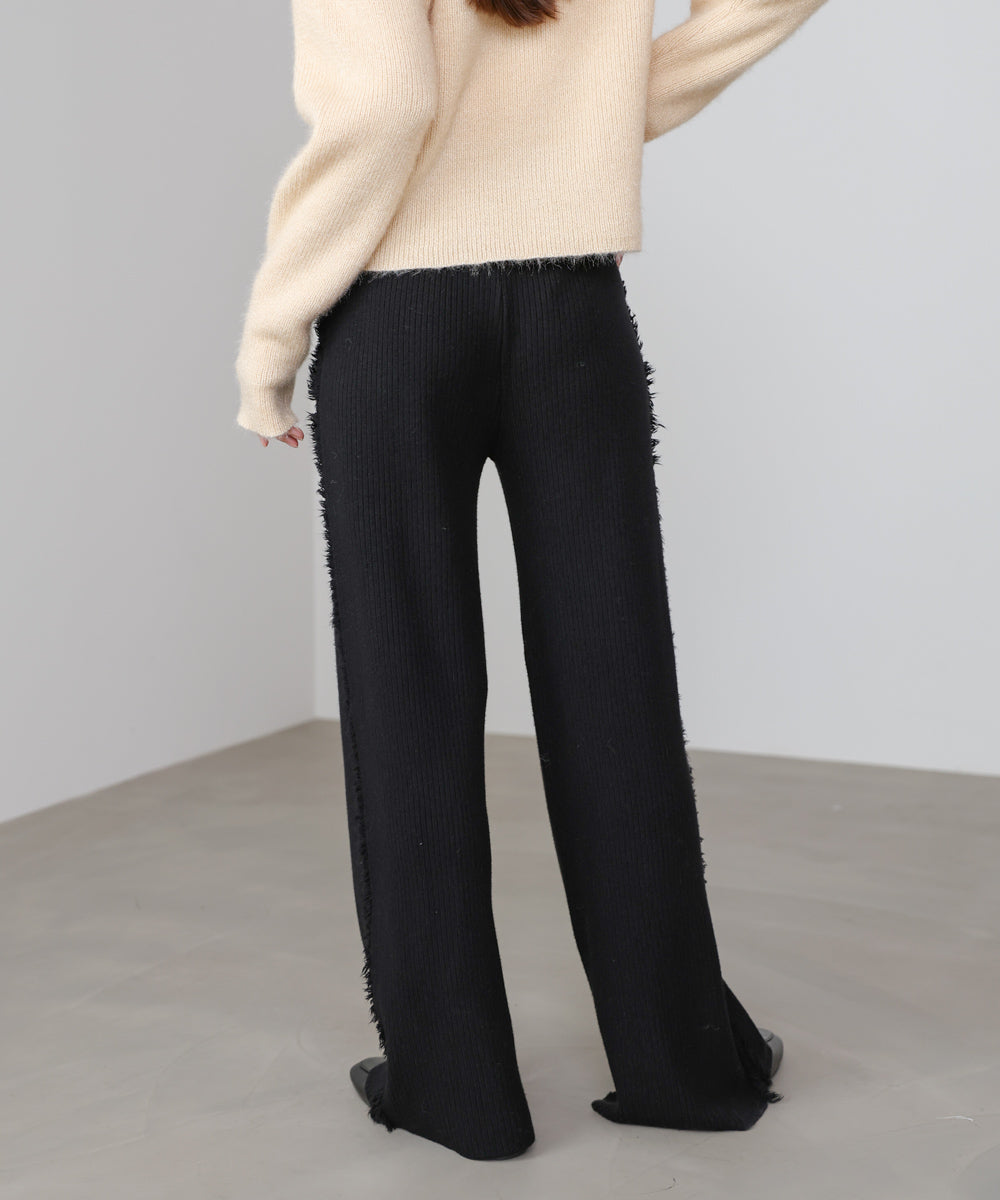 サイドに揺れるフリンジが目を惹く、デザイン性のあるニットパンツ。同色のフリンジが動くたびに表情を出し、スタイリングにさりげない個性をプラスします。フロントの飾りリボンがポイントになり、カジュアルながらもほんのり甘さのある印象に。伸びのある素材でリラクシーな履き心地ながら、きれい見えも叶う優秀アイテムです。
