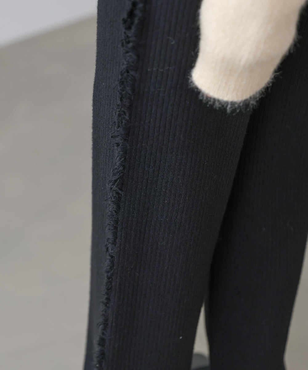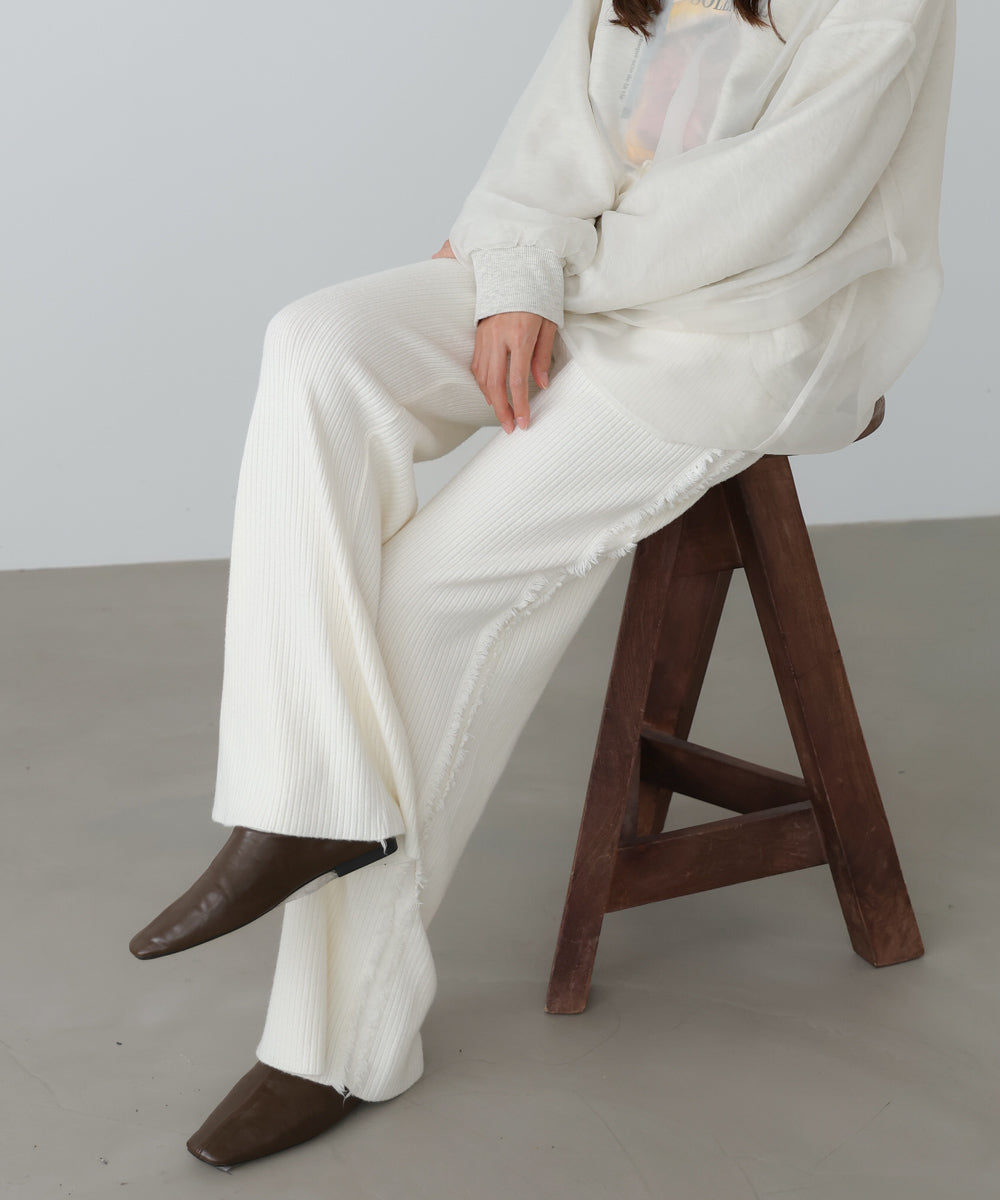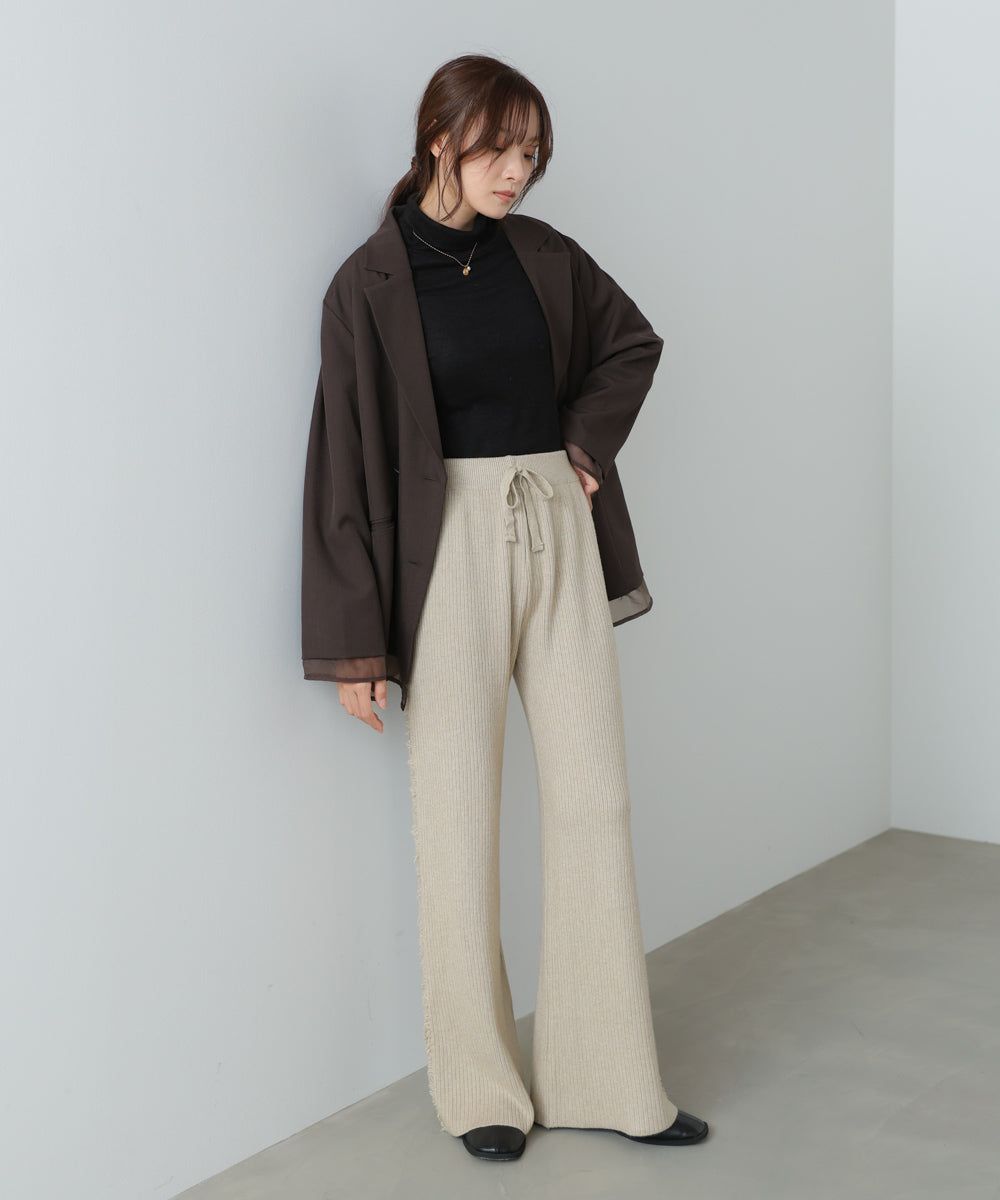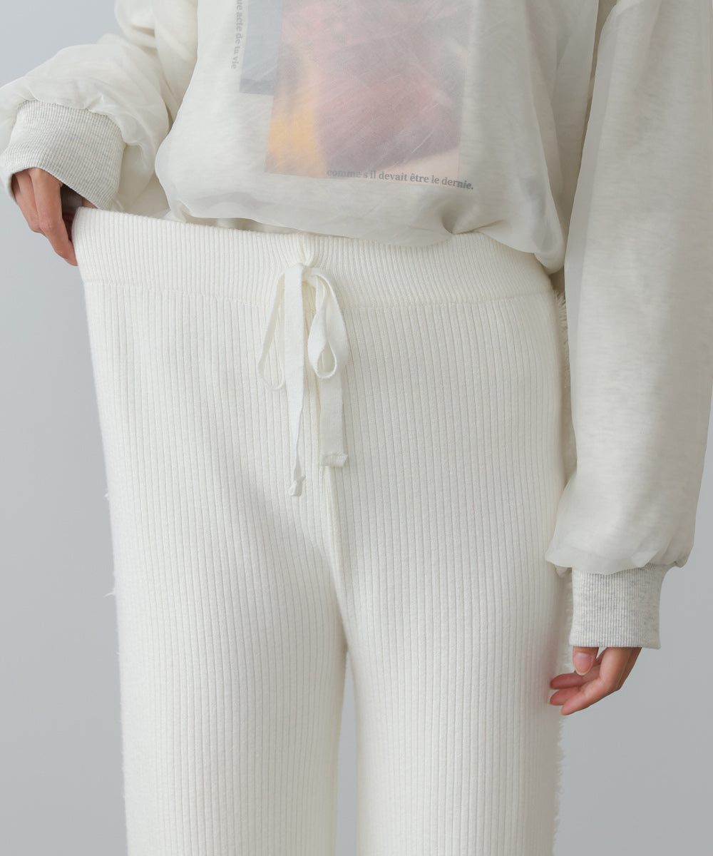 サイドに揺れるフリンジが目を惹く、デザイン性のあるニットパンツ。同色のフリンジが動くたびに表情を出し、スタイリングにさりげない個性をプラスします。フロントの飾りリボンがポイントになり、カジュアルながらもほんのり甘さのある印象に。伸びのある素材でリラクシーな履き心地ながら、きれい見えも叶う優秀アイテムです。