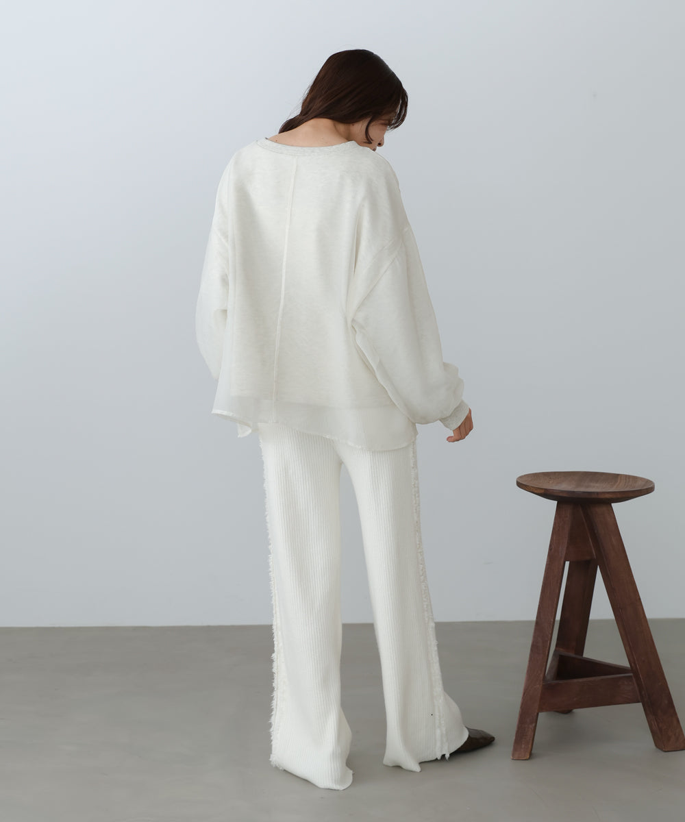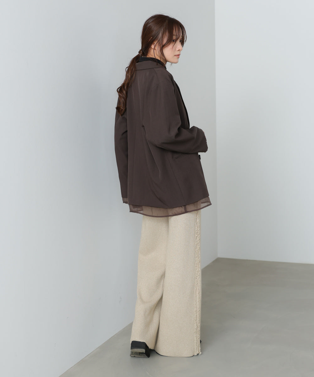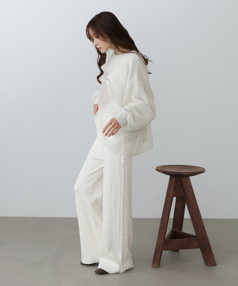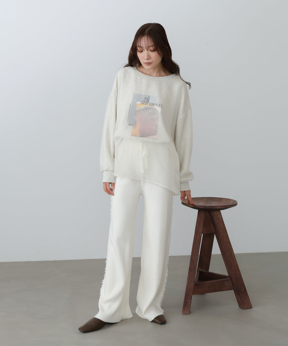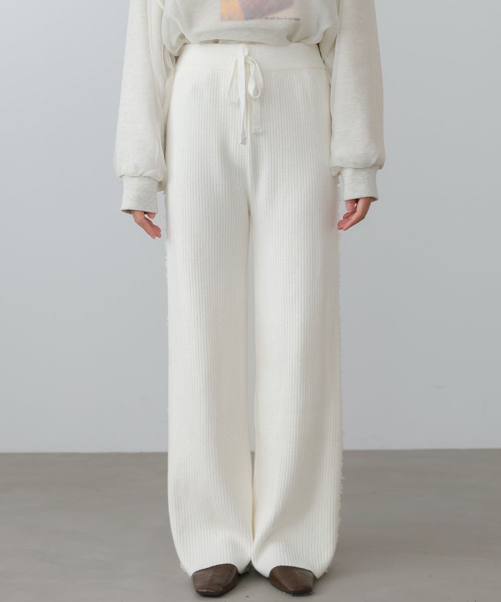 サイドに揺れるフリンジが目を惹く、デザイン性のあるニットパンツ。同色のフリンジが動くたびに表情を出し、スタイリングにさりげない個性をプラスします。フロントの飾りリボンがポイントになり、カジュアルながらもほんのり甘さのある印象に。伸びのある素材でリラクシーな履き心地ながら、きれい見えも叶う優秀アイテムです。