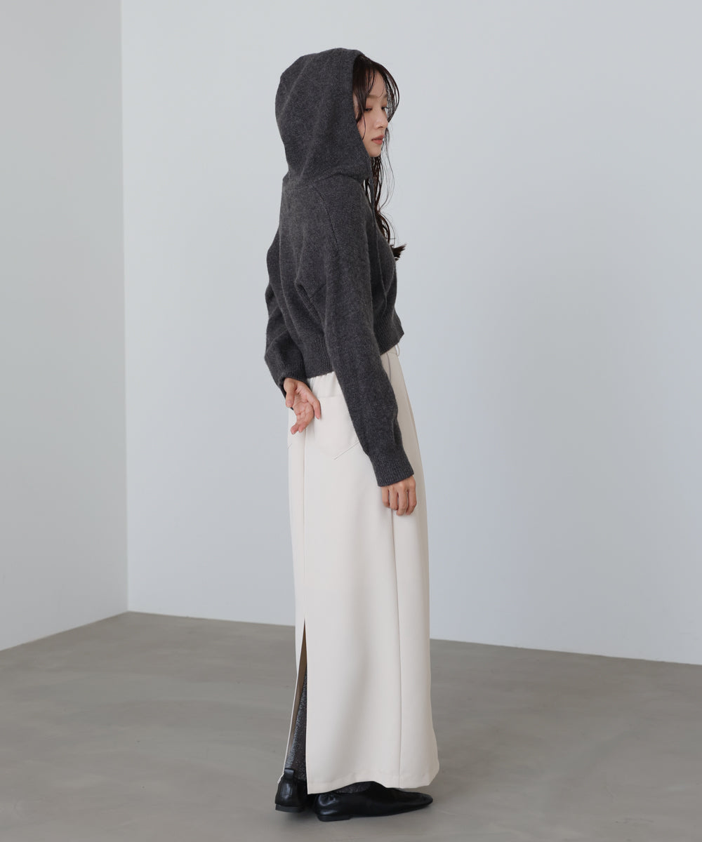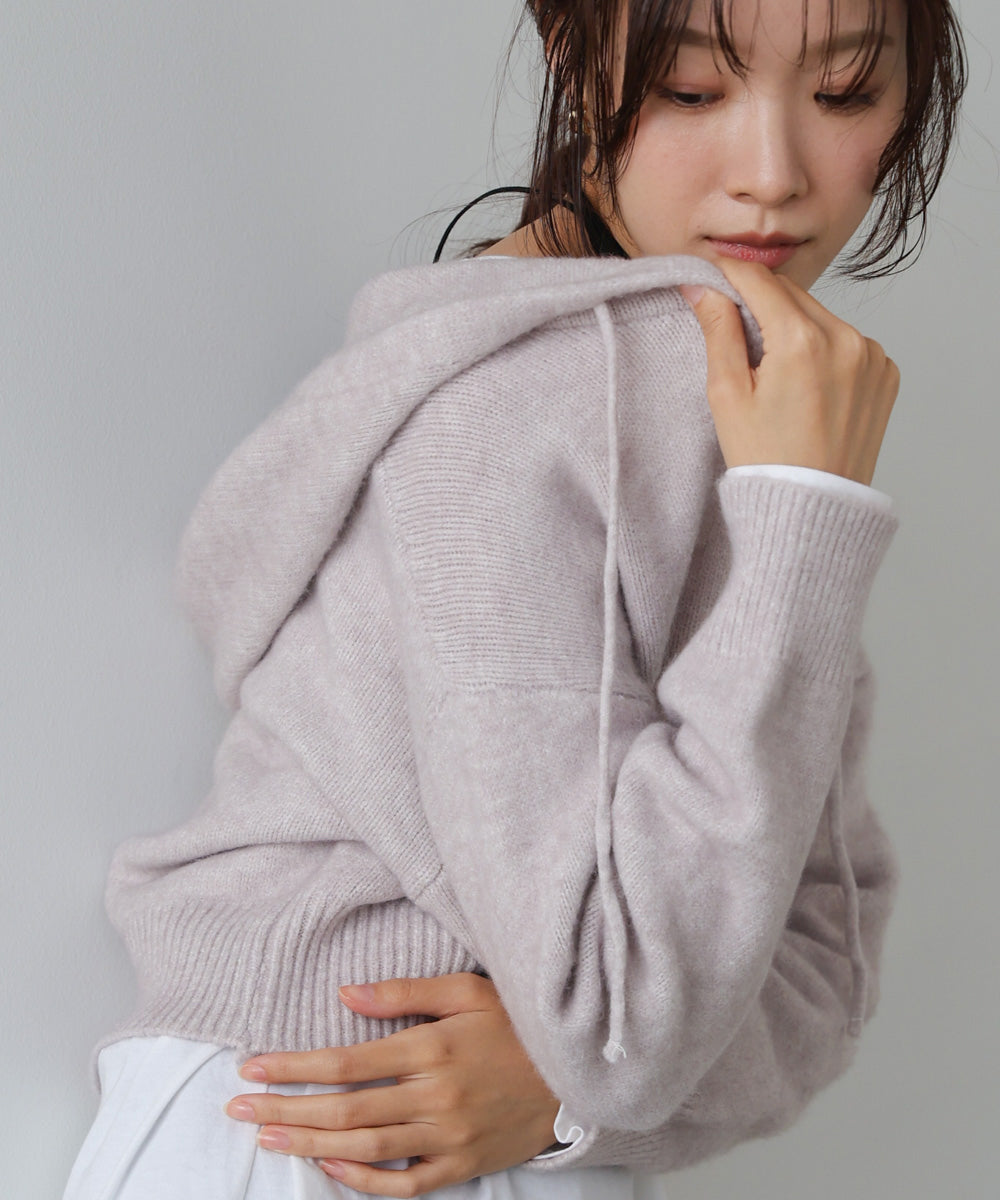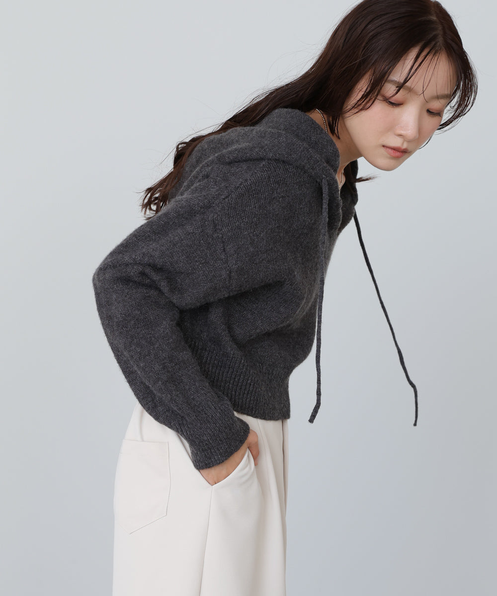 コンパクトなシルエットが今っぽい、ショート丈のフーディーニット。カジュアルなデザインながらも、やわらかな質感と程よいボリューム感で大人っぽく仕上がる一枚です。フードの紐をきゅっと絞れば顔まわりに抜け感が生まれ、ゆるめればリラックスムードに。休日のおでかけにも、通勤後のオフスタイルにもぴったりなこなれ見えアイテムです。