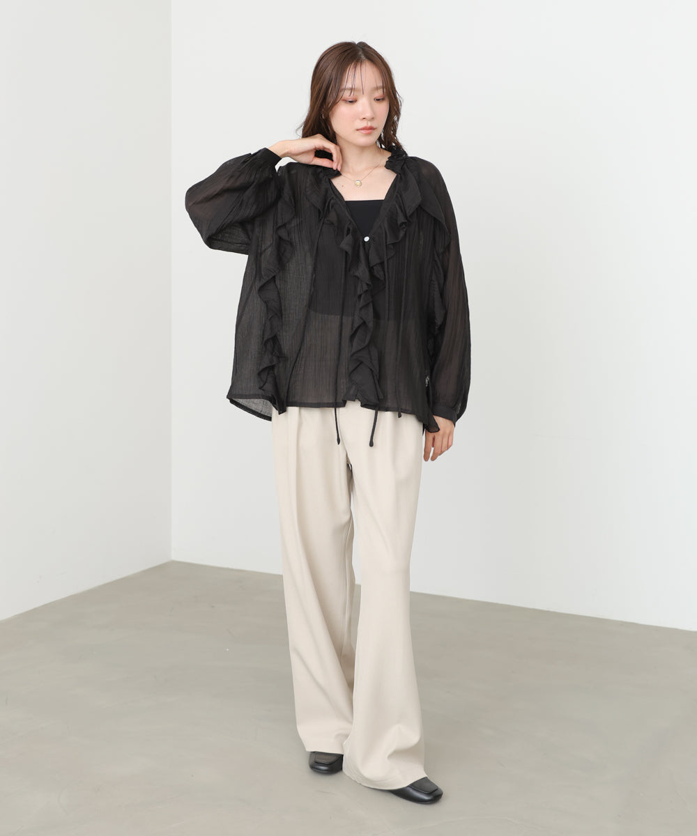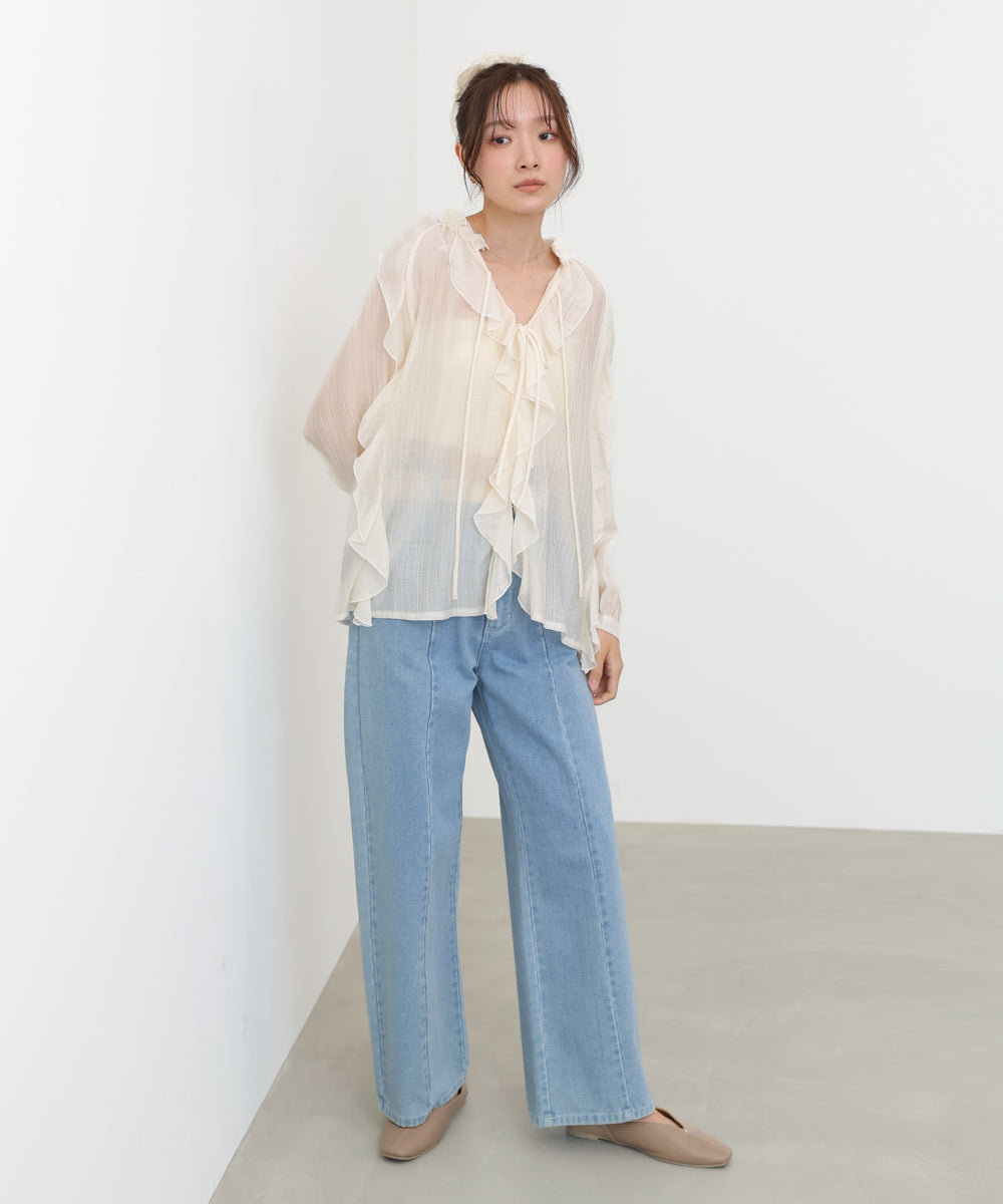 きれいめスラックスと合わせて大人のフェミニンオフィススタイルに。デニムと合わせれば、フリルの甘さが程よく引き立つ抜け感コーデに仕上がります。キャミワンピースやジャンスカのインナーとしても◎シアー感を活かしたレイヤードスタイルもおすすめです。