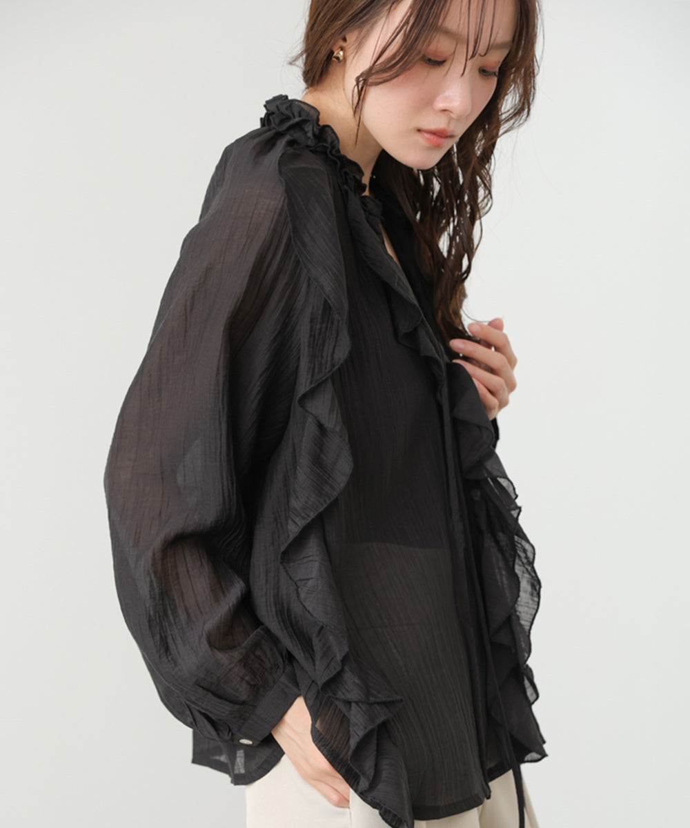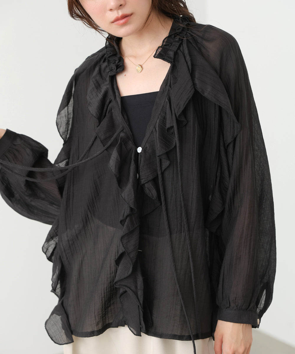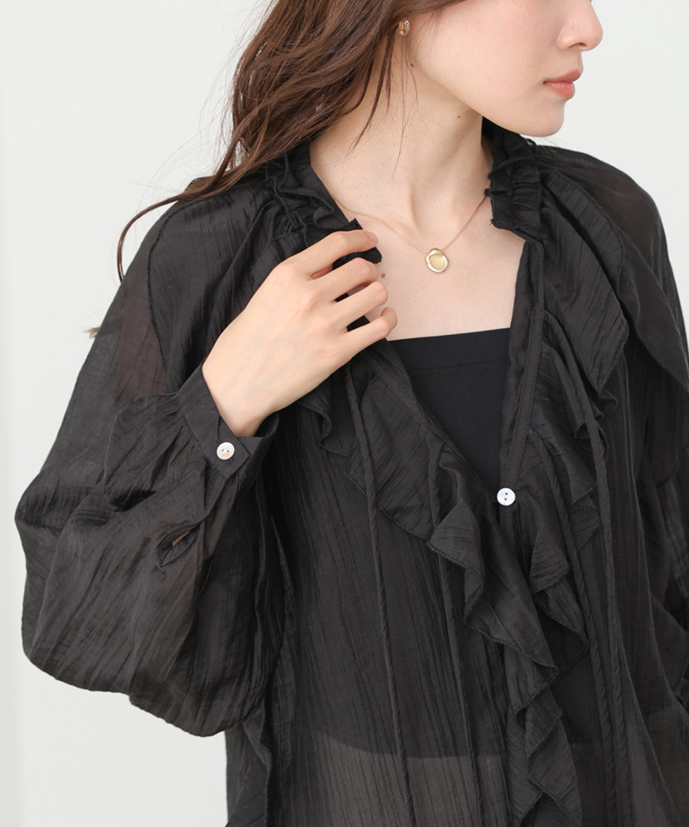 しなやかに揺れるフリルが印象的な、大人フェミニンなシアーブラウス。テロンとした落ち感のある素材が、身体のラインを拾いすぎず、やわらかく包み込むようなシルエットに。繊細なシアー感が女性らしさを引き立てつつ、甘くなりすぎない絶妙なバランスが魅力です。アイボリーはやさしく抜け感のある印象に、ブラックはぐっとシックでモードな雰囲気に。オンにもオフにも使える、着回し力の高い一枚です。