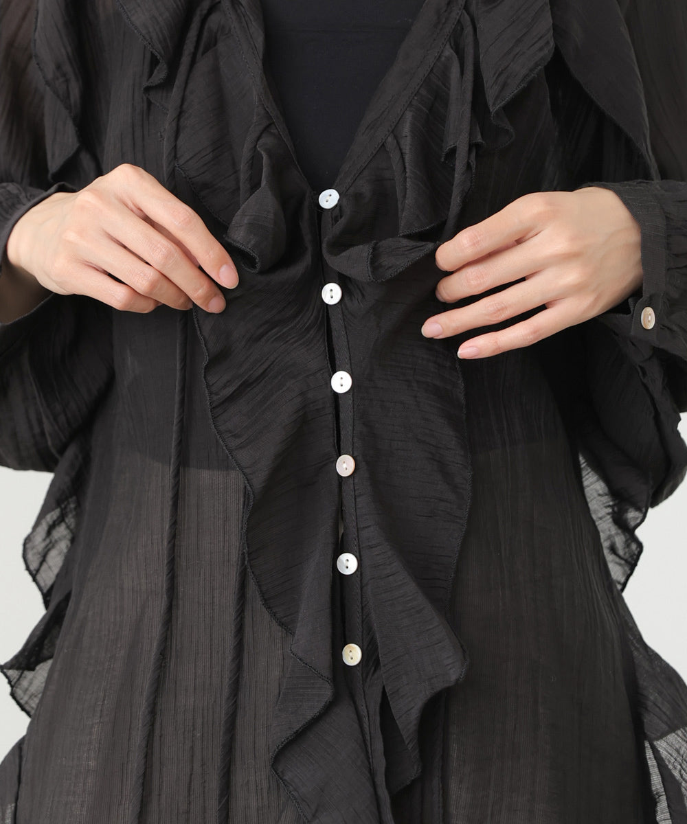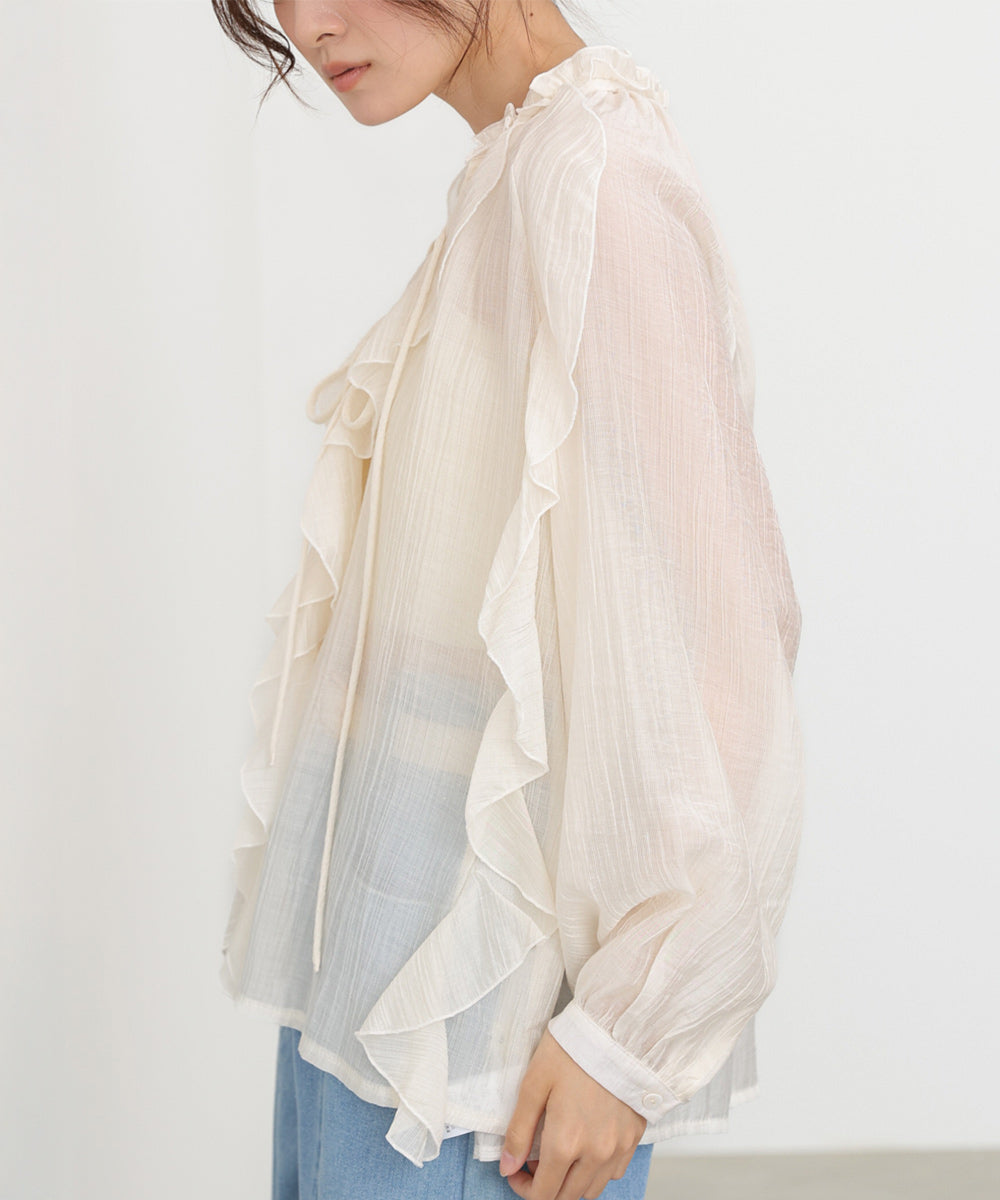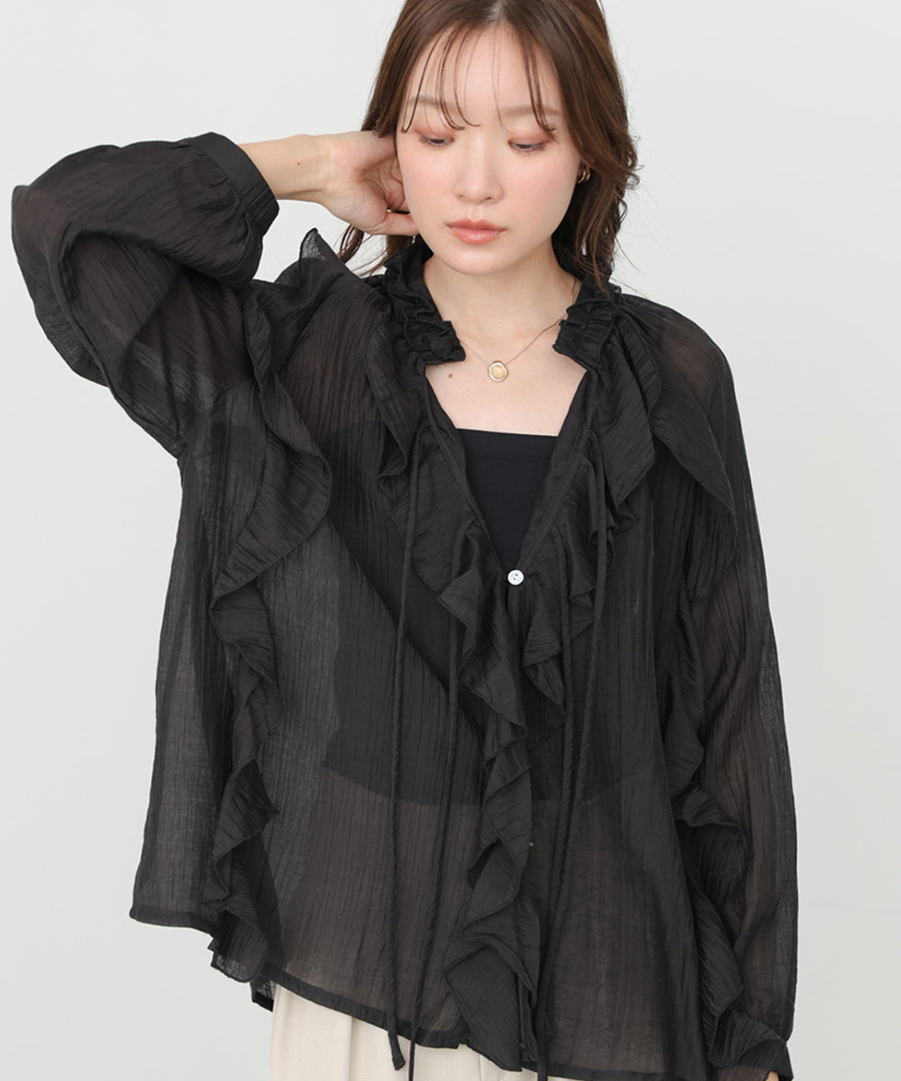 しなやかに揺れるフリルが印象的な、大人フェミニンなシアーブラウス。テロンとした落ち感のある素材が、身体のラインを拾いすぎず、やわらかく包み込むようなシルエットに。繊細なシアー感が女性らしさを引き立てつつ、甘くなりすぎない絶妙なバランスが魅力です。アイボリーはやさしく抜け感のある印象に、ブラックはぐっとシックでモードな雰囲気に。オンにもオフにも使える、着回し力の高い一枚です。