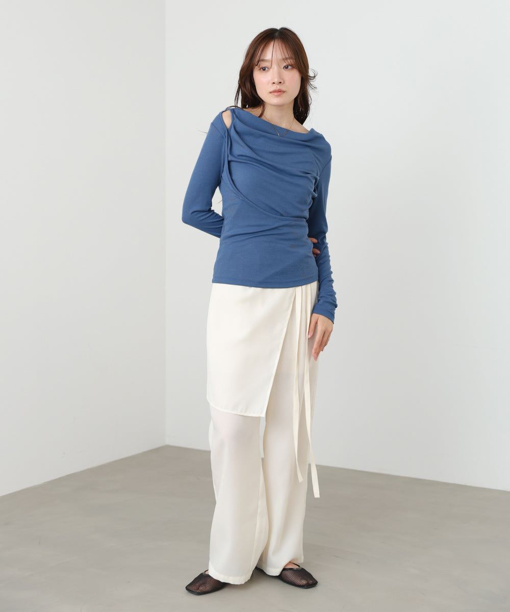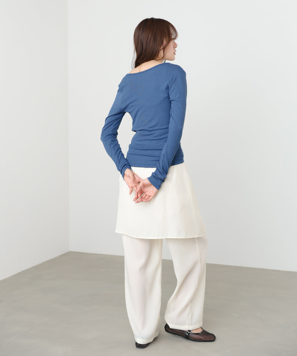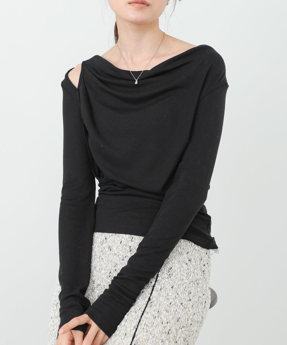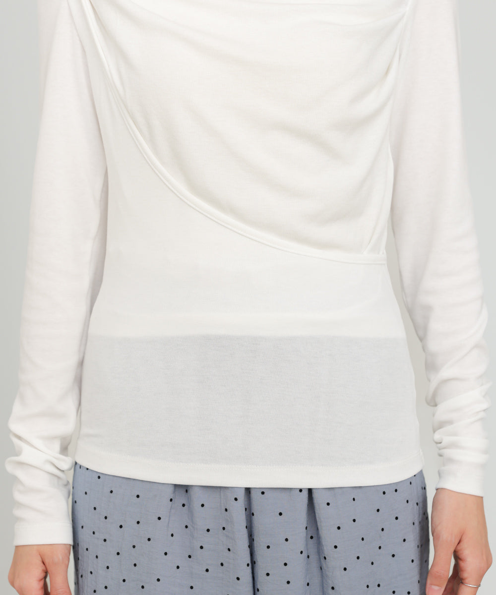 ハイウエストスラックスと合わせてきれいめにまとめれば、通勤にも対応できる上品スタイルに。デニムと合わせてカジュアルダウンすれば、程よく色っぽい大人カジュアルに仕上がります。タイトスカートと合わせて、ドレープを主役にした女性らしい着こなしもおすすめ。ジャケットのインナーとしても映えるので、ロングシーズン活躍してくれる一枚です。
