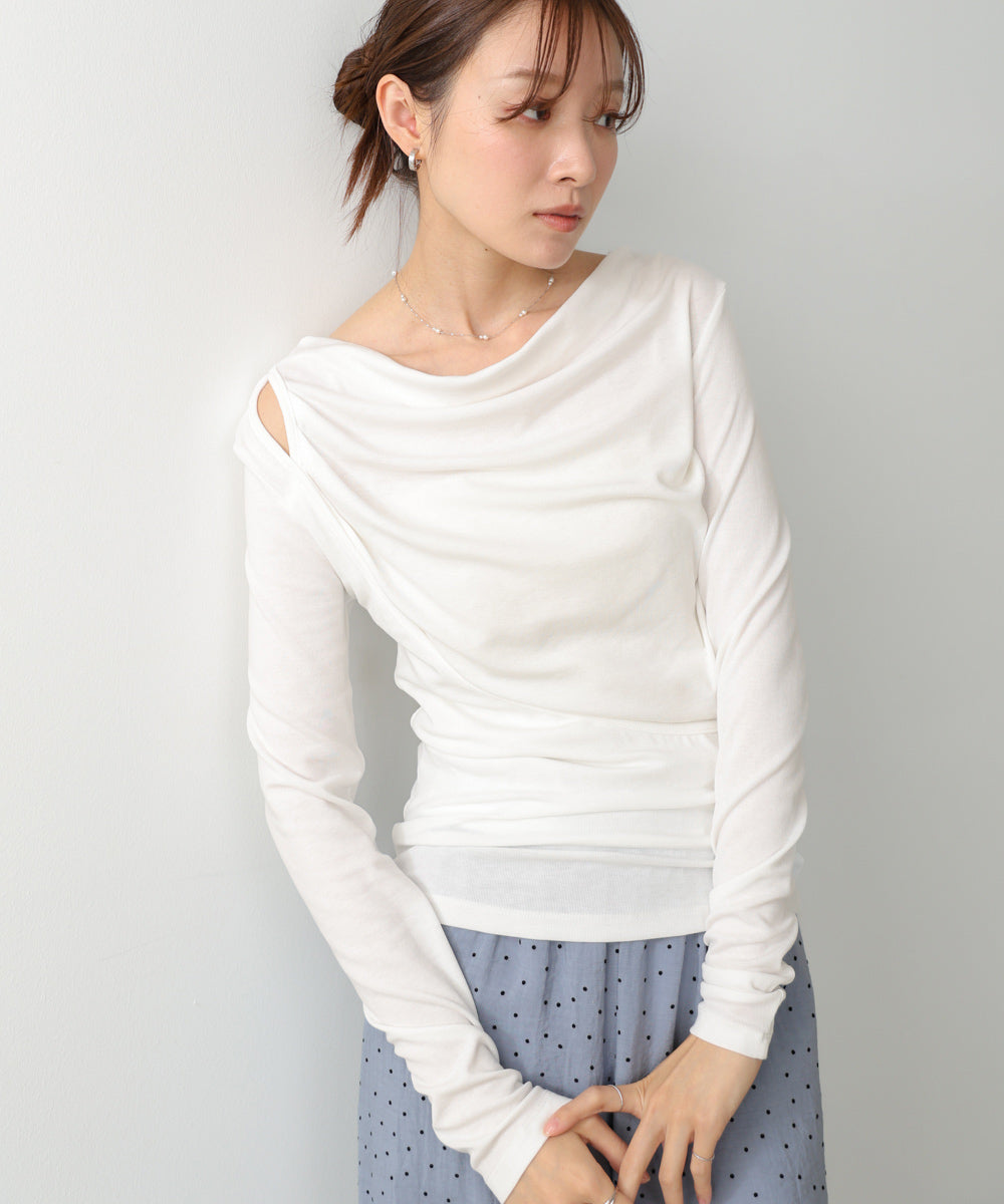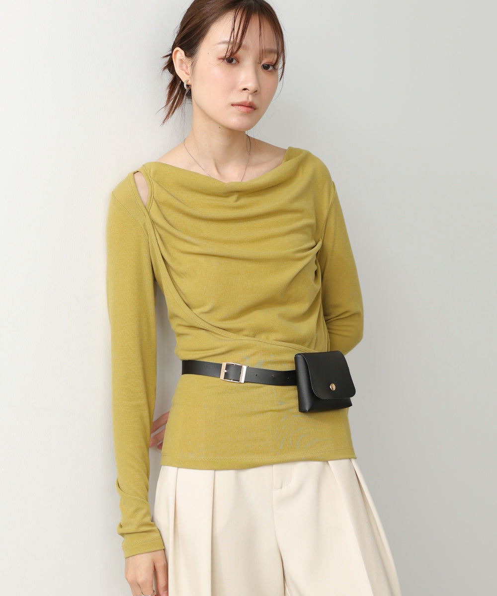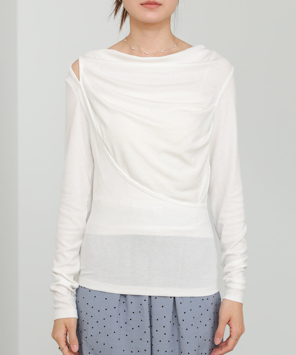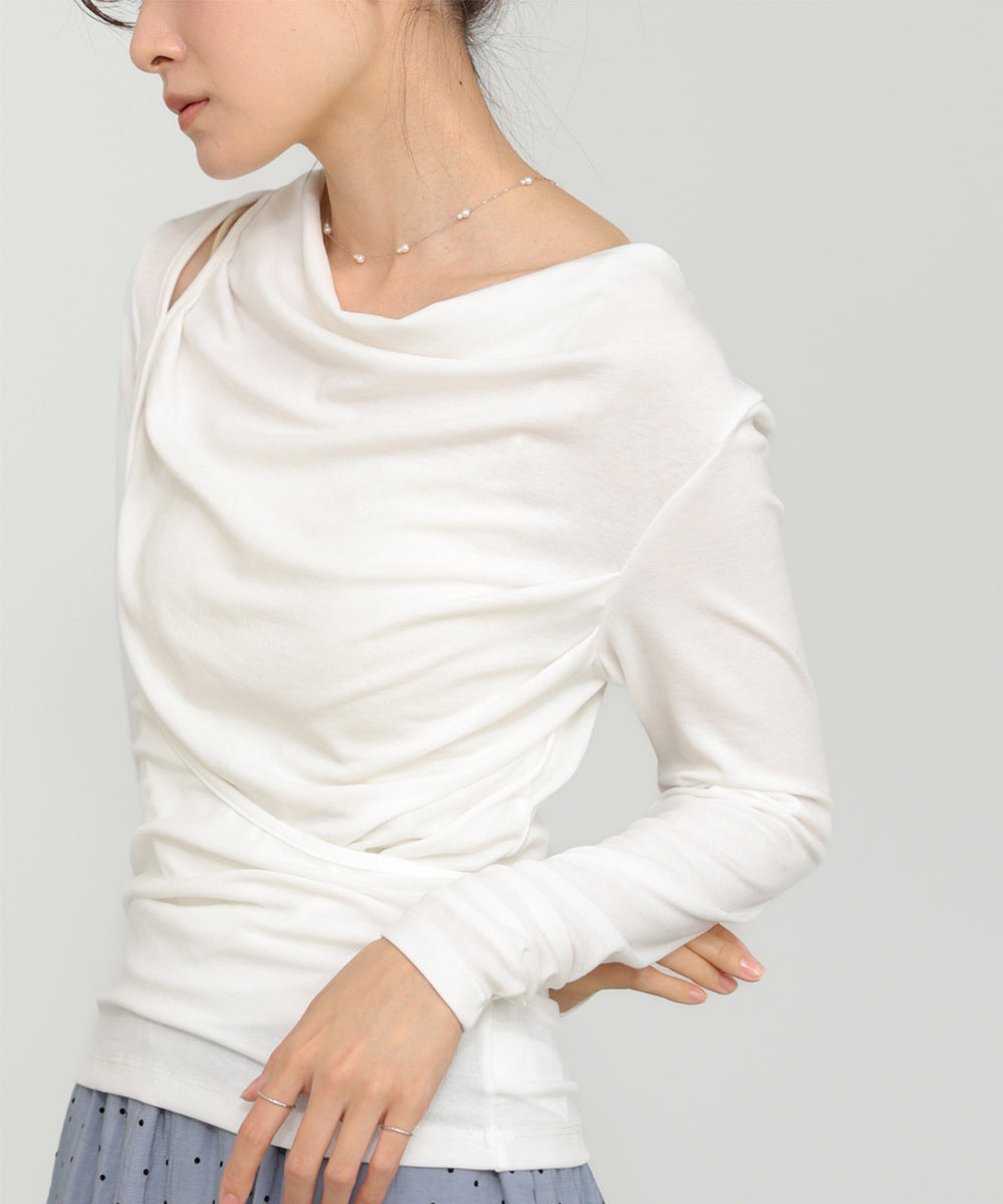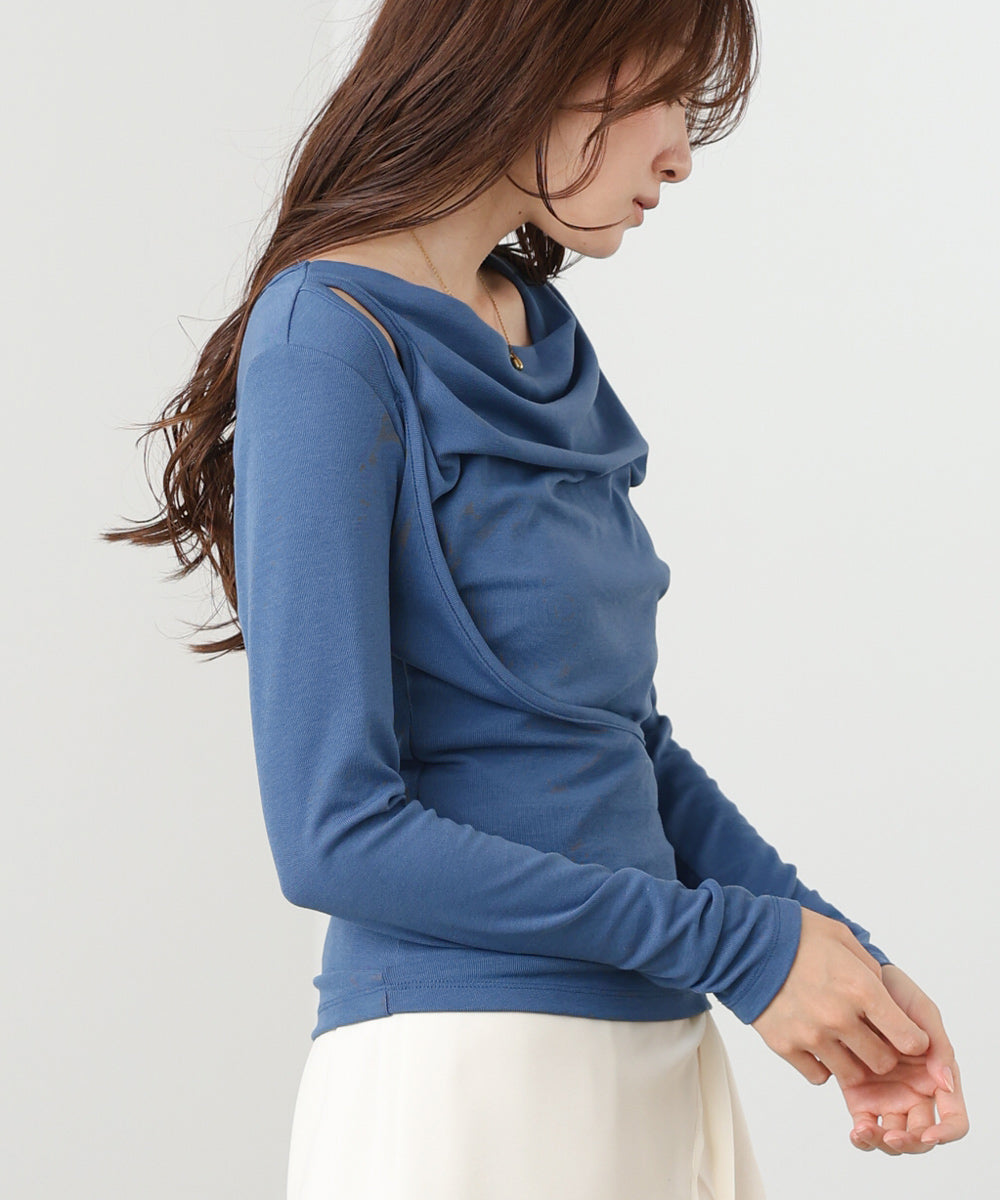 やわらかなドレープが女性らしいニュアンスを演出してくれる、カシュクールレイヤードトップス。流れるような立体感が自然と視線を上に集め、スタイルアップ効果も◎さらに肩部分はさりげない肌見せデザインに。大胆すぎない抜け感が、大人の余裕を感じさせてくれます。ホワイト・イエロー・ブルー・ブラックの4色展開で、ベーシックにもアクセントにも使える一枚です。