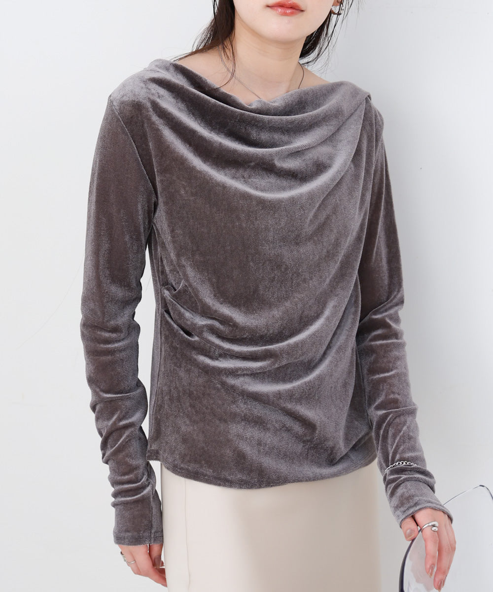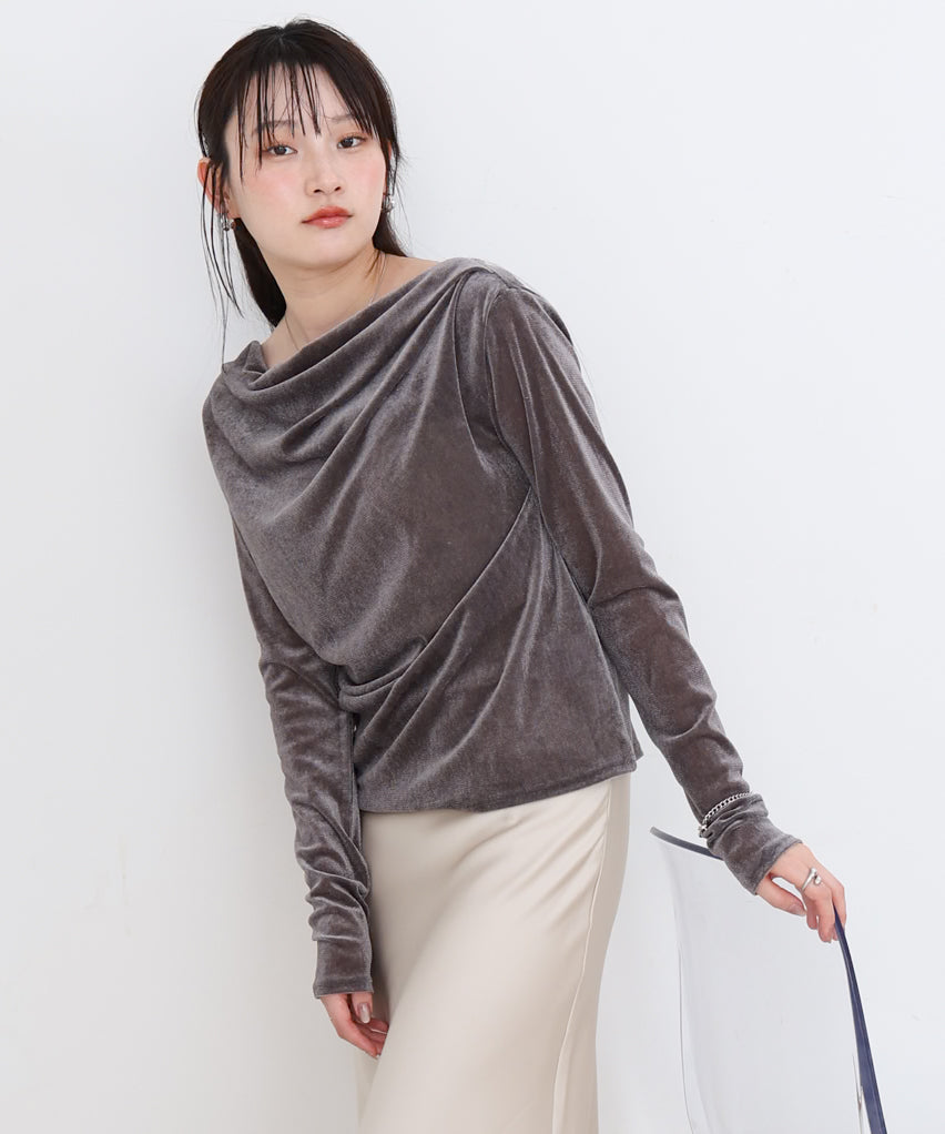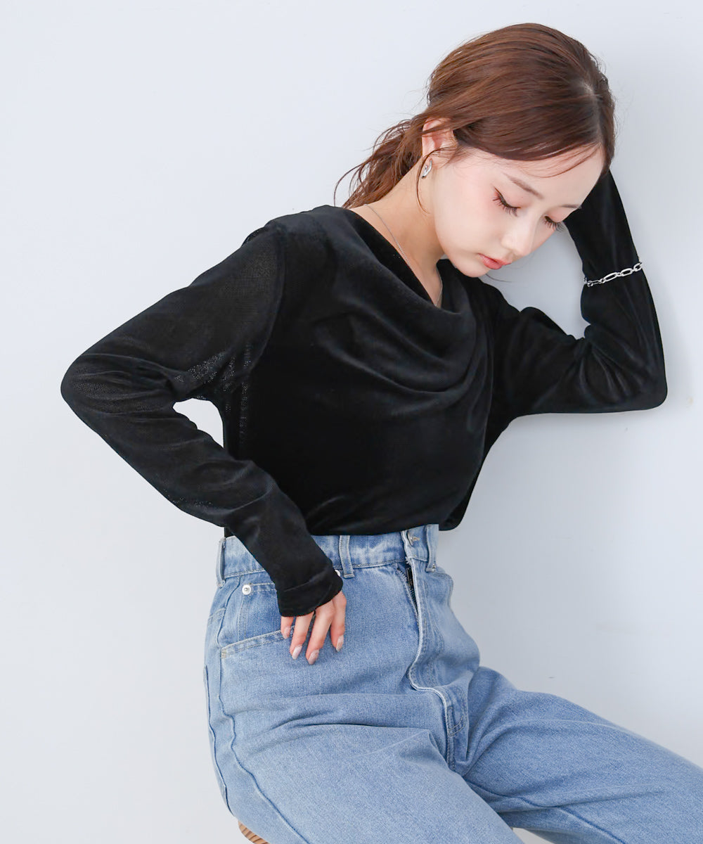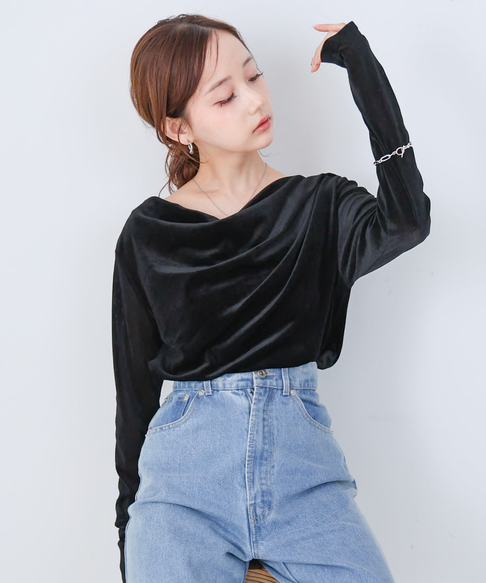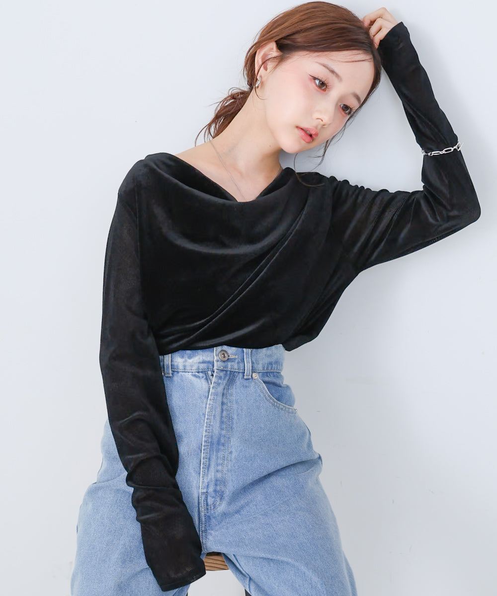 秋口にぴったりなベロア×シアーのトップスが登場!着るだけでさりげない光沢感が上品な印象にしてくれます。フロント部分にはドレープを施すことでトレンドライクになっています。デニムを合わせてカジュアルにしたり、サテンスカートなどと合わせてきれいめスタイルにしたりと秋コーデをお楽しみください!