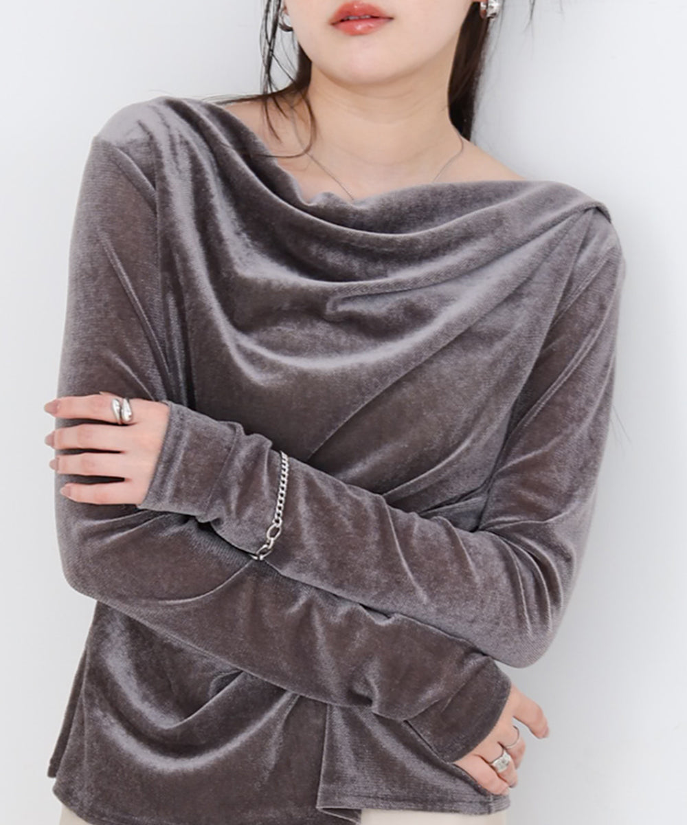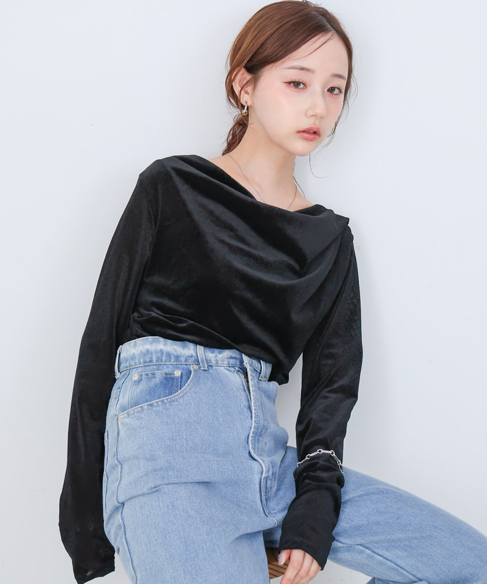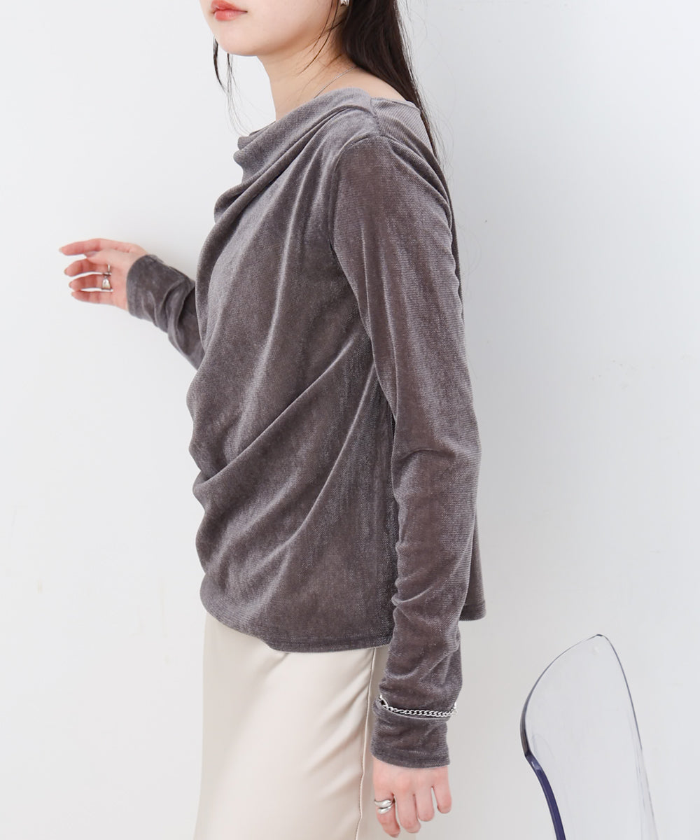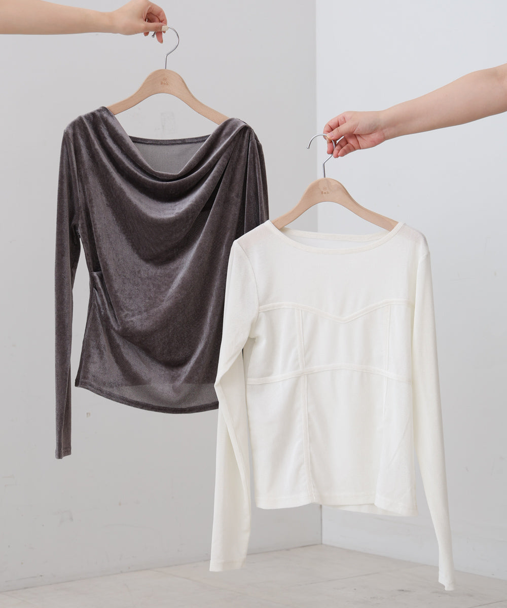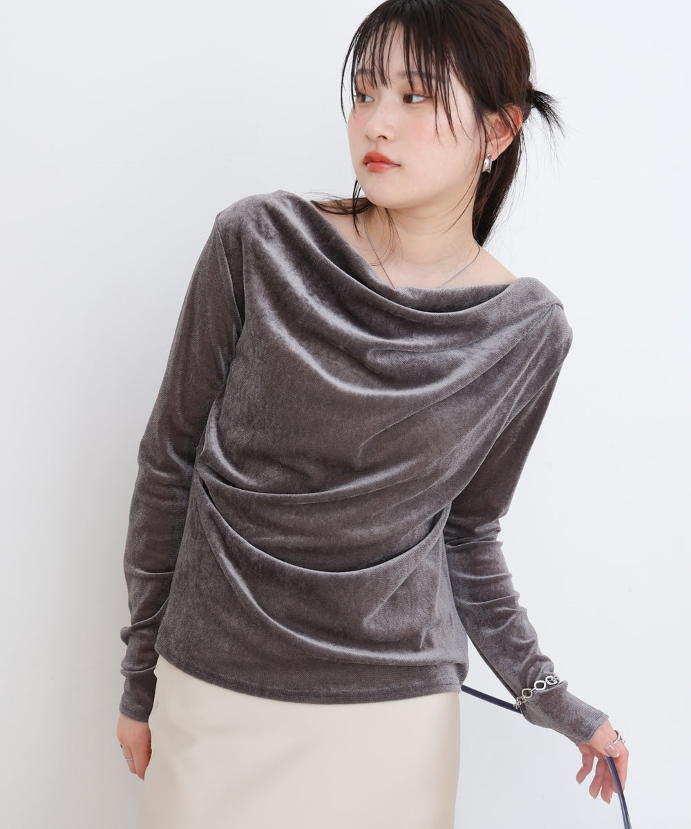 秋口にぴったりなベロア×シアーのトップスが登場!着るだけでさりげない光沢感が上品な印象にしてくれます。フロント部分にはドレープを施すことでトレンドライクになっています。デニムを合わせてカジュアルにしたり、サテンスカートなどと合わせてきれいめスタイルにしたりと秋コーデをお楽しみください!