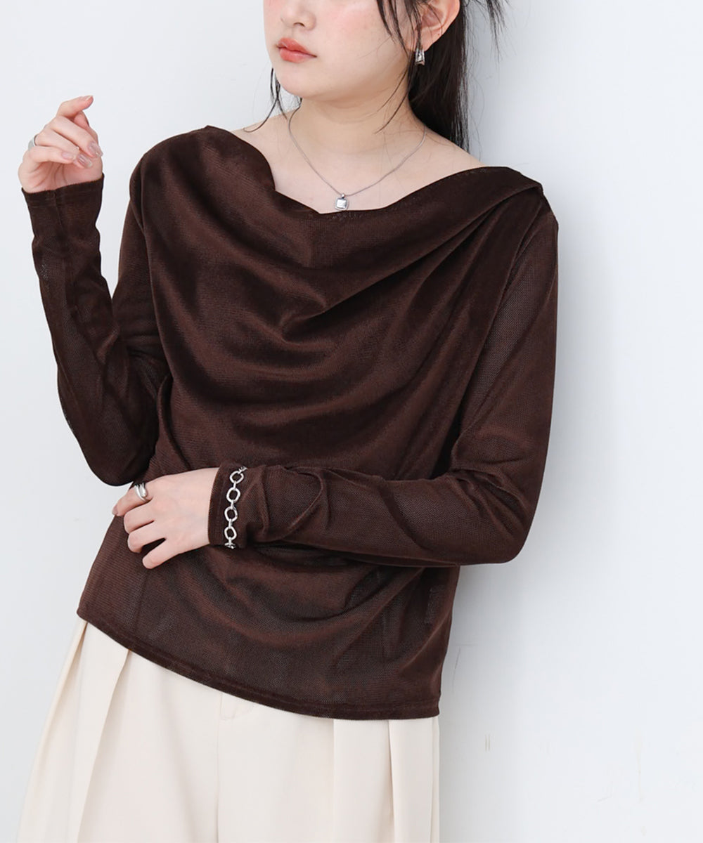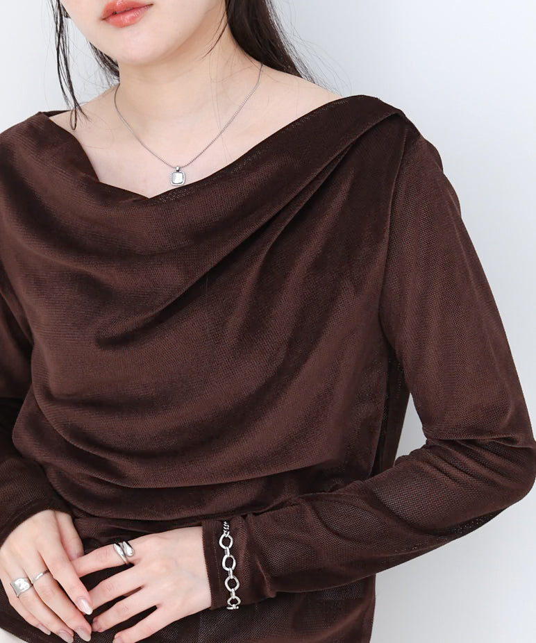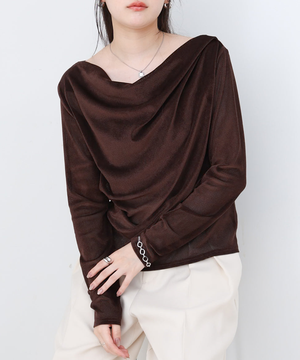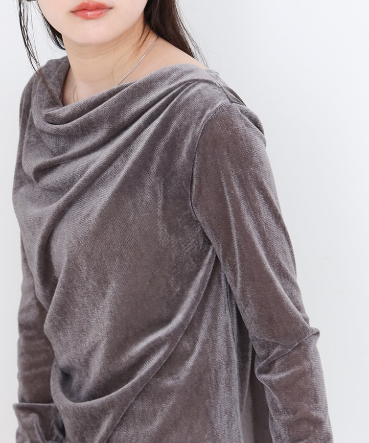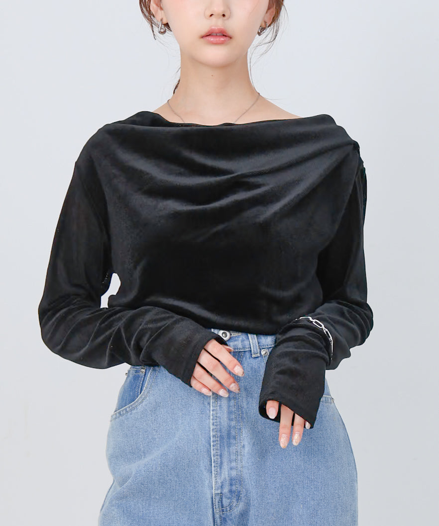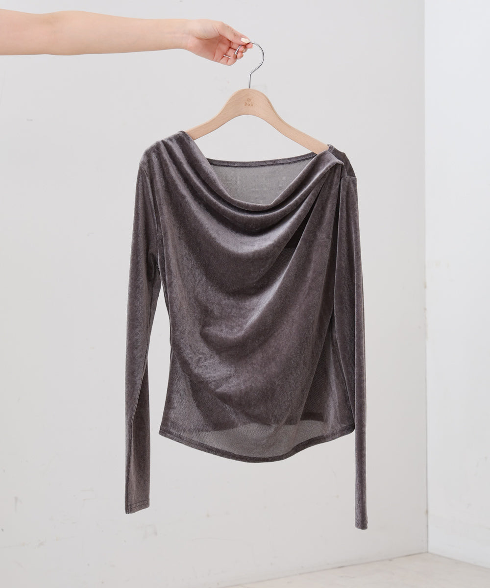 秋口にぴったりなベロア×シアーのトップスが登場!着るだけでさりげない光沢感が上品な印象にしてくれます。フロント部分にはドレープを施すことでトレンドライクになっています。デニムを合わせてカジュアルにしたり、サテンスカートなどと合わせてきれいめスタイルにしたりと秋コーデをお楽しみください!