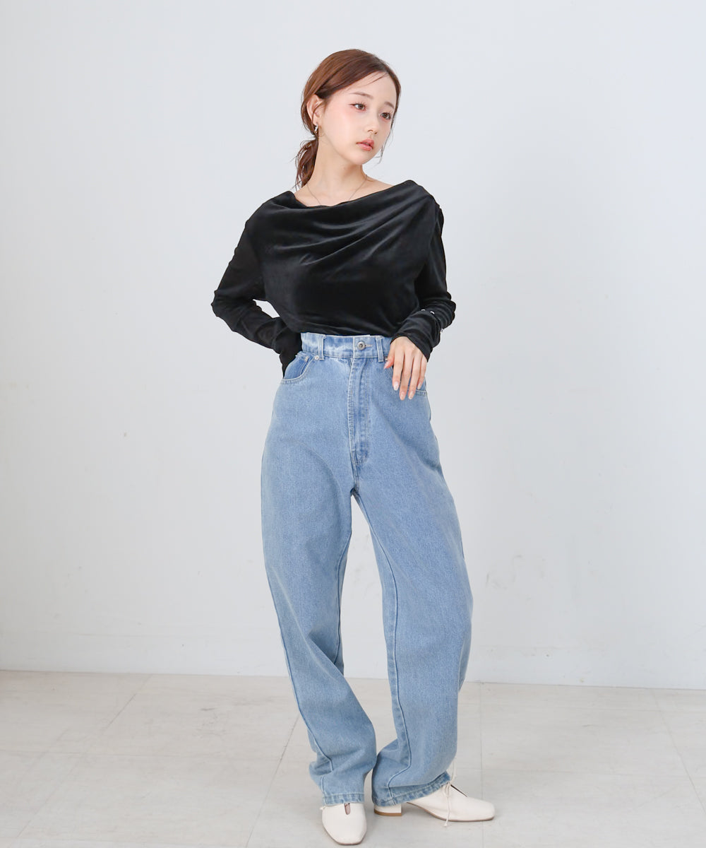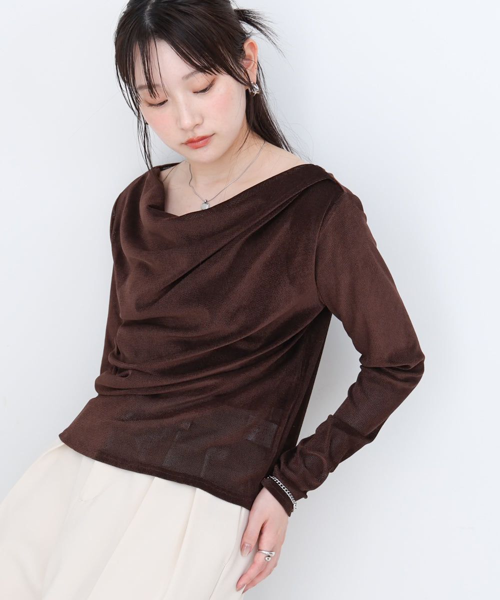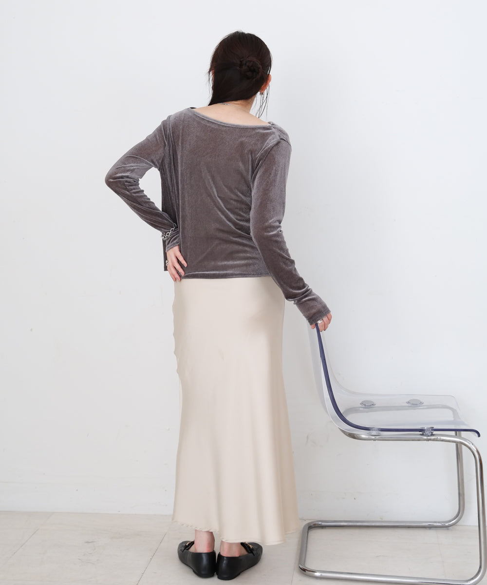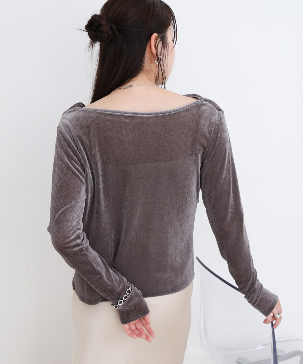 秋口にぴったりなベロア×シアーのトップスが登場!着るだけでさりげない光沢感が上品な印象にしてくれます。フロント部分にはドレープを施すことでトレンドライクになっています。デニムを合わせてカジュアルにしたり、サテンスカートなどと合わせてきれいめスタイルにしたりと秋コーデをお楽しみください!