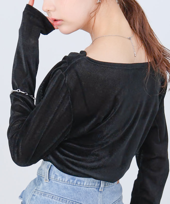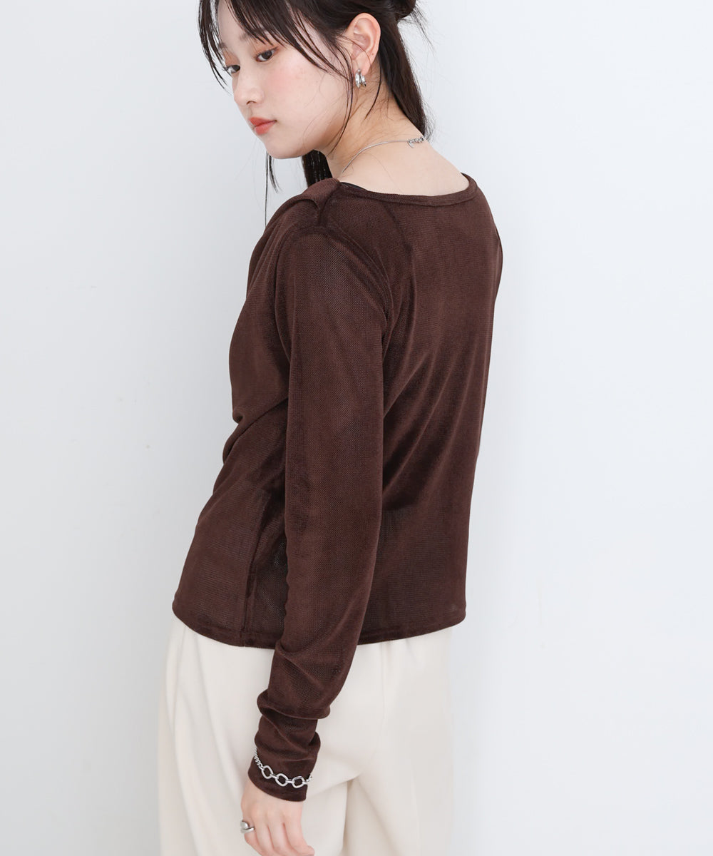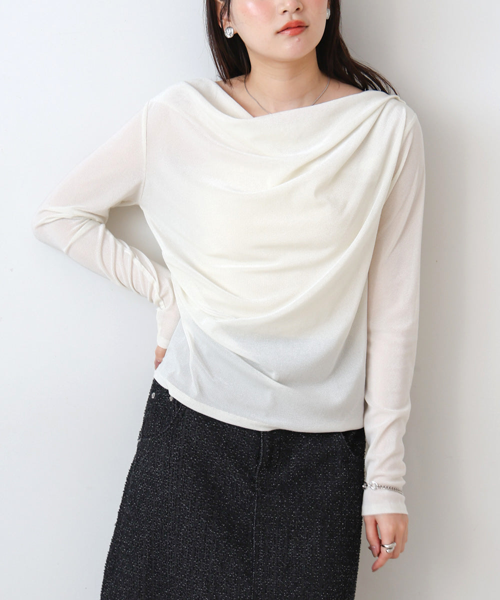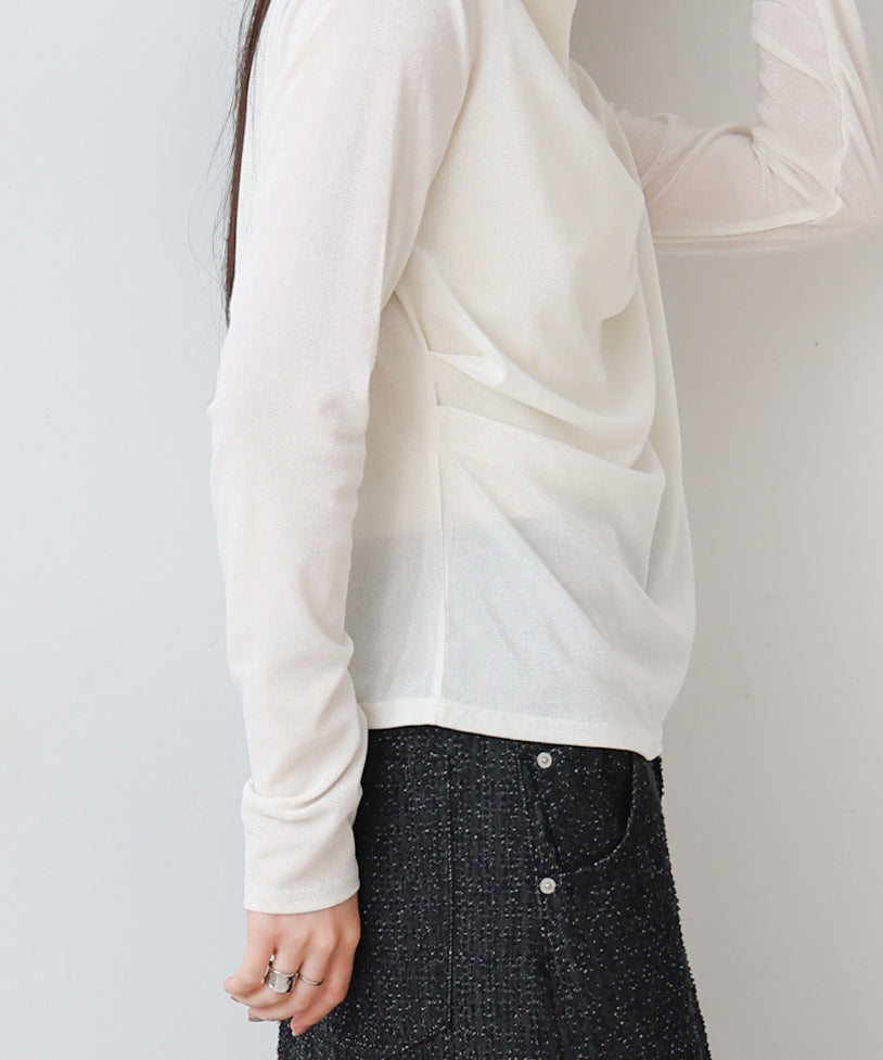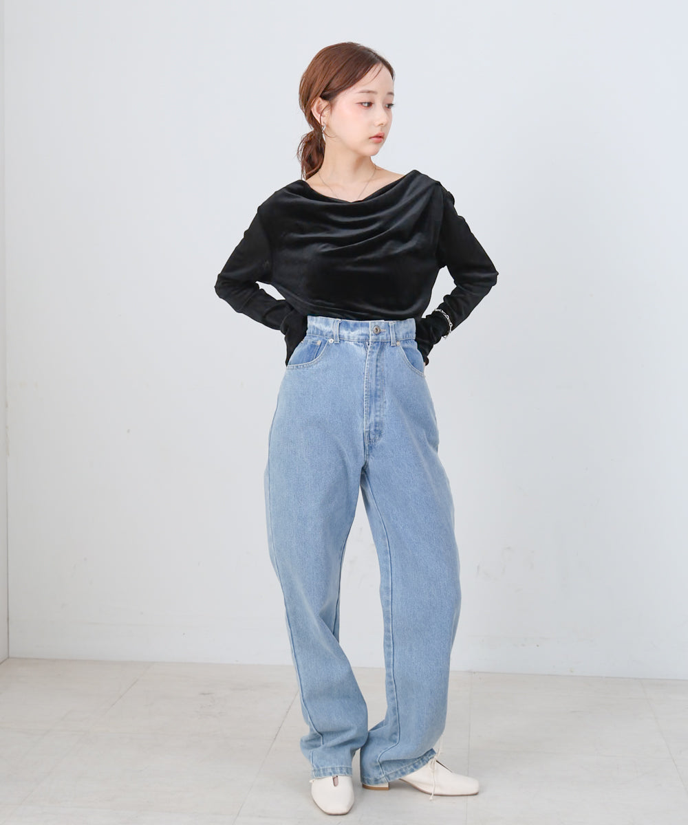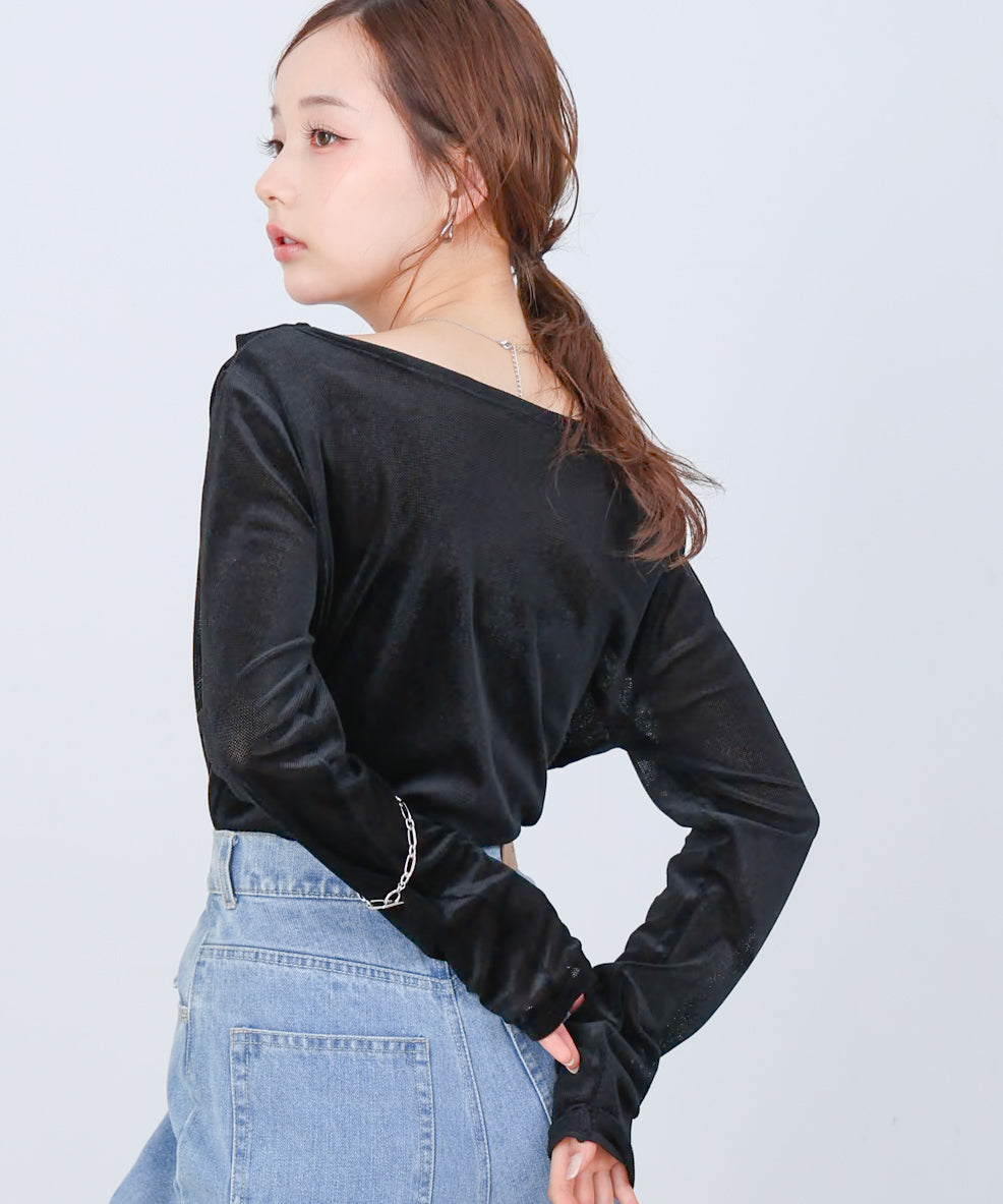 秋口にぴったりなベロア×シアーのトップスが登場!着るだけでさりげない光沢感が上品な印象にしてくれます。フロント部分にはドレープを施すことでトレンドライクになっています。デニムを合わせてカジュアルにしたり、サテンスカートなどと合わせてきれいめスタイルにしたりと秋コーデをお楽しみください!