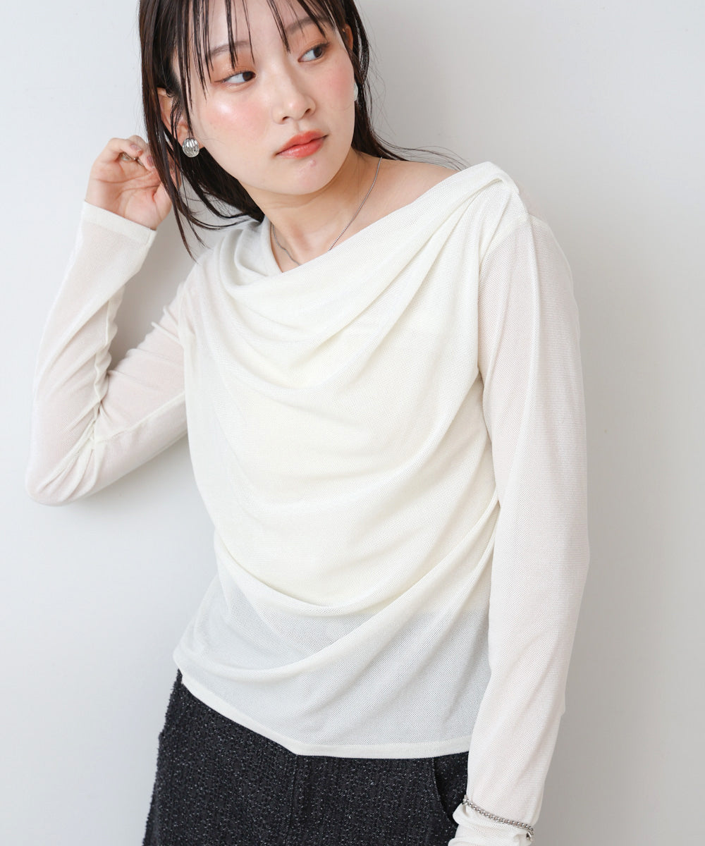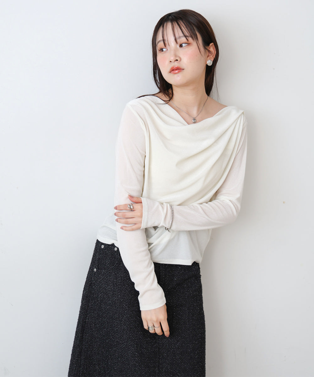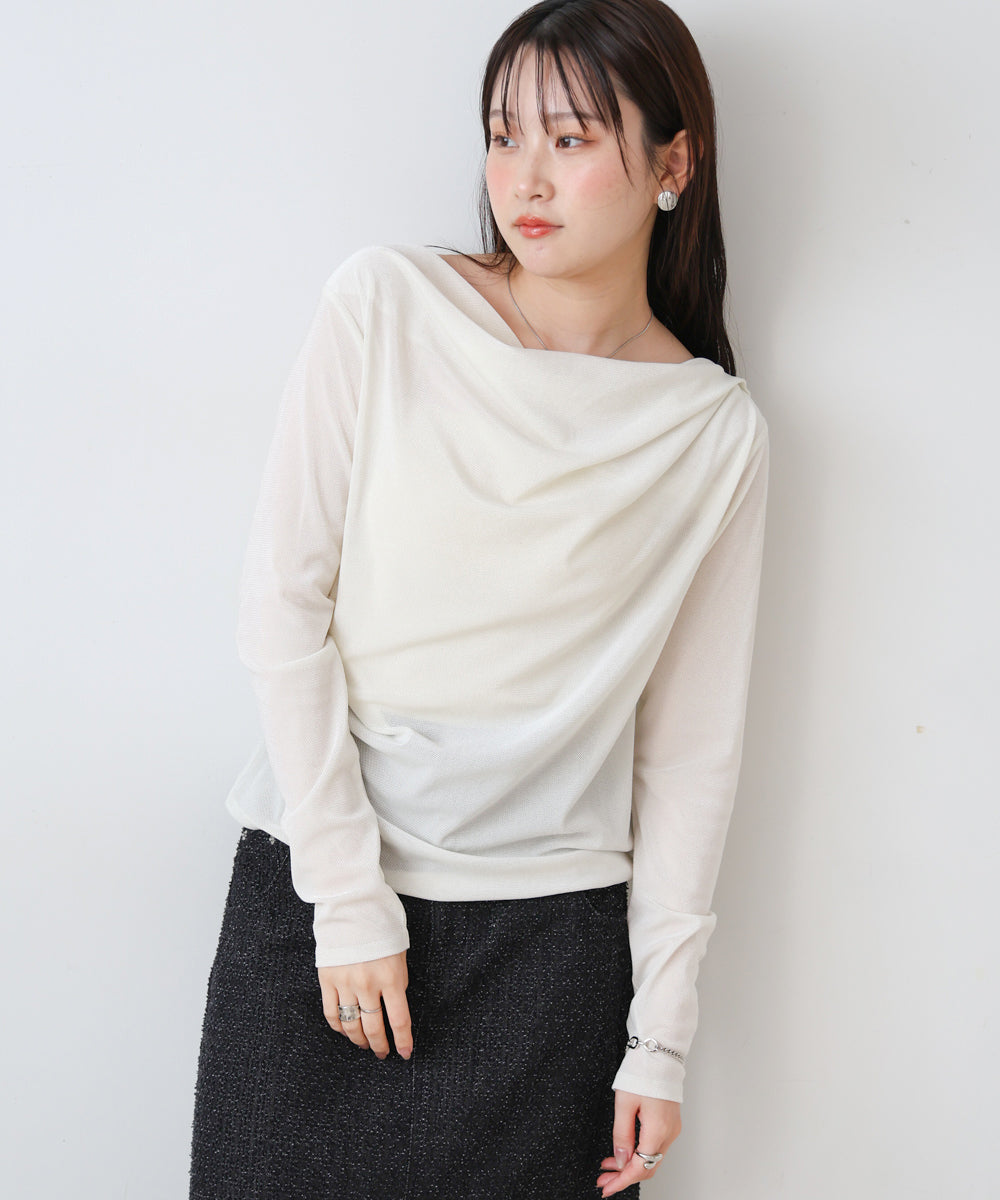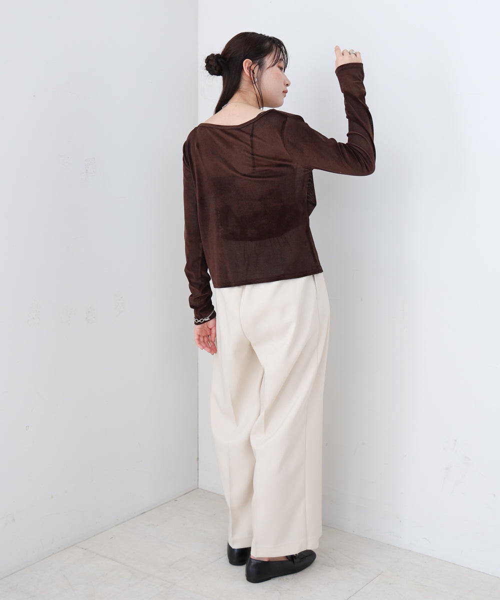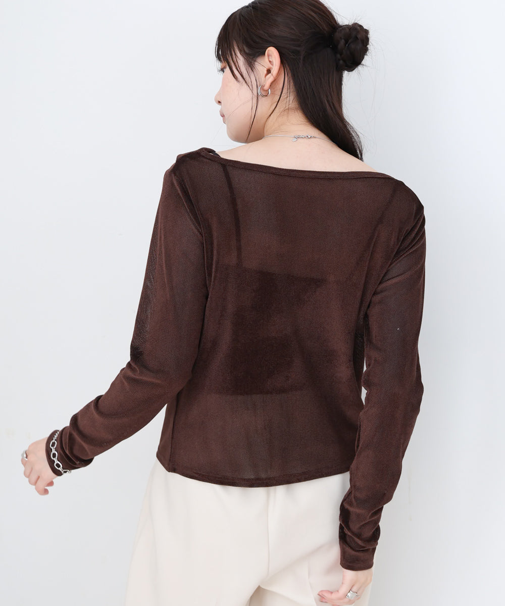 秋口にぴったりなベロア×シアーのトップスが登場!着るだけでさりげない光沢感が上品な印象にしてくれます。フロント部分にはドレープを施すことでトレンドライクになっています。デニムを合わせてカジュアルにしたり、サテンスカートなどと合わせてきれいめスタイルにしたりと秋コーデをお楽しみください!