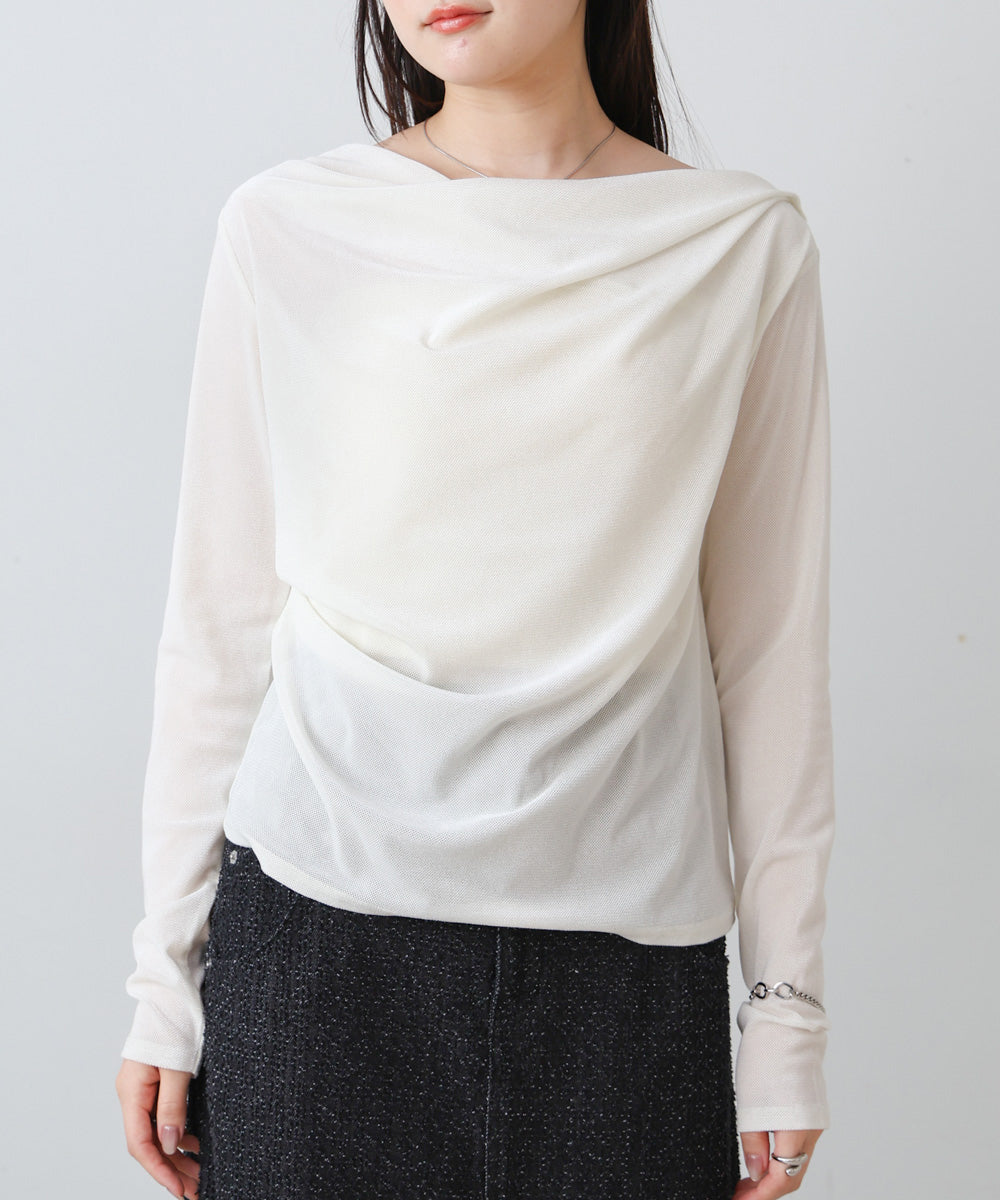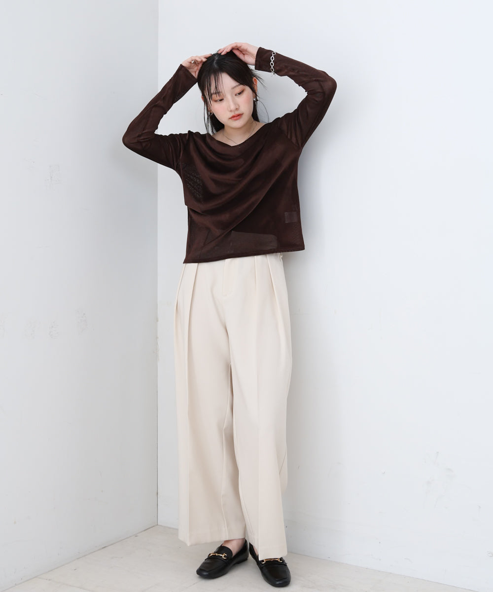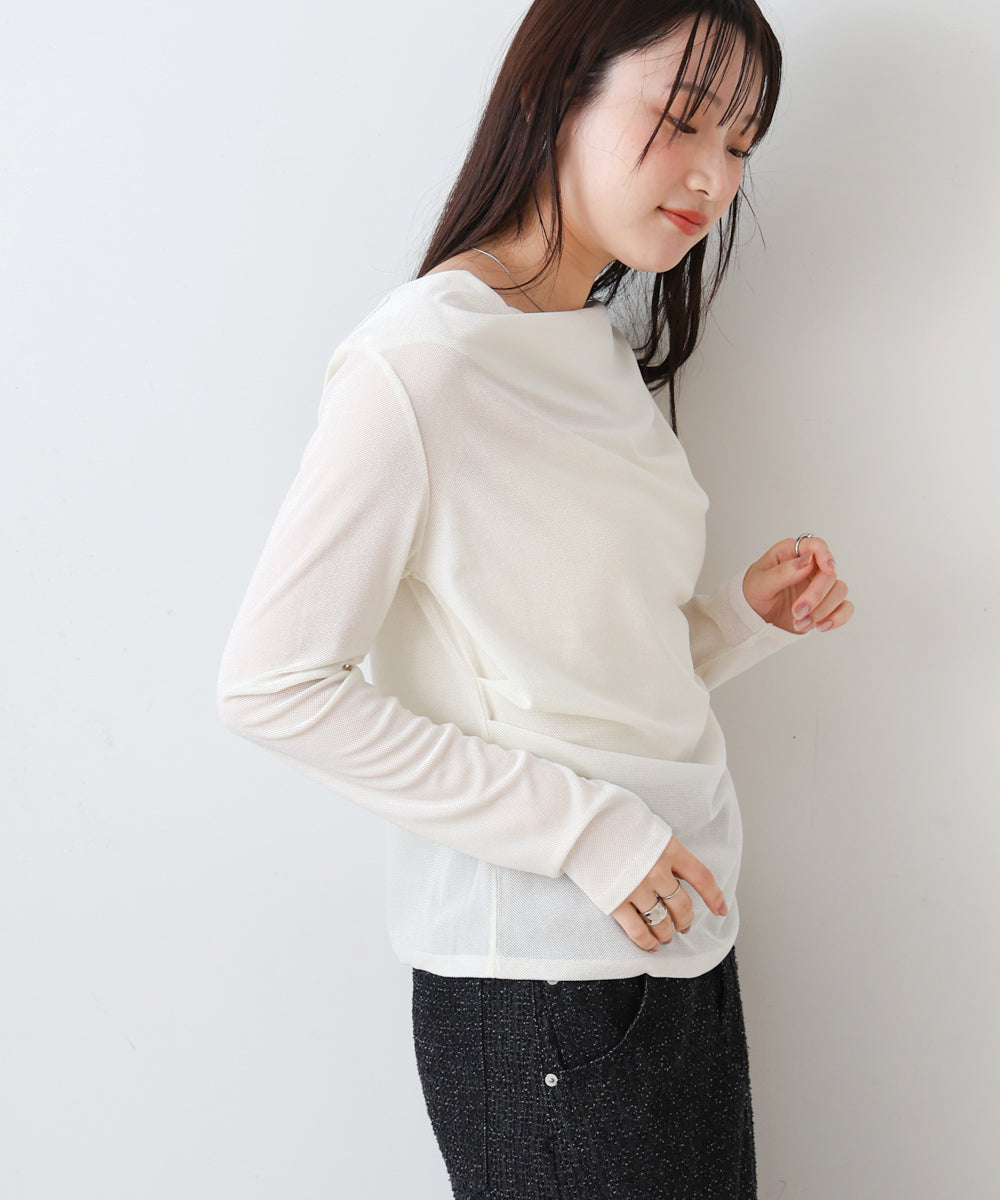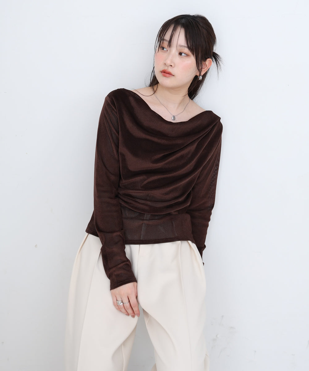 秋口にぴったりなベロア×シアーのトップスが登場!着るだけでさりげない光沢感が上品な印象にしてくれます。フロント部分にはドレープを施すことでトレンドライクになっています。デニムを合わせてカジュアルにしたり、サテンスカートなどと合わせてきれいめスタイルにしたりと秋コーデをお楽しみください!