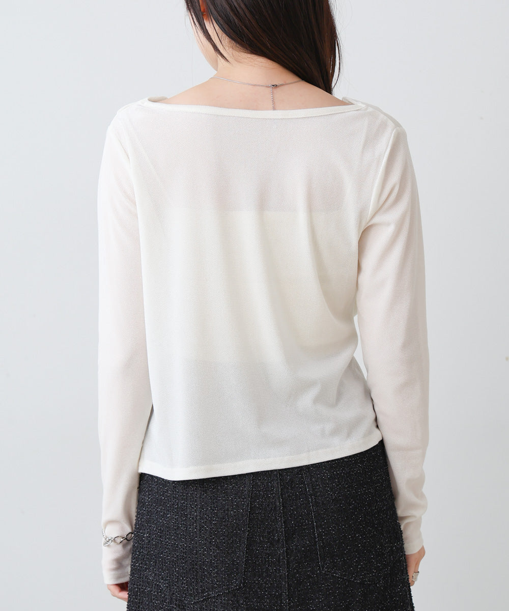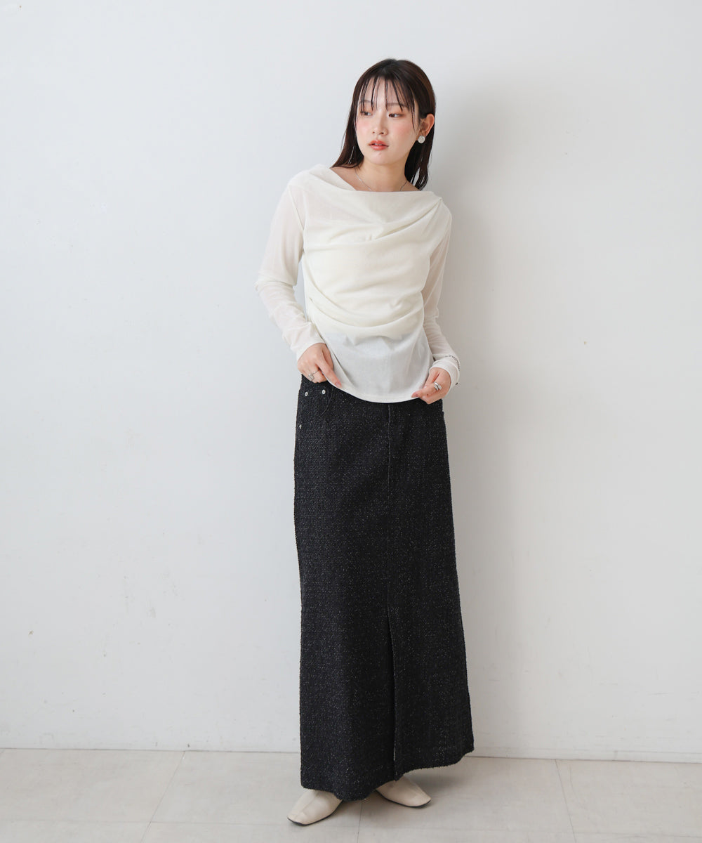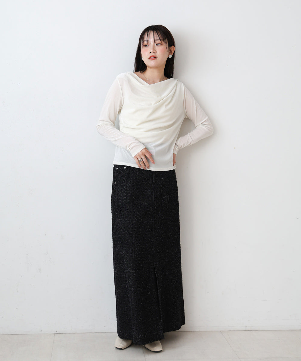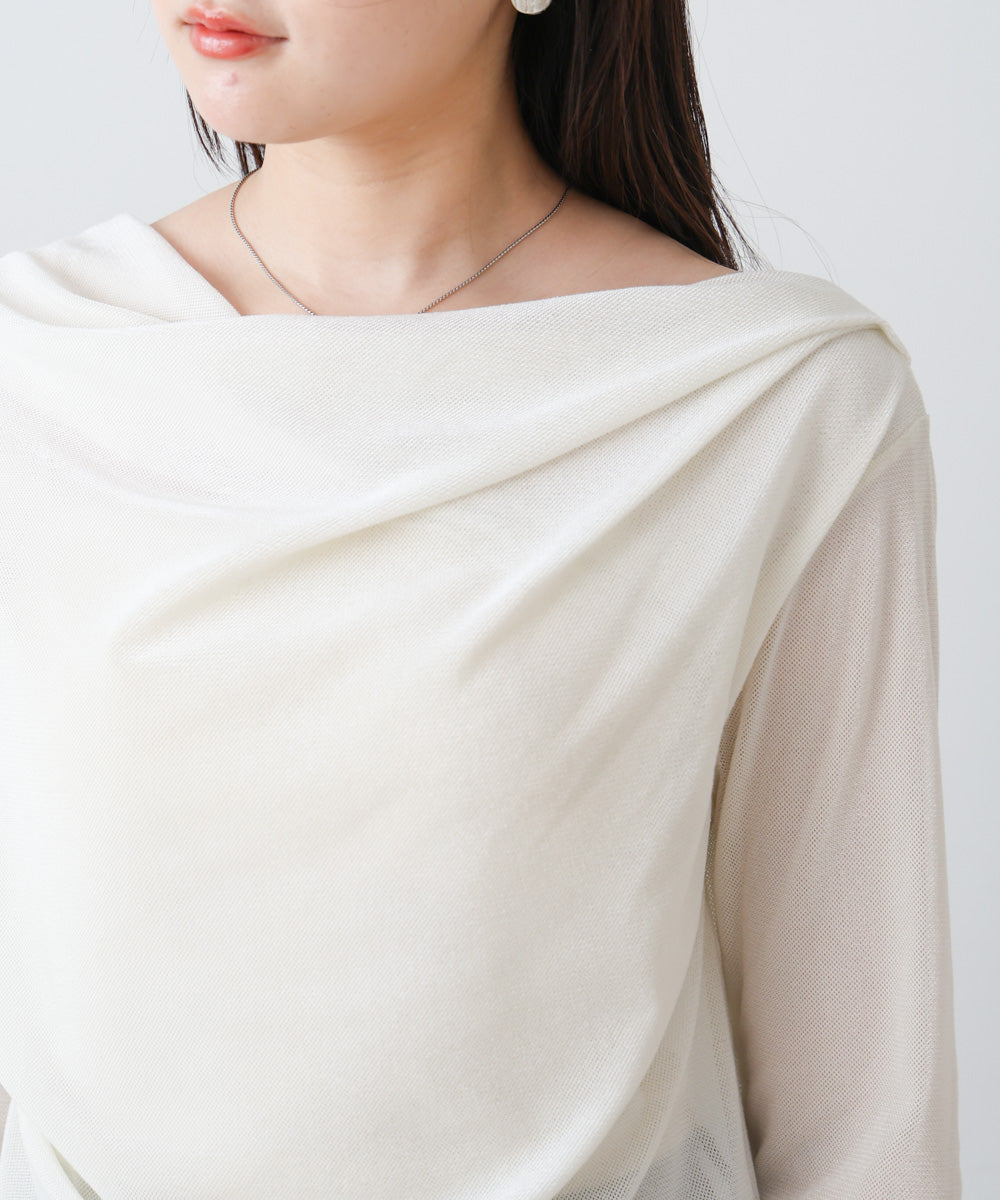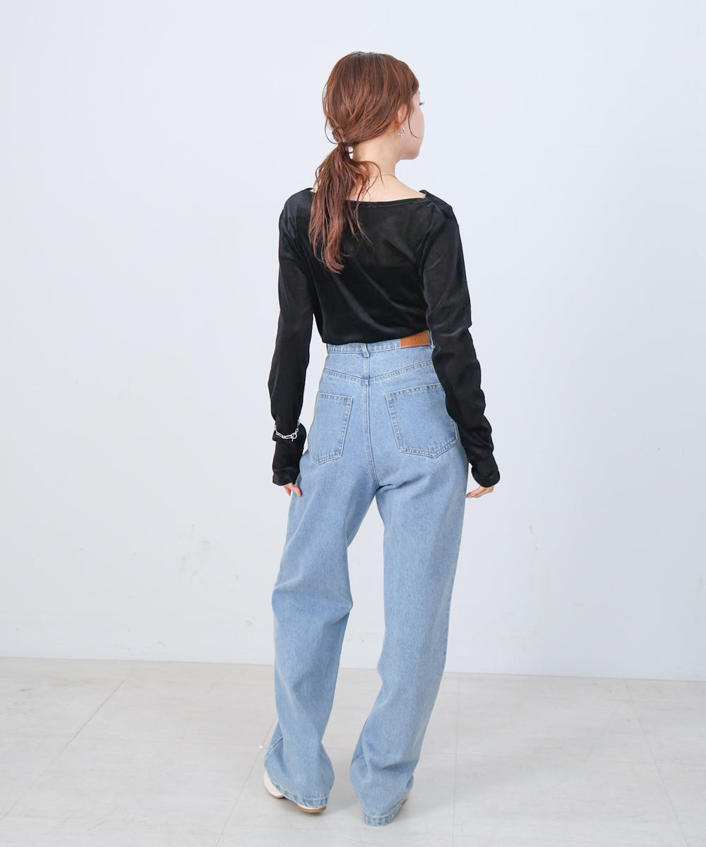 秋口にぴったりなベロア×シアーのトップスが登場!着るだけでさりげない光沢感が上品な印象にしてくれます。フロント部分にはドレープを施すことでトレンドライクになっています。デニムを合わせてカジュアルにしたり、サテンスカートなどと合わせてきれいめスタイルにしたりと秋コーデをお楽しみください!