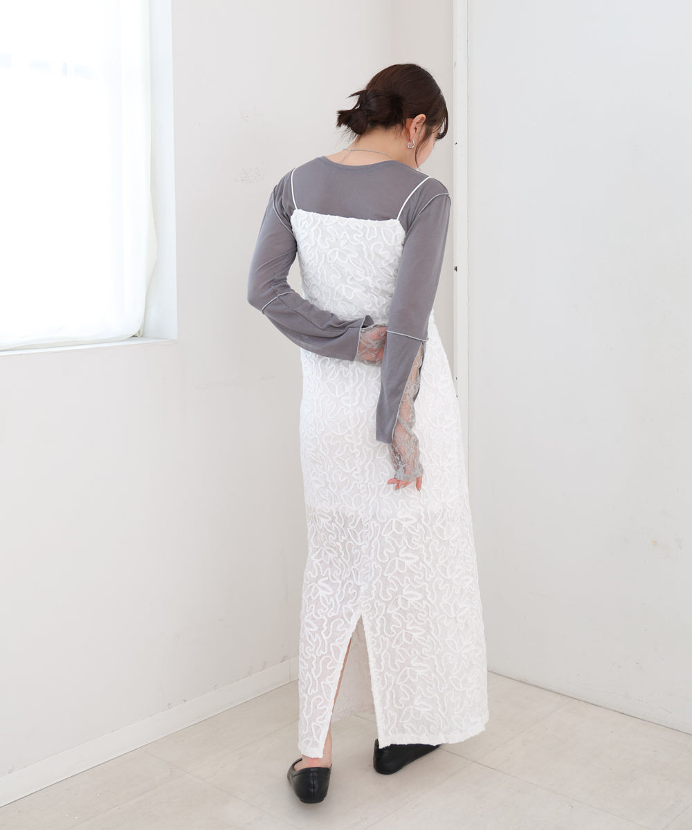 キャミワンピースのインナーに着ていただくのがおすすめです。薄手のトップスになっているのでどんな素材感のワンピースとも合います。