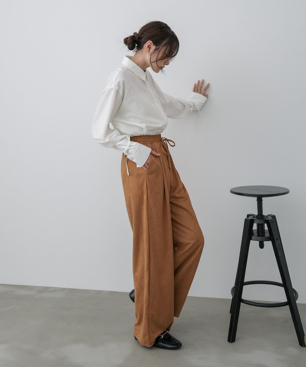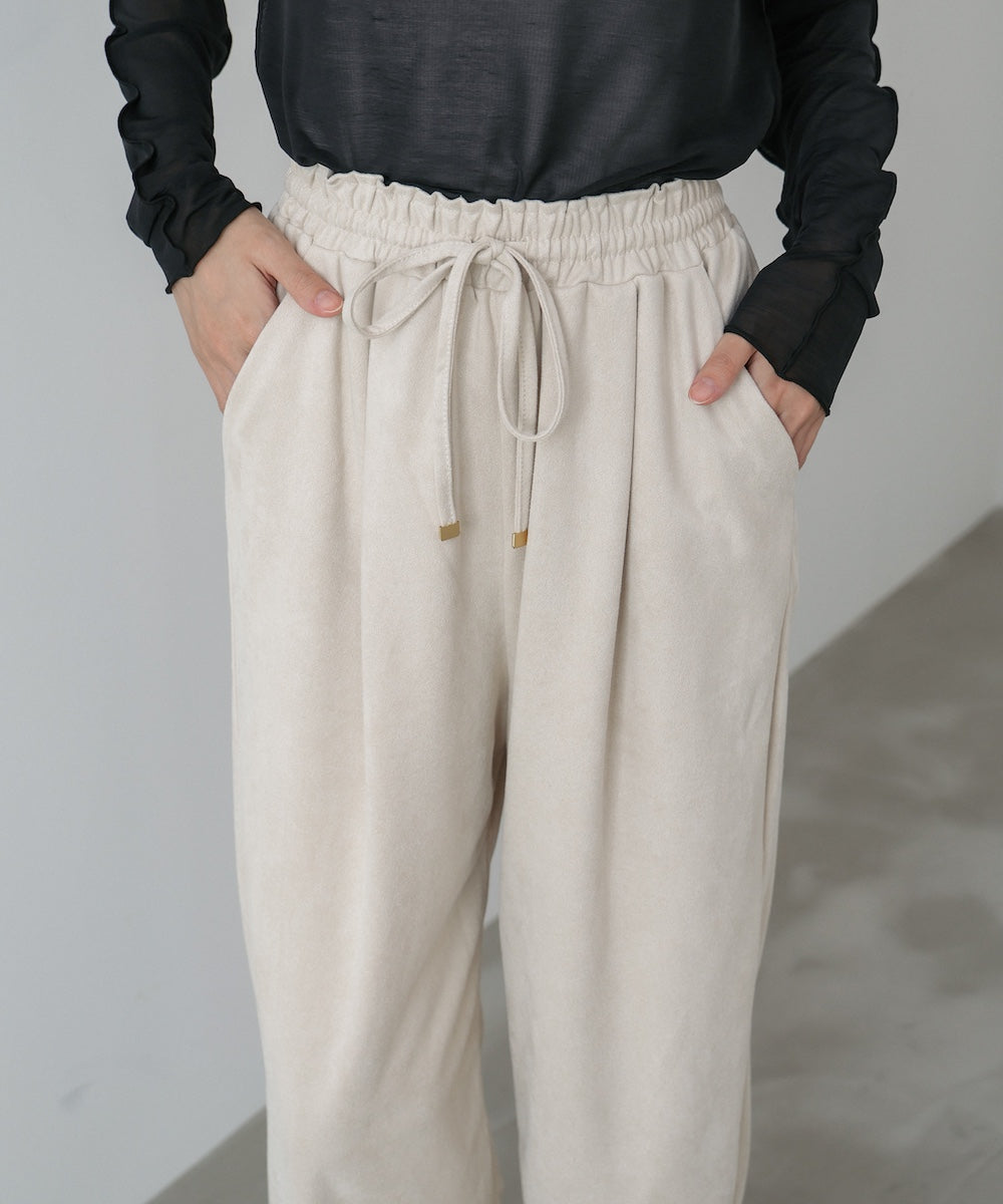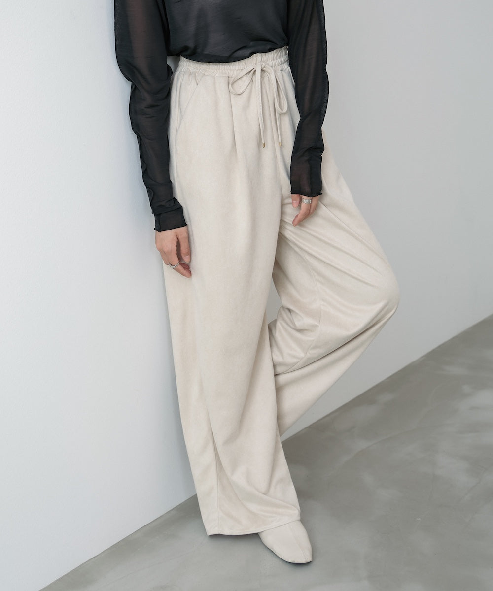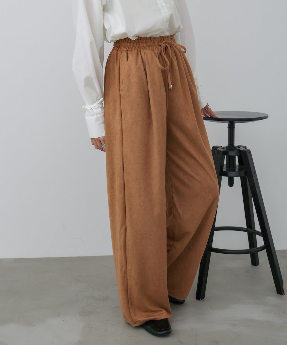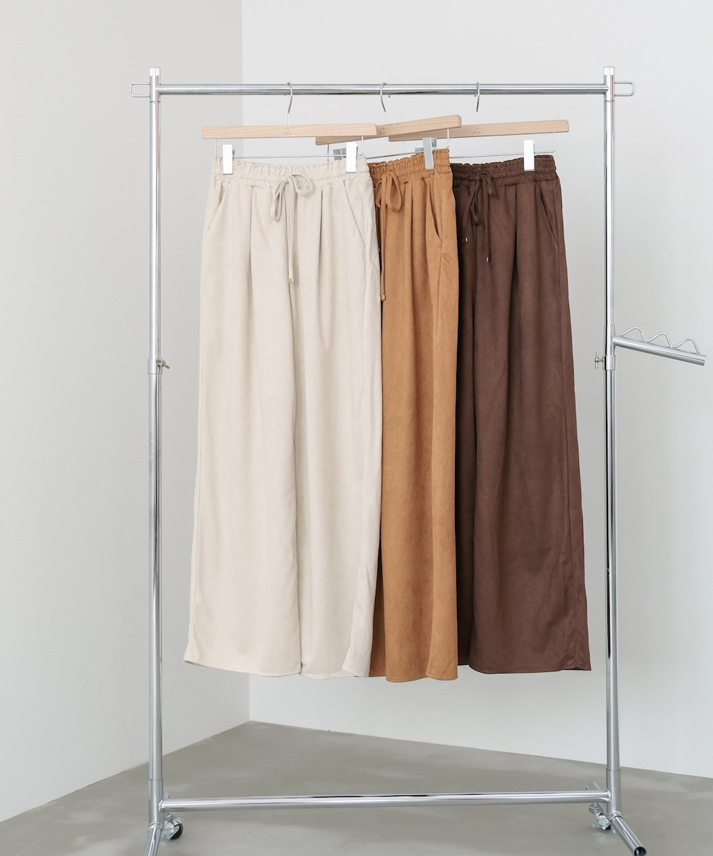 スエードのリラックスパンツが登場!秋らしさを出しながらもゆったりとノンストレスで履いていただけるアイテムになっています。ポケットもついていて実用性も◎きれいな落ち感でワイドよりのストレートパンツになっています。履くだけで一気に秋らしくなる、1枚持っていて使いまわしのきくパンツです。