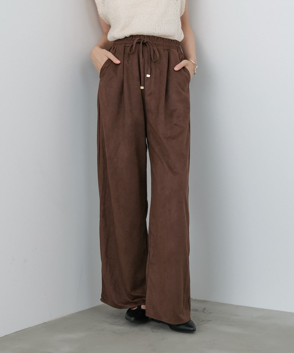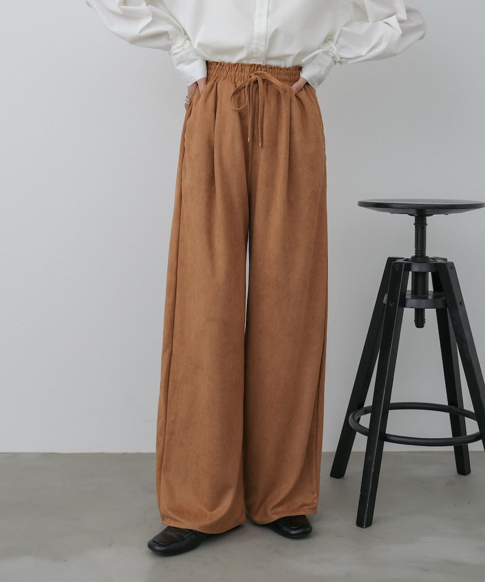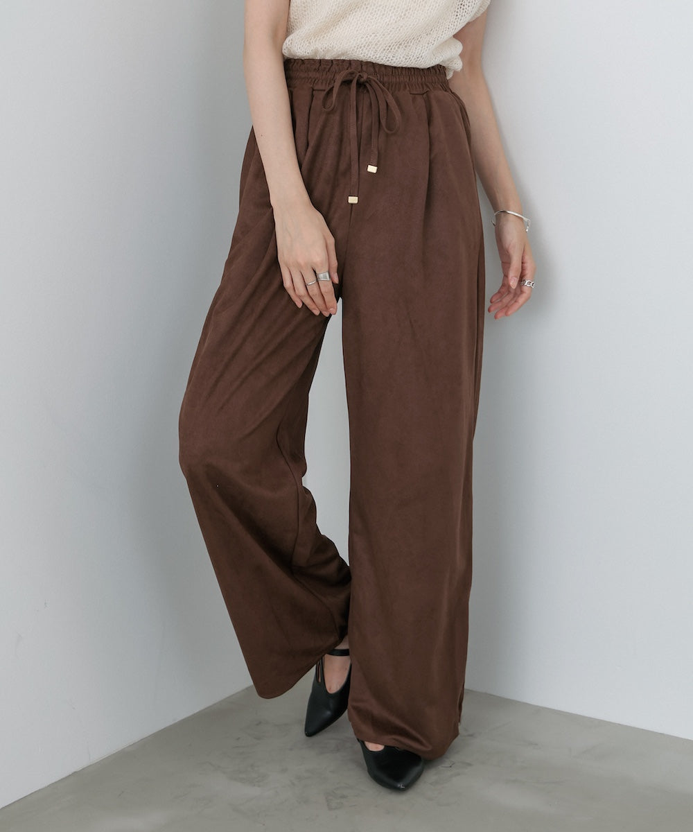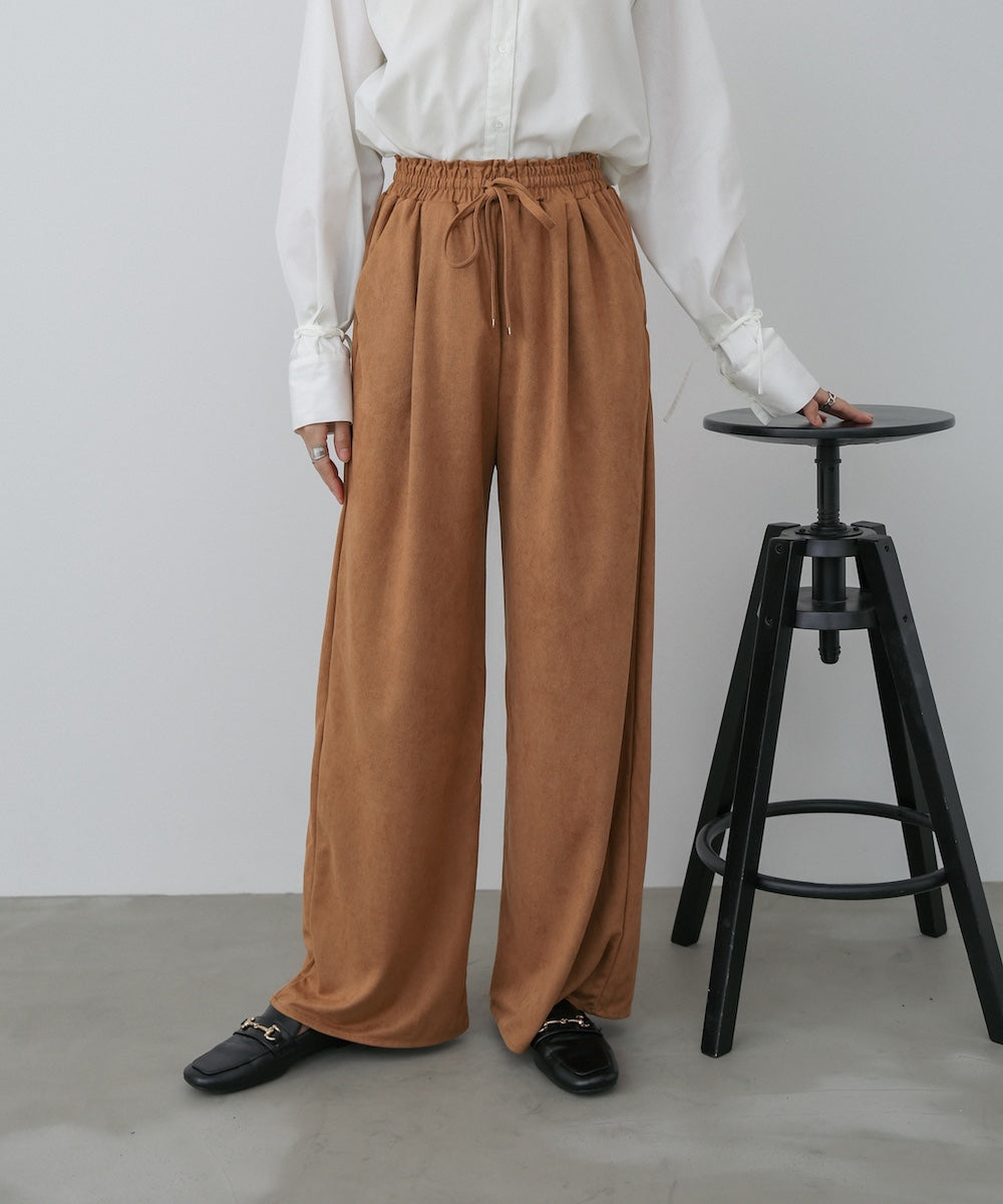 スエードのリラックスパンツが登場!秋らしさを出しながらもゆったりとノンストレスで履いていただけるアイテムになっています。ポケットもついていて実用性も◎きれいな落ち感でワイドよりのストレートパンツになっています。履くだけで一気に秋らしくなる、1枚持っていて使いまわしのきくパンツです。
