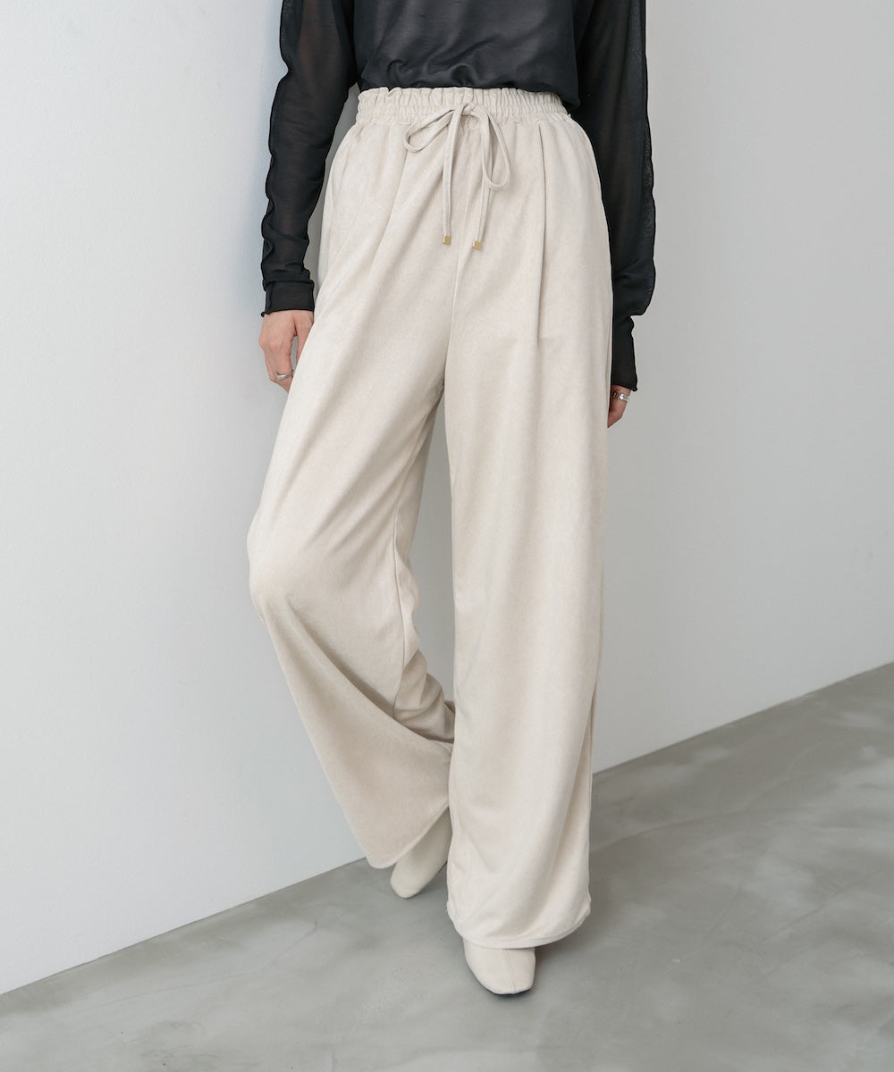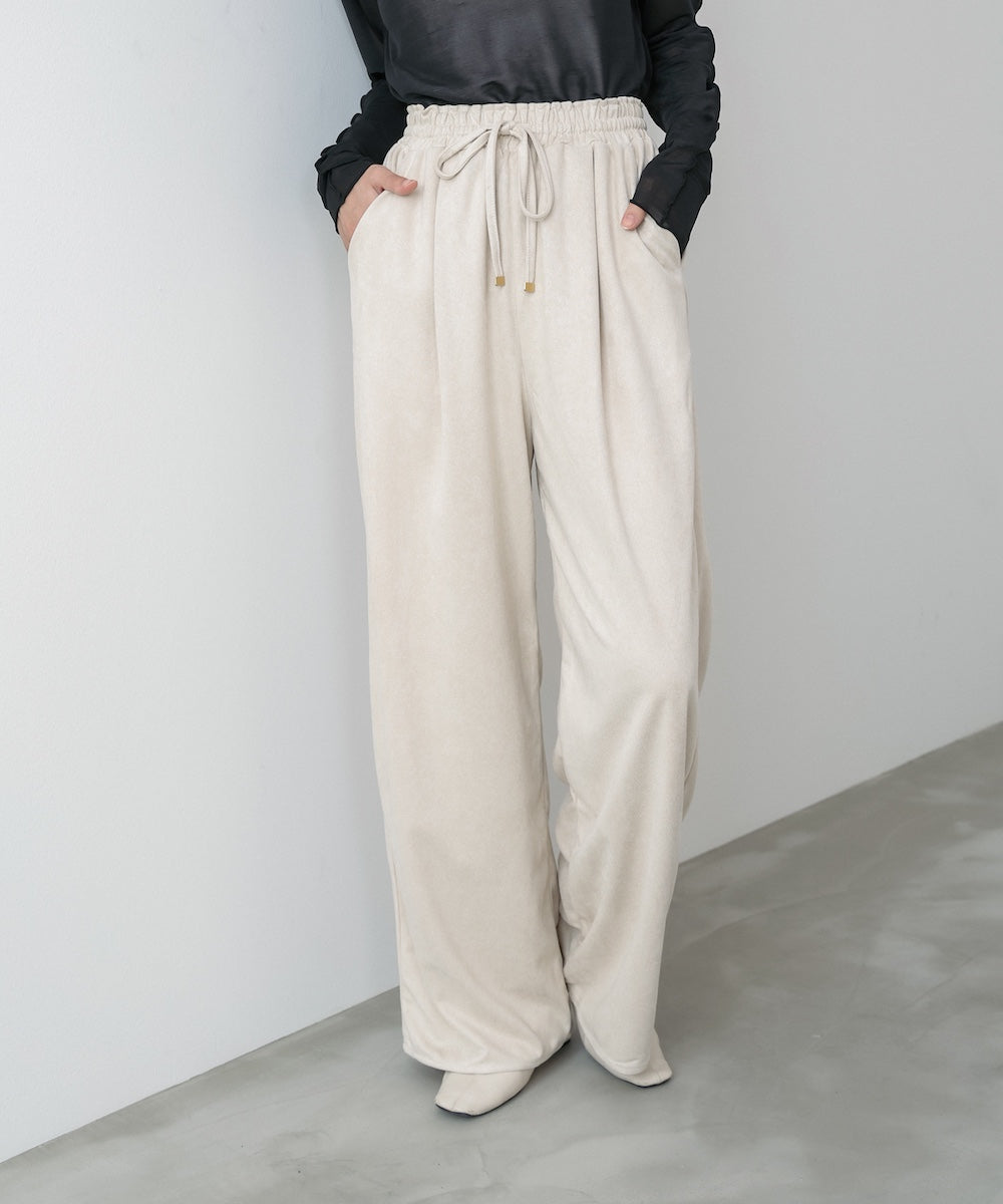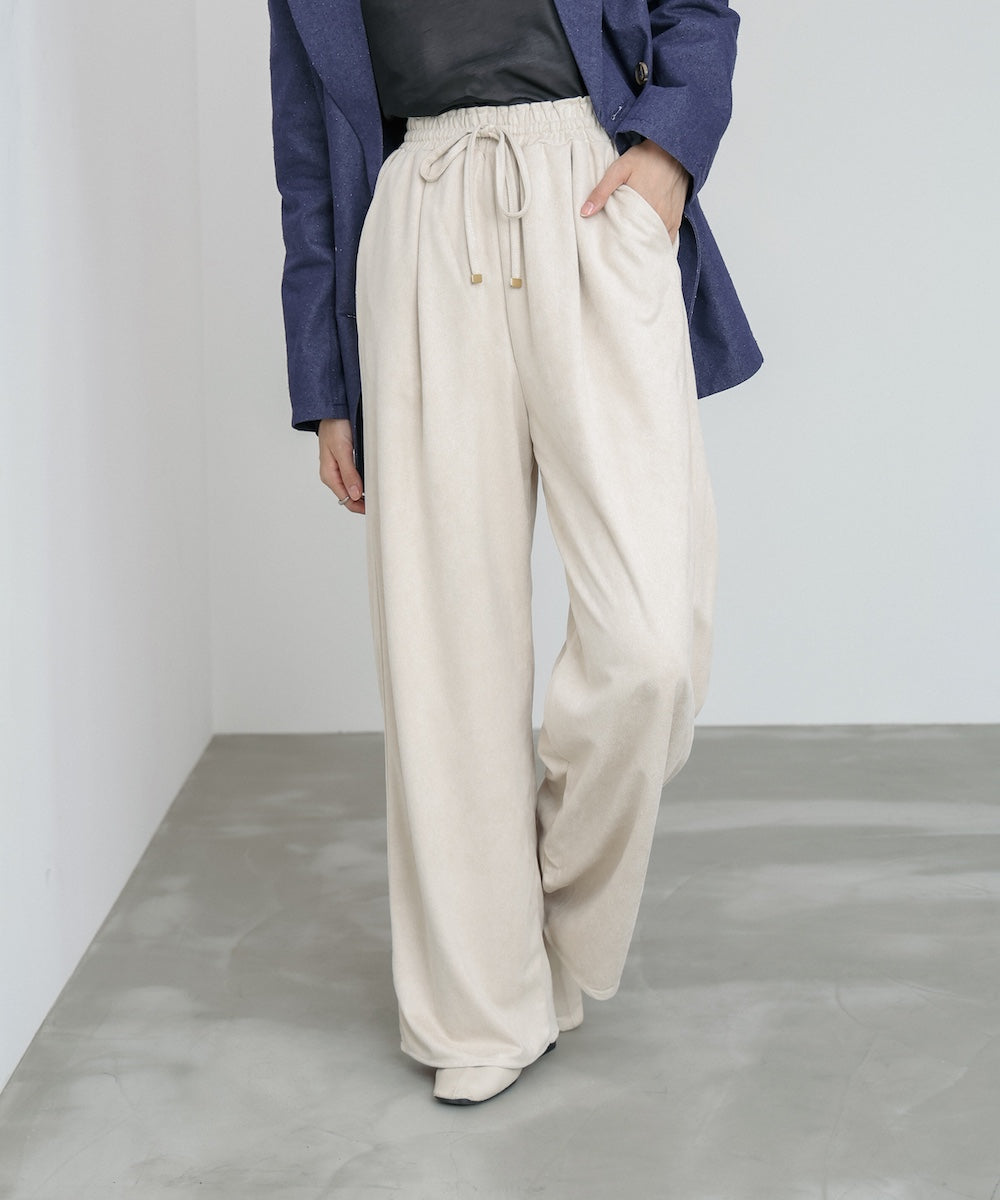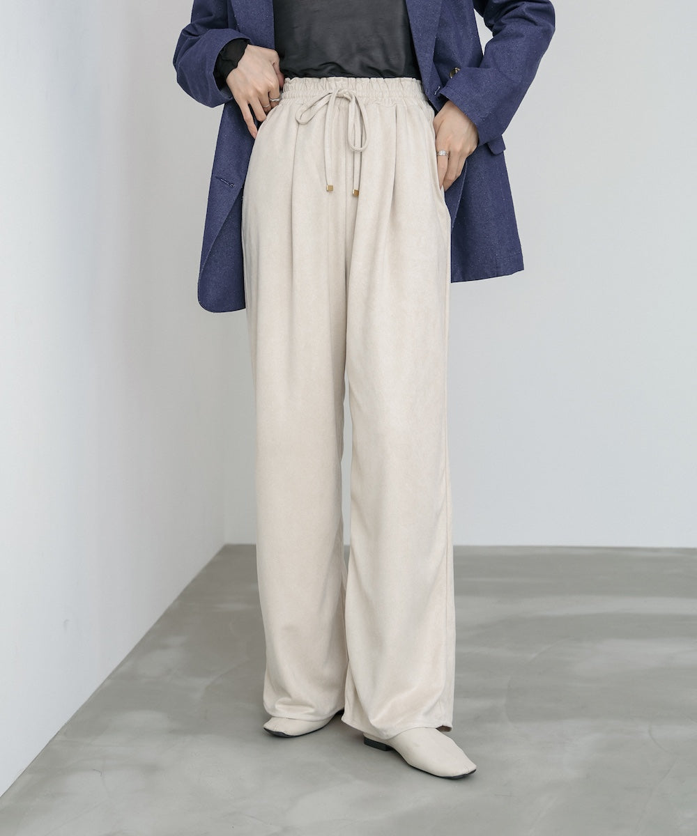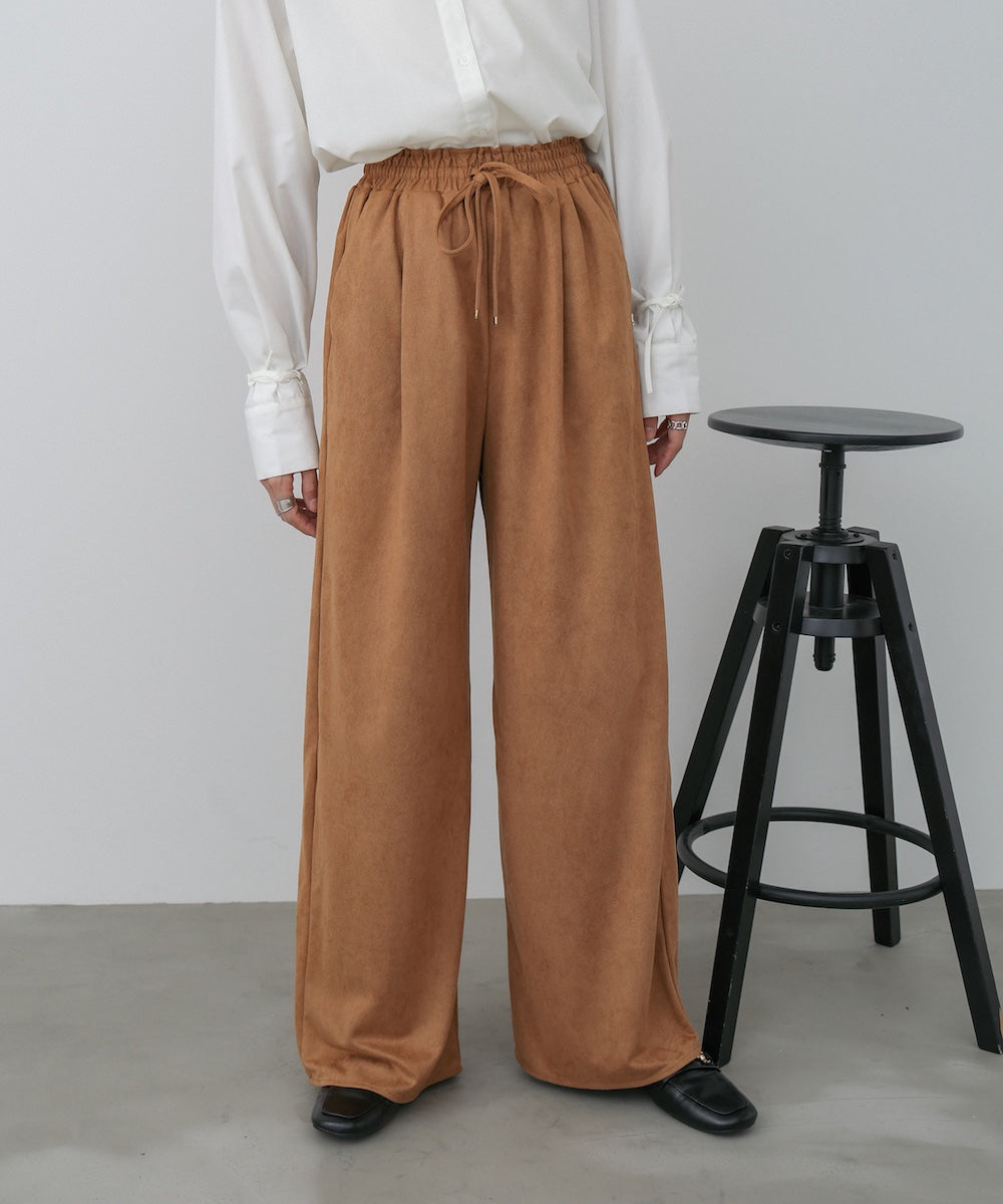 スエードのリラックスパンツが登場!秋らしさを出しながらもゆったりとノンストレスで履いていただけるアイテムになっています。ポケットもついていて実用性も◎きれいな落ち感でワイドよりのストレートパンツになっています。履くだけで一気に秋らしくなる、1枚持っていて使いまわしのきくパンツです。
