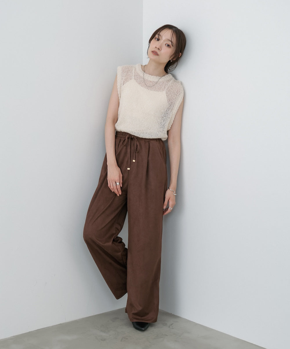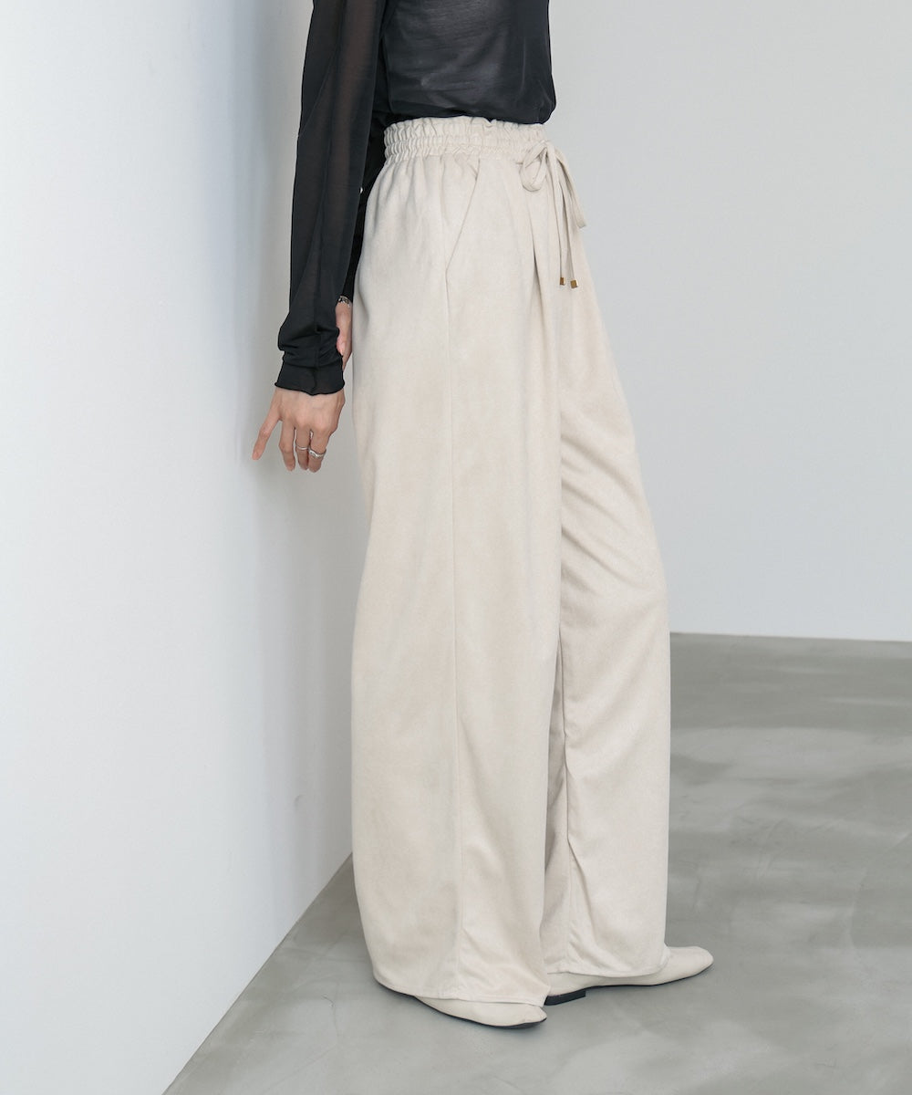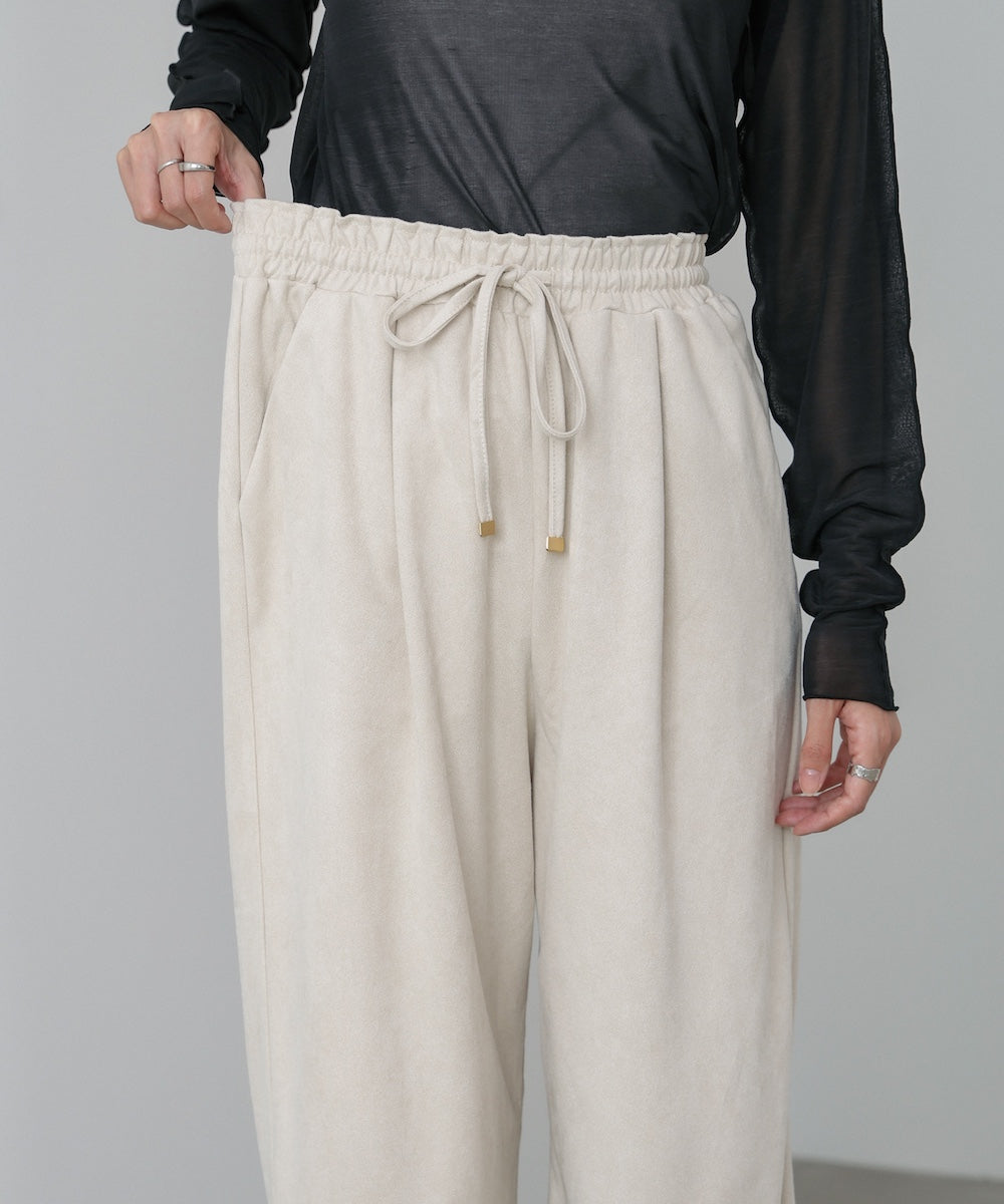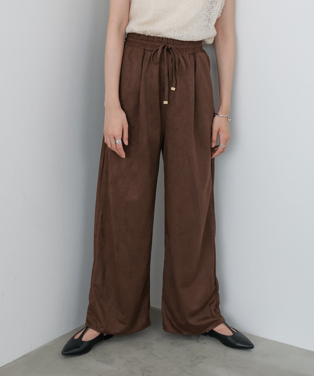 スエードのリラックスパンツが登場!秋らしさを出しながらもゆったりとノンストレスで履いていただけるアイテムになっています。ポケットもついていて実用性も◎きれいな落ち感でワイドよりのストレートパンツになっています。履くだけで一気に秋らしくなる、1枚持っていて使いまわしのきくパンツです。