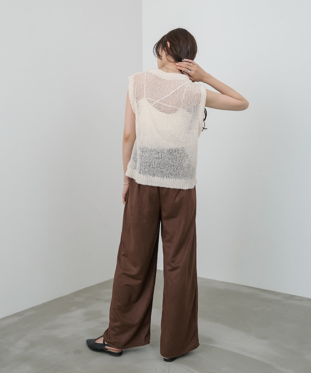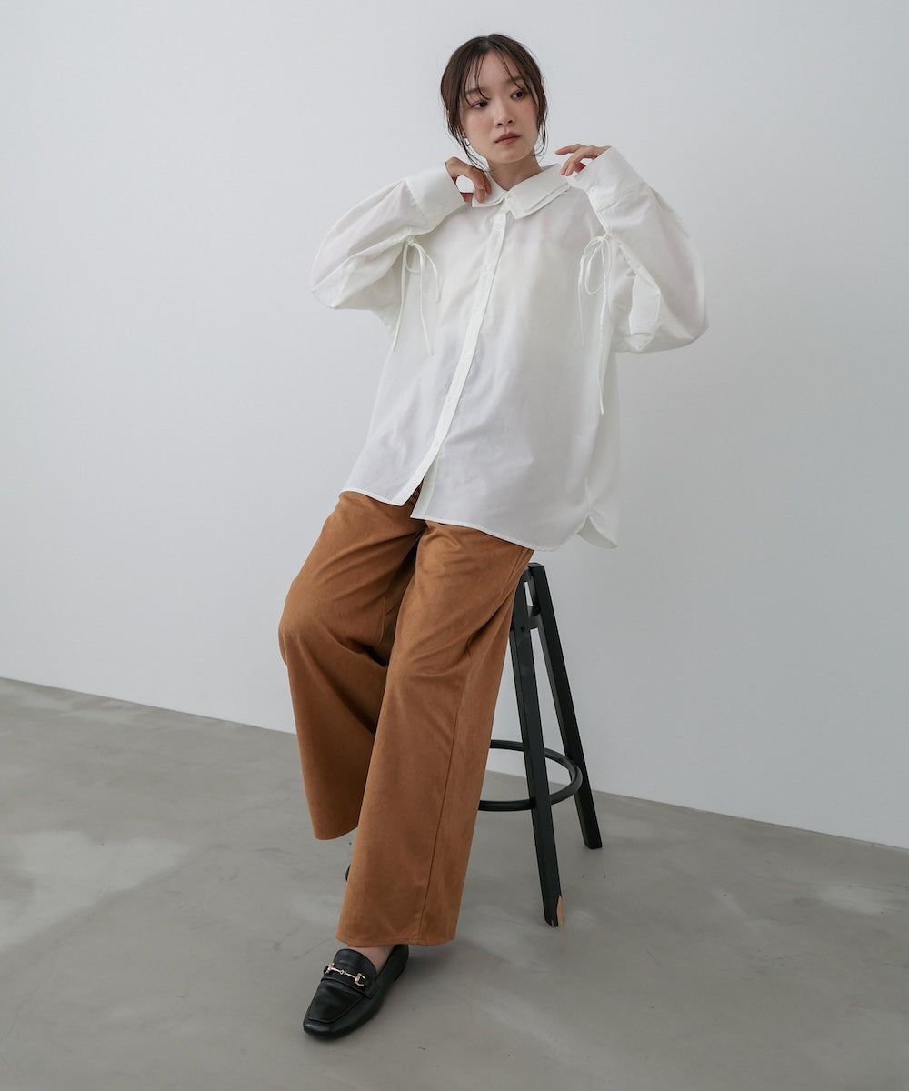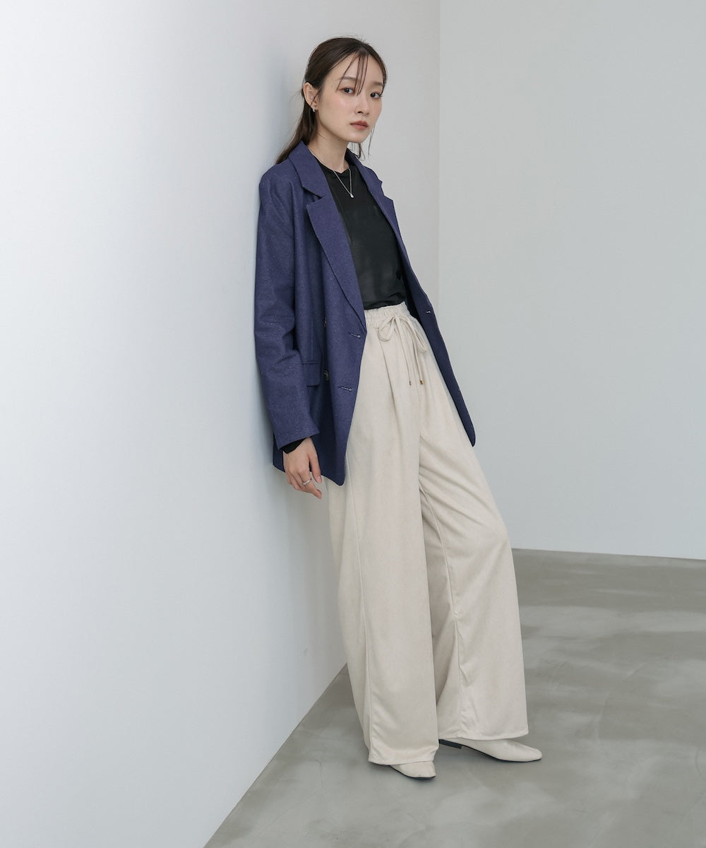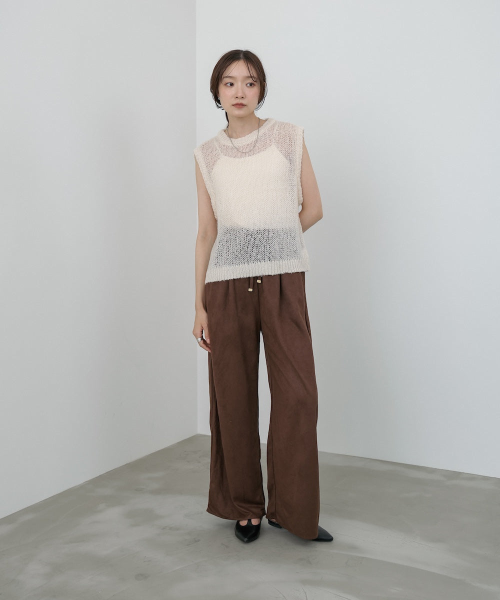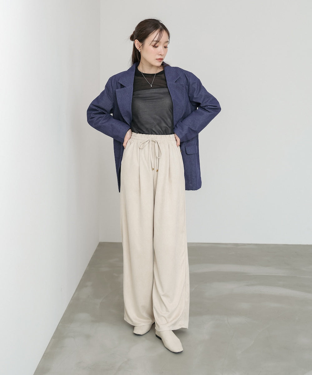 スエードのリラックスパンツが登場!秋らしさを出しながらもゆったりとノンストレスで履いていただけるアイテムになっています。ポケットもついていて実用性も◎きれいな落ち感でワイドよりのストレートパンツになっています。履くだけで一気に秋らしくなる、1枚持っていて使いまわしのきくパンツです。