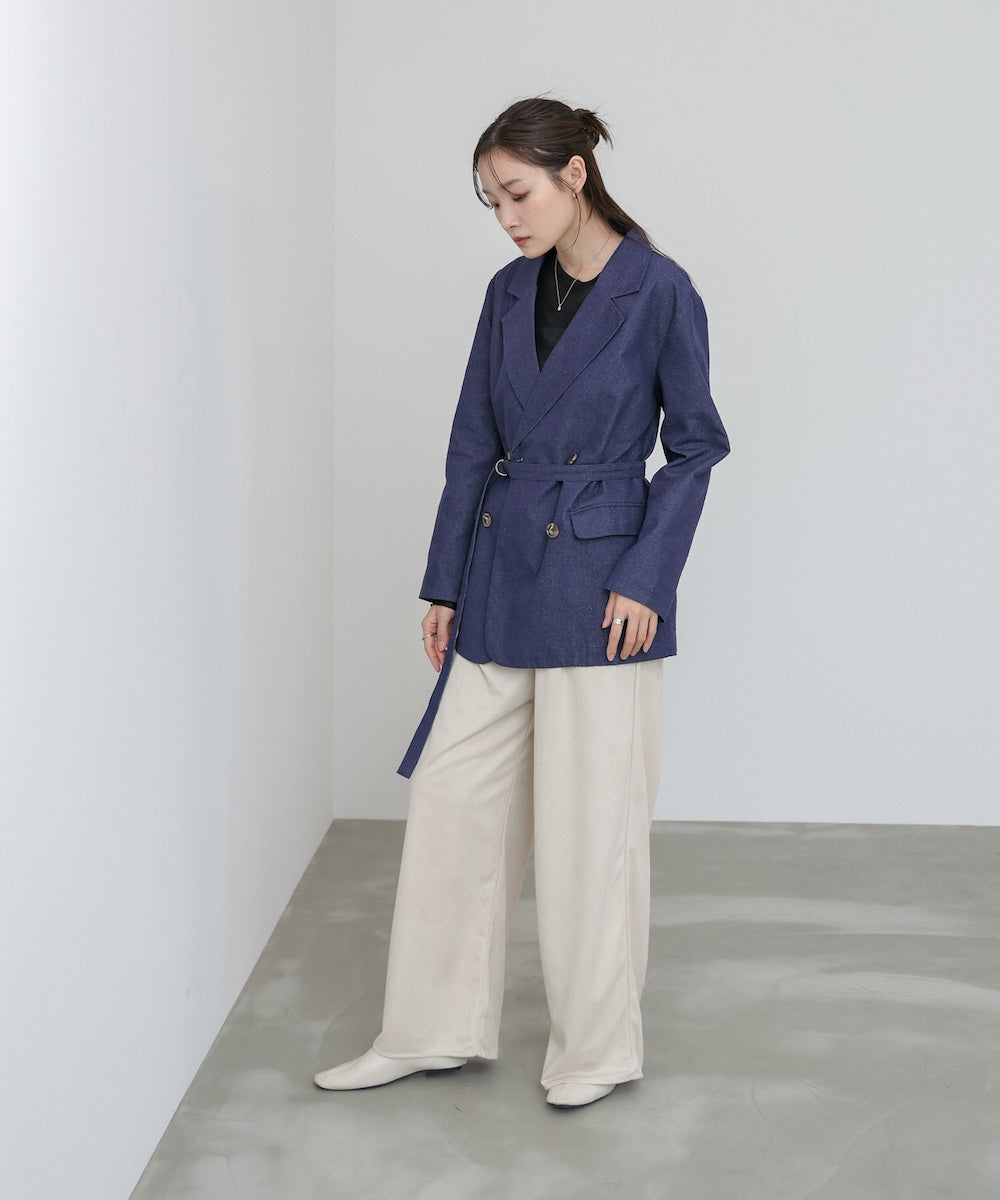 シンプルなロングTシャツとジャケットを合わせてトレンドのエアポートコーデにしたり、ワンショルのスウェットと合わせたりなど着回しの利くアイテムになっています。