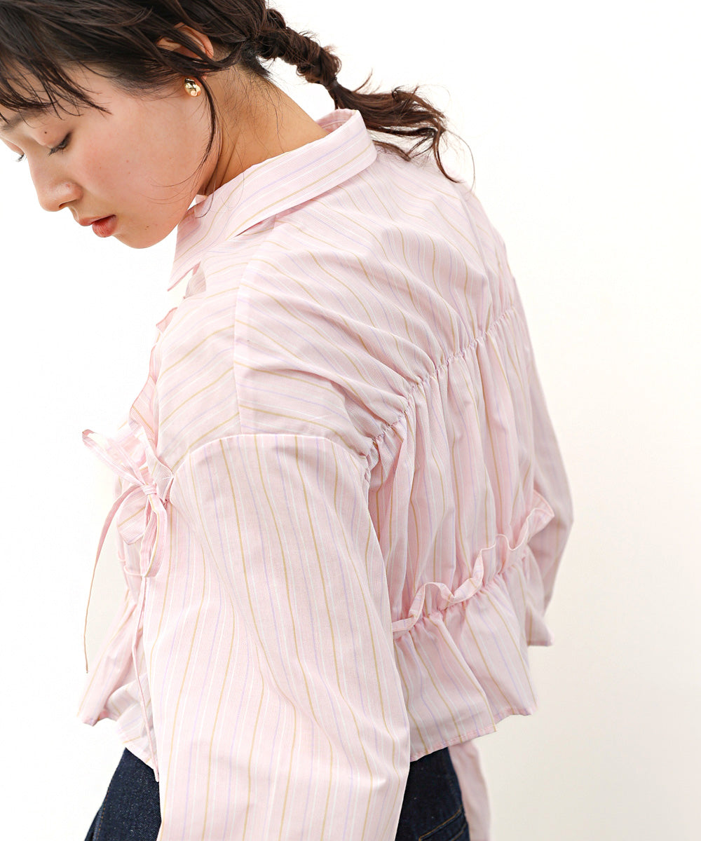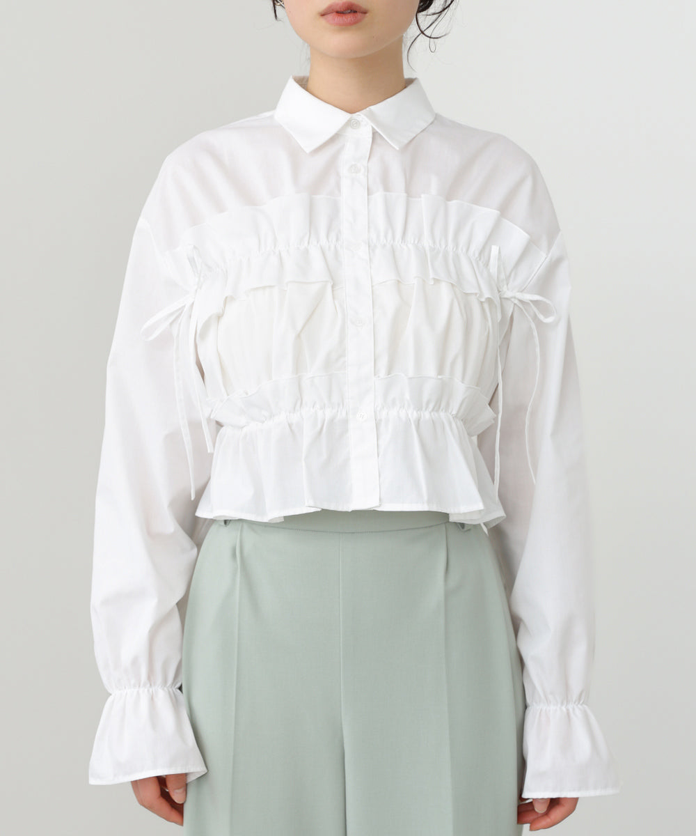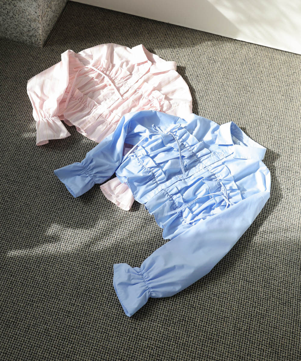 AWで大人気だったコーデュロイブラウスが春素材に変えて登場!胸元部分のシャーリングと小ぶりリボンがついたトレンドライクなブラウスになっています。袖部分は手元がふわっと広がるようになっていてフェミニンさがプラスされています。デニムと合わせたりスラックスと合わせたりと合わせ方が様々なので、オンオフ問わずにお使いいただける万能ブラウスです。