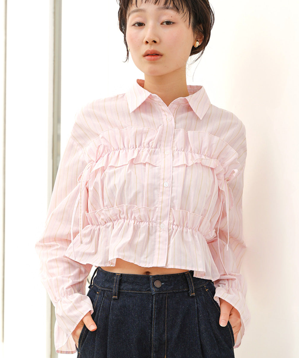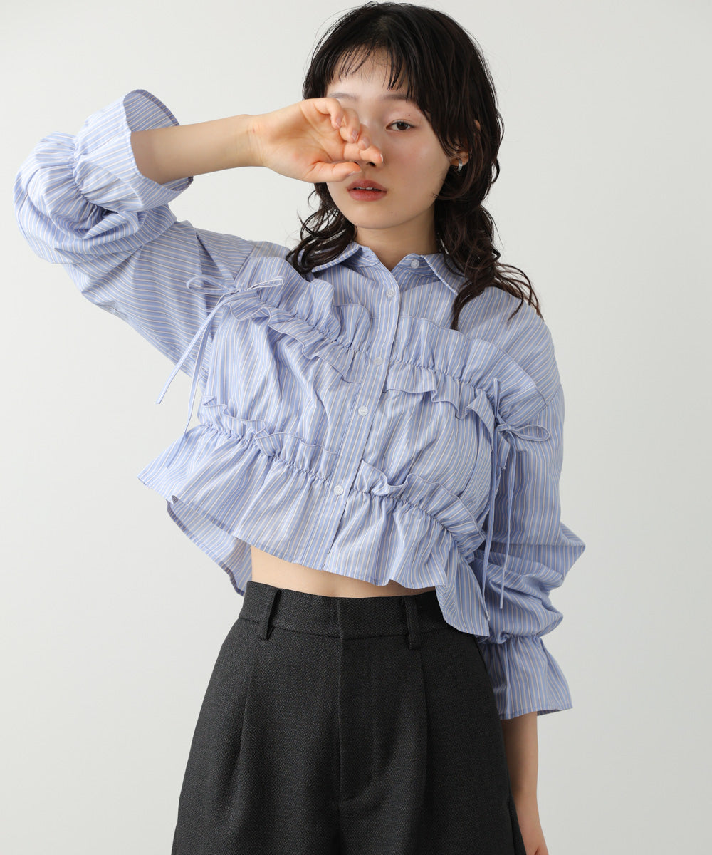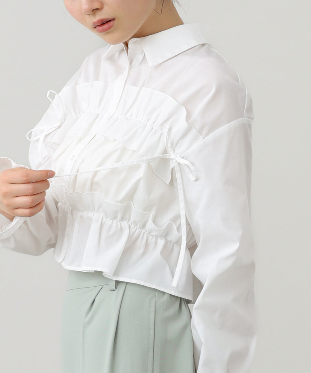 AWで大人気だったコーデュロイブラウスが春素材に変えて登場!胸元部分のシャーリングと小ぶりリボンがついたトレンドライクなブラウスになっています。袖部分は手元がふわっと広がるようになっていてフェミニンさがプラスされています。デニムと合わせたりスラックスと合わせたりと合わせ方が様々なので、オンオフ問わずにお使いいただける万能ブラウスです。