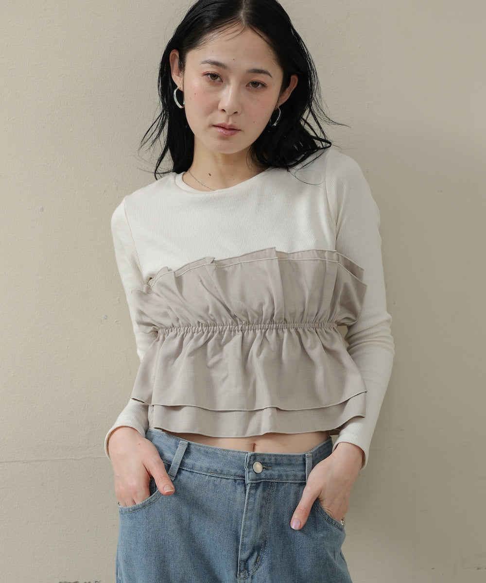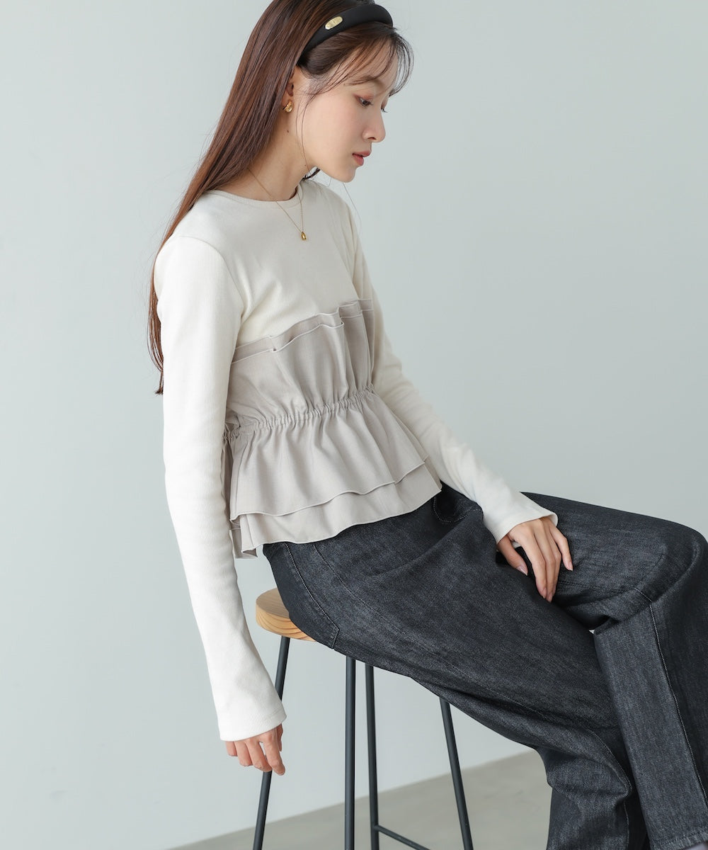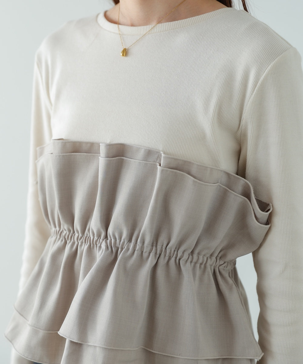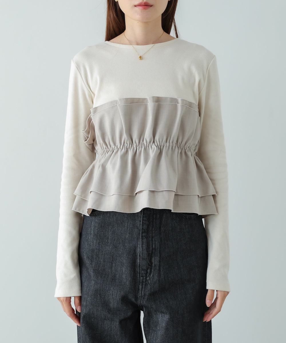 本体は柔らかく肌なじみの良いカットソー素材。裾部分には繊細で存在感のある別生地を使用し、ふんわりとしたハリ感を演出しています。