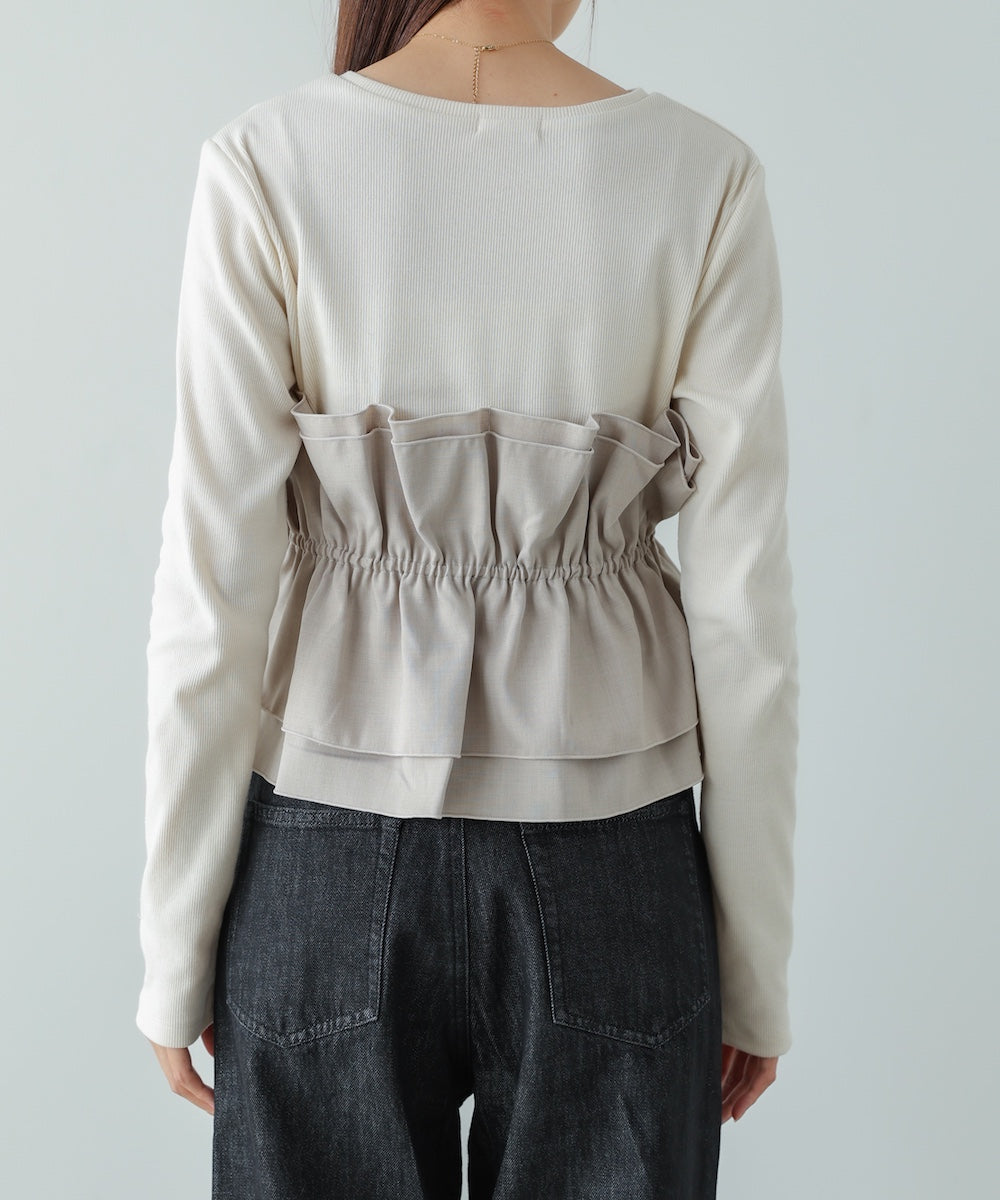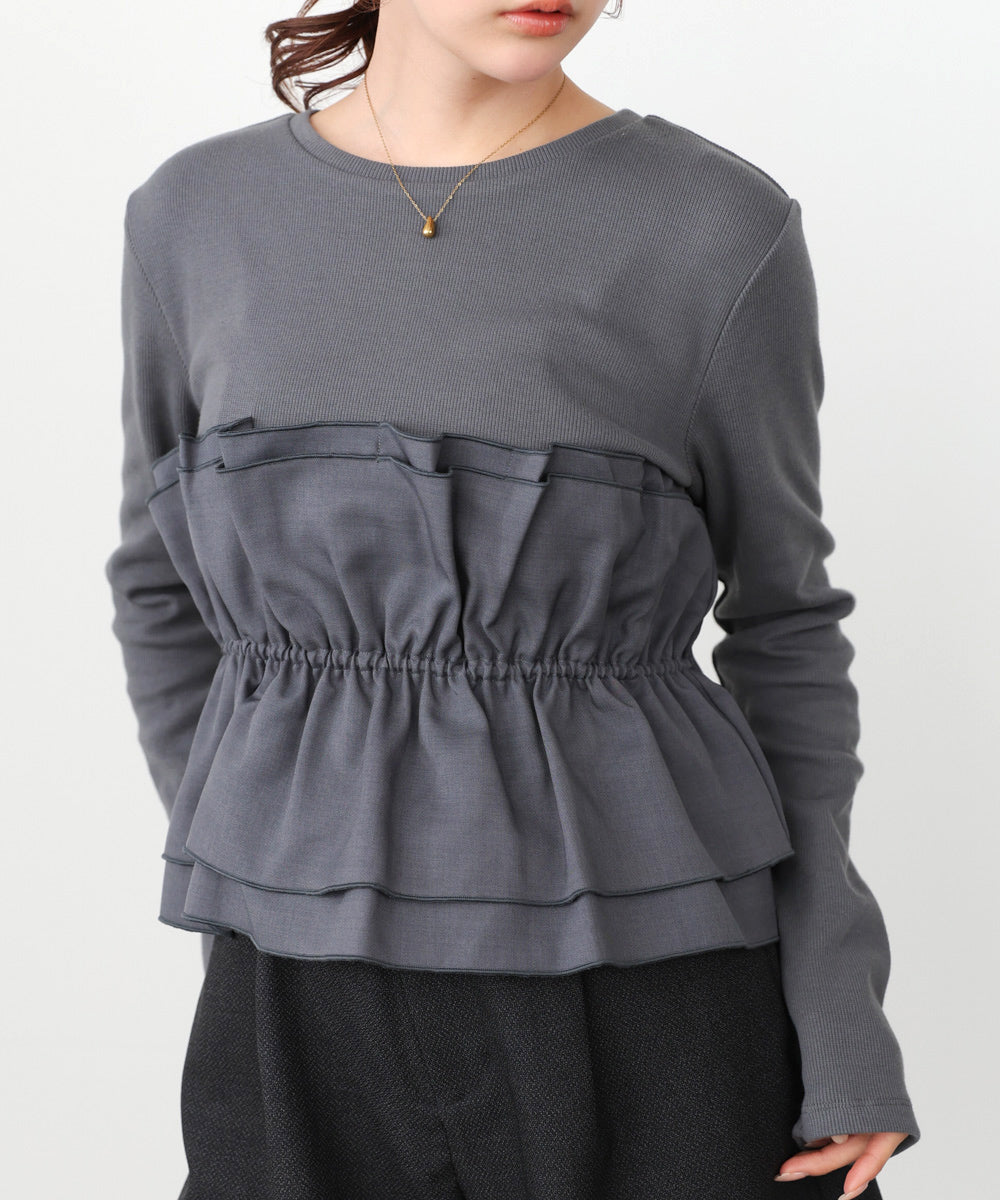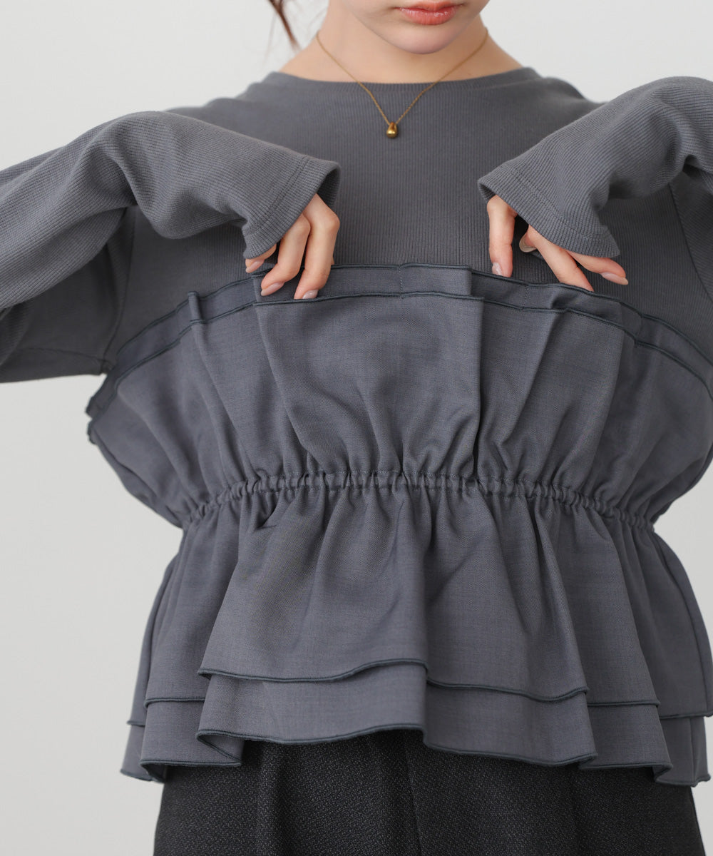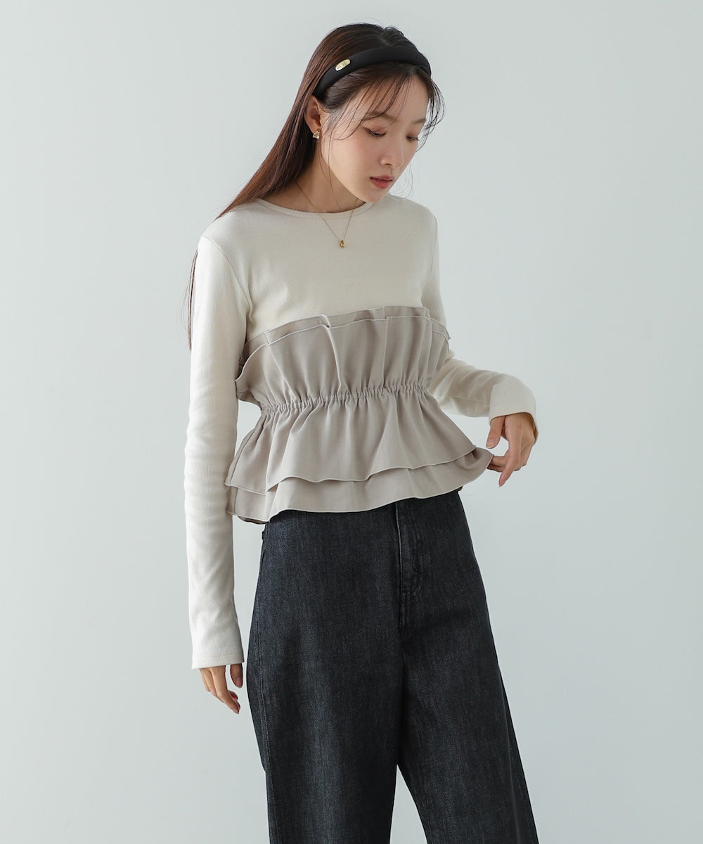 本体は柔らかく肌なじみの良いカットソー素材。裾部分には繊細で存在感のある別生地を使用し、ふんわりとしたハリ感を演出しています。