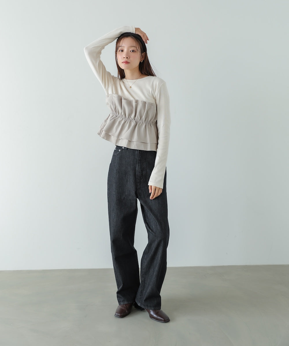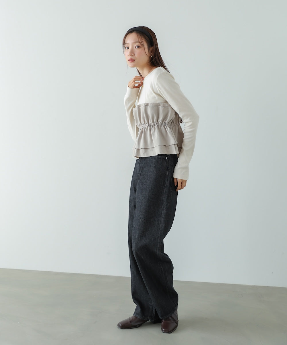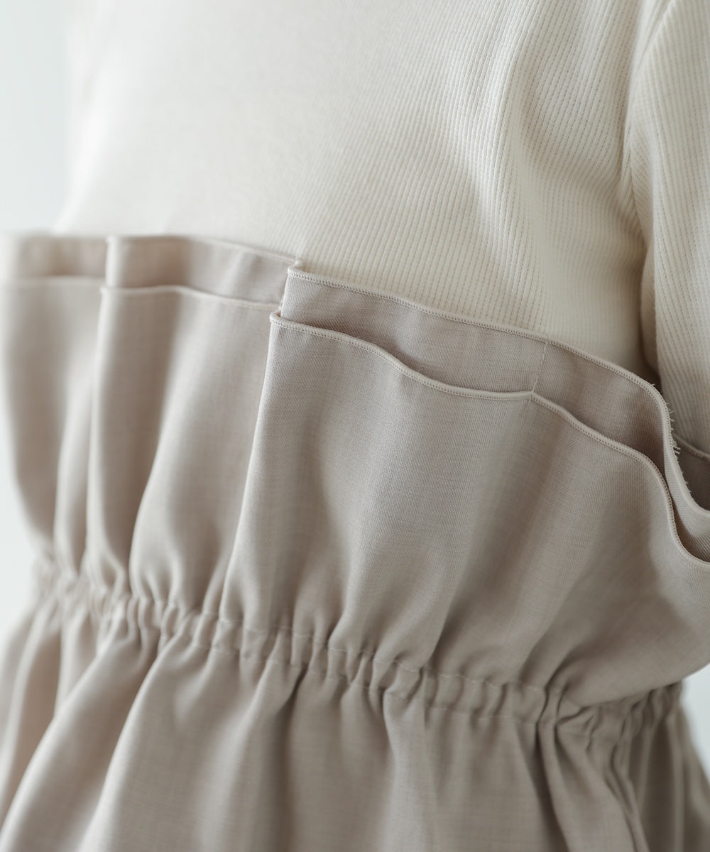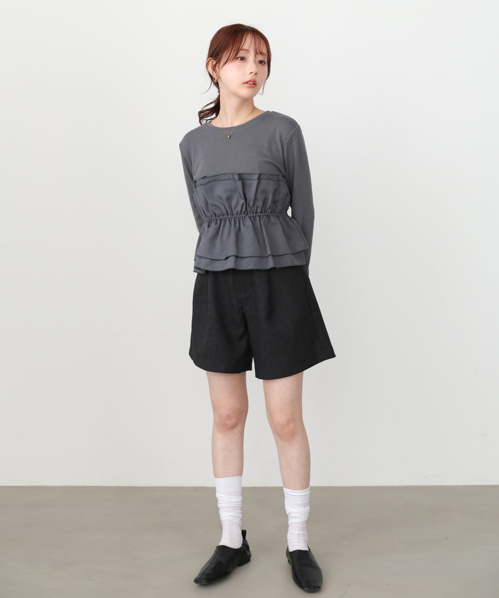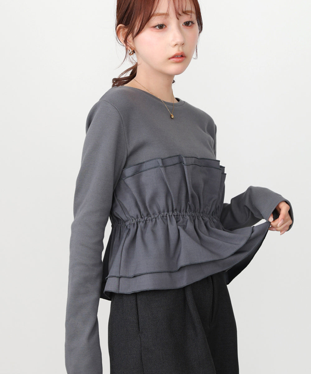 本体は柔らかく肌なじみの良いカットソー素材。裾部分には繊細で存在感のある別生地を使用し、ふんわりとしたハリ感を演出しています。
