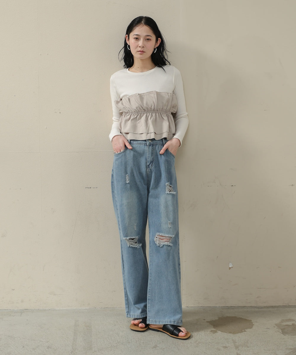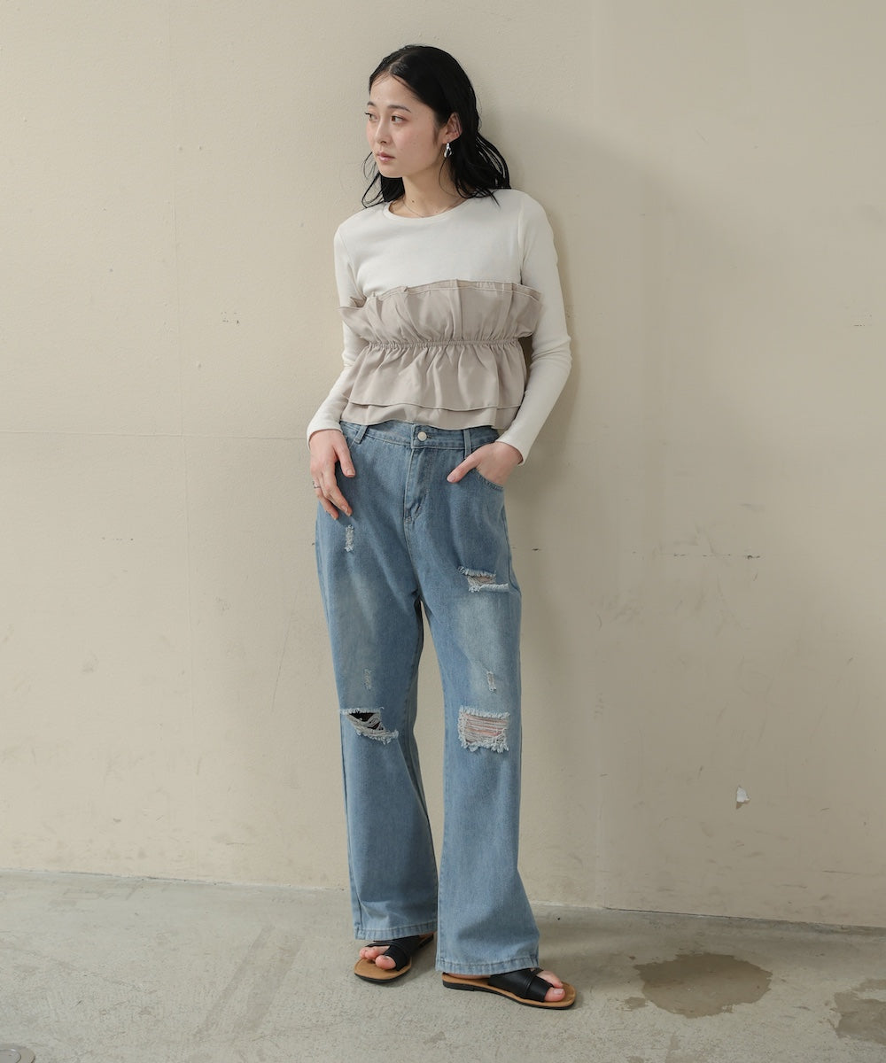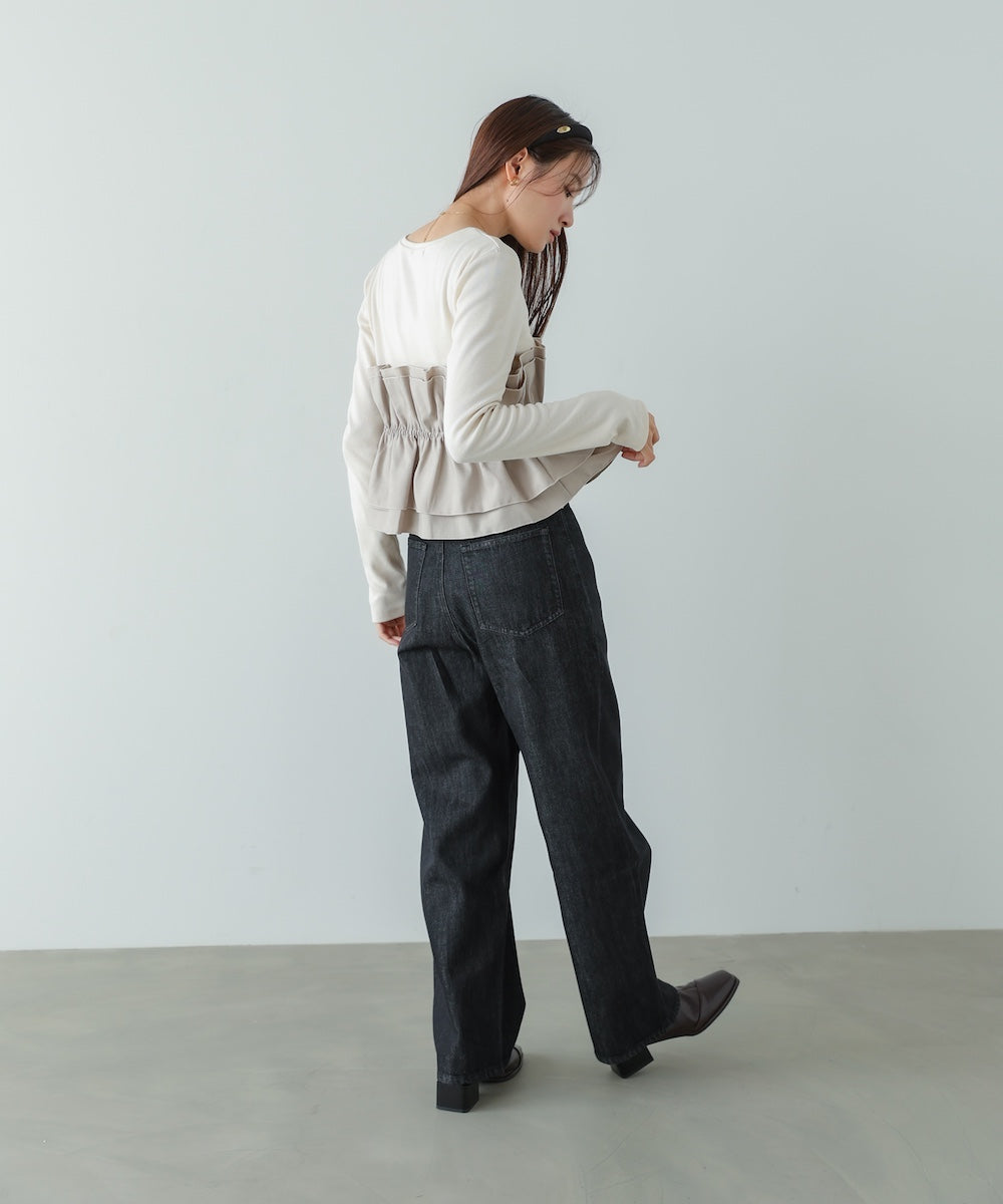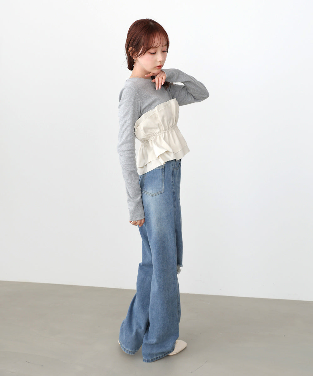 本体は柔らかく肌なじみの良いカットソー素材。裾部分には繊細で存在感のある別生地を使用し、ふんわりとしたハリ感を演出しています。