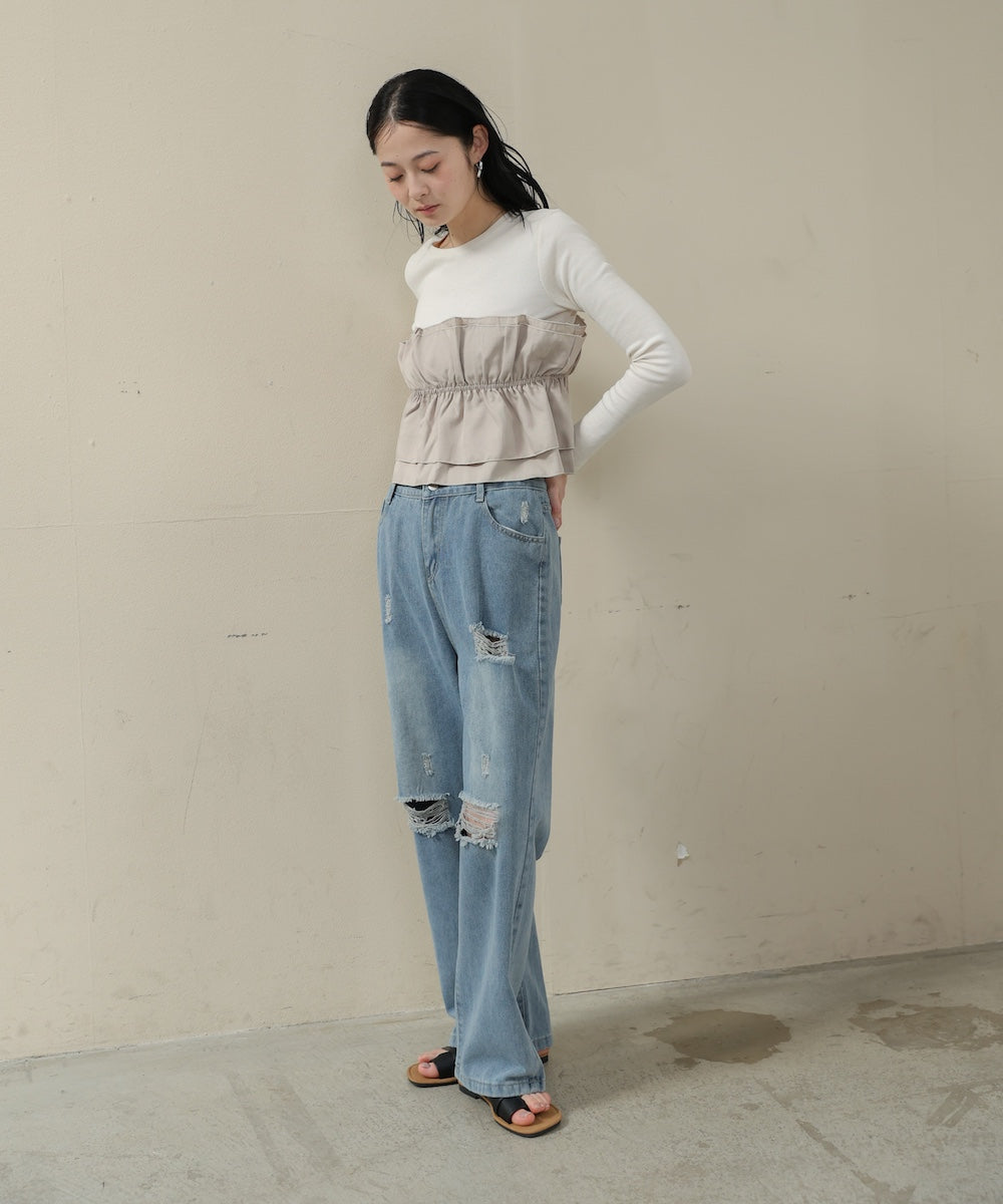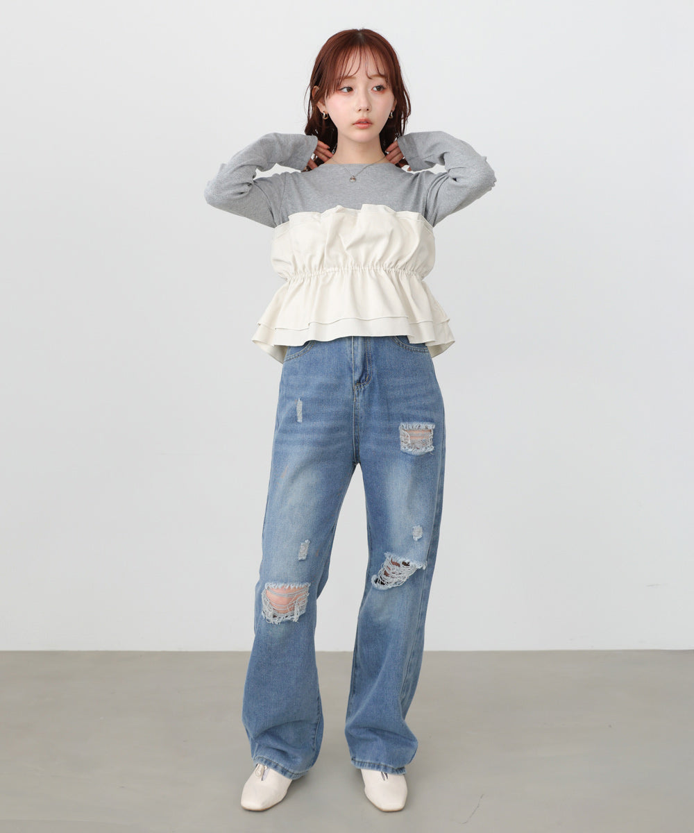 デニムと合わせて、フリルを主役にした大人可愛いカジュアルスタイルがおすすめです。ジャケットを羽織って裾フリルをちらっと見せると、甘さを控えつつ華やかな印象になります。サテンスカートと合わせてもクラシカルな印象になって上品な雰囲気になります。