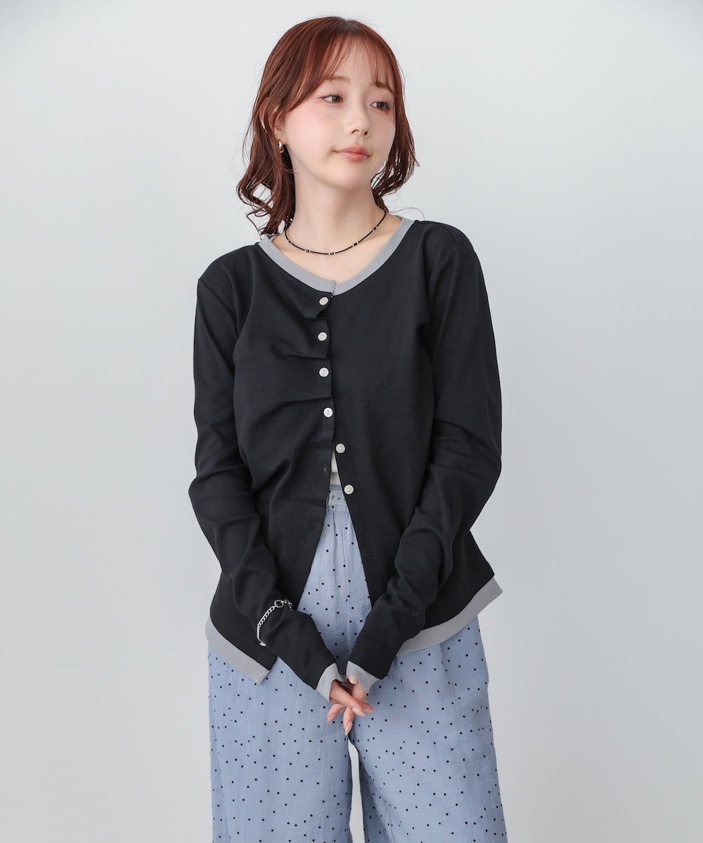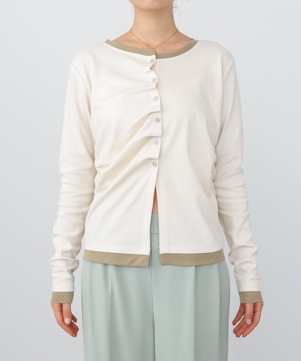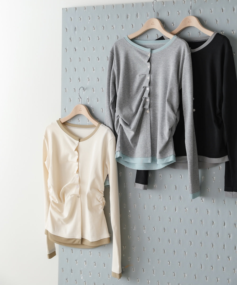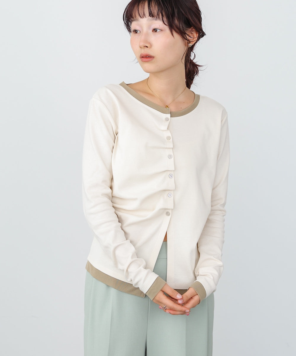 アシンメトリーに寄せたドレープデザインが目を惹く、配色レイヤードカーディガン。さりげなく覗く配色カラーが、シンプルな中にひとクセを添えるポイントです。立体感のあるシルエットで、羽織るだけでコーデがぐっとこなれた印象に。アイボリーは柔らかく上品に、グレーはニュアンス感たっぷりに、ブラックはモードに仕上がります。