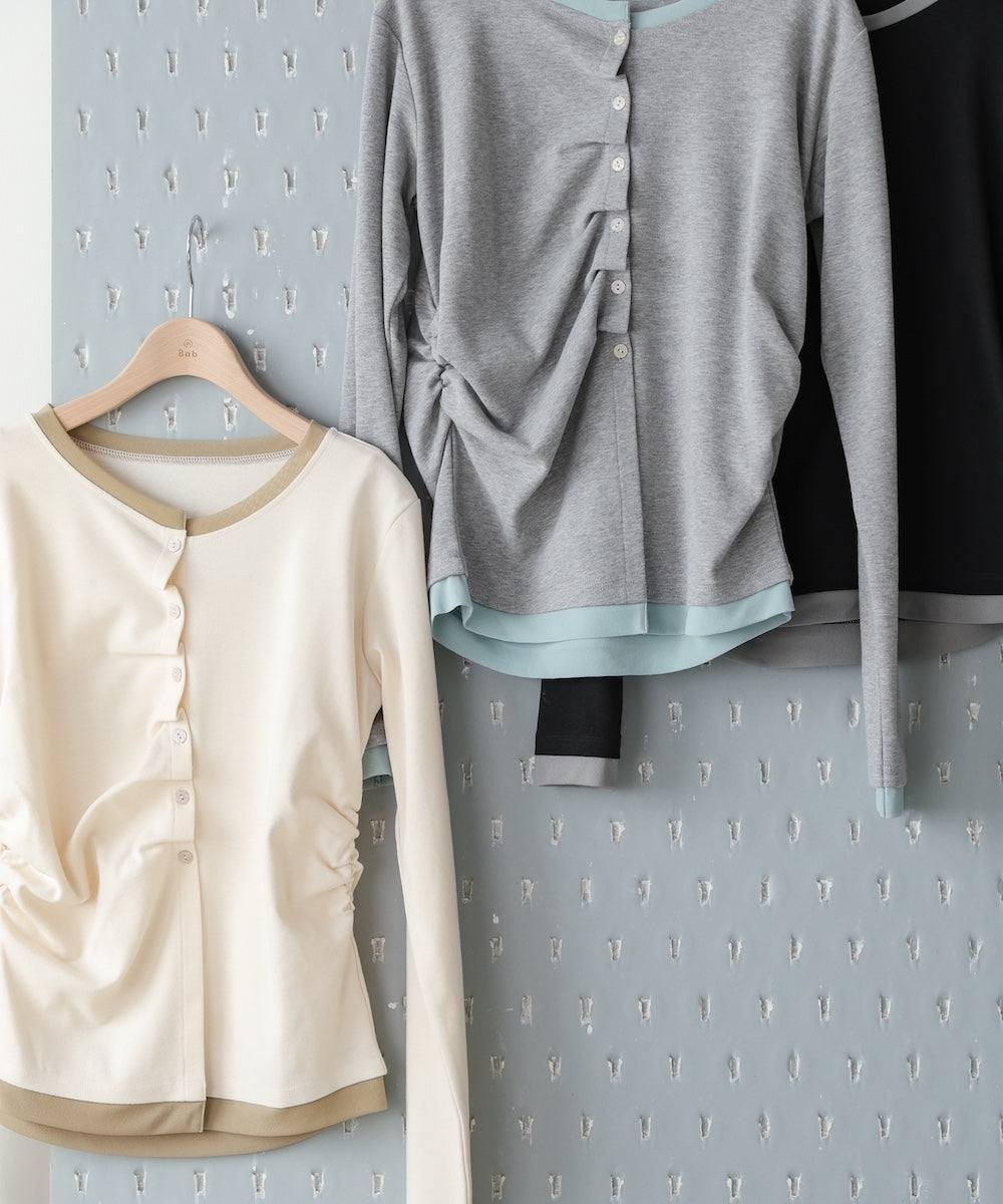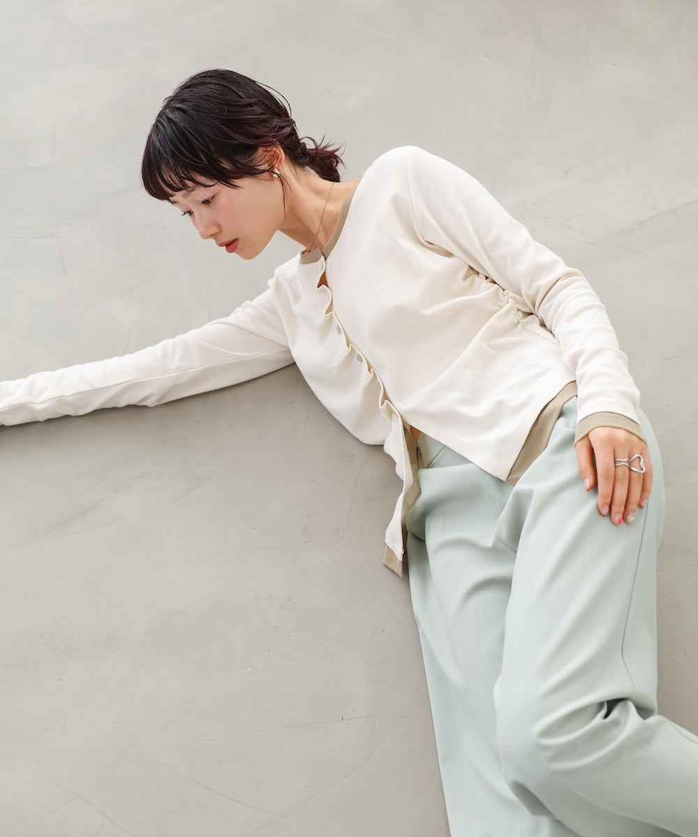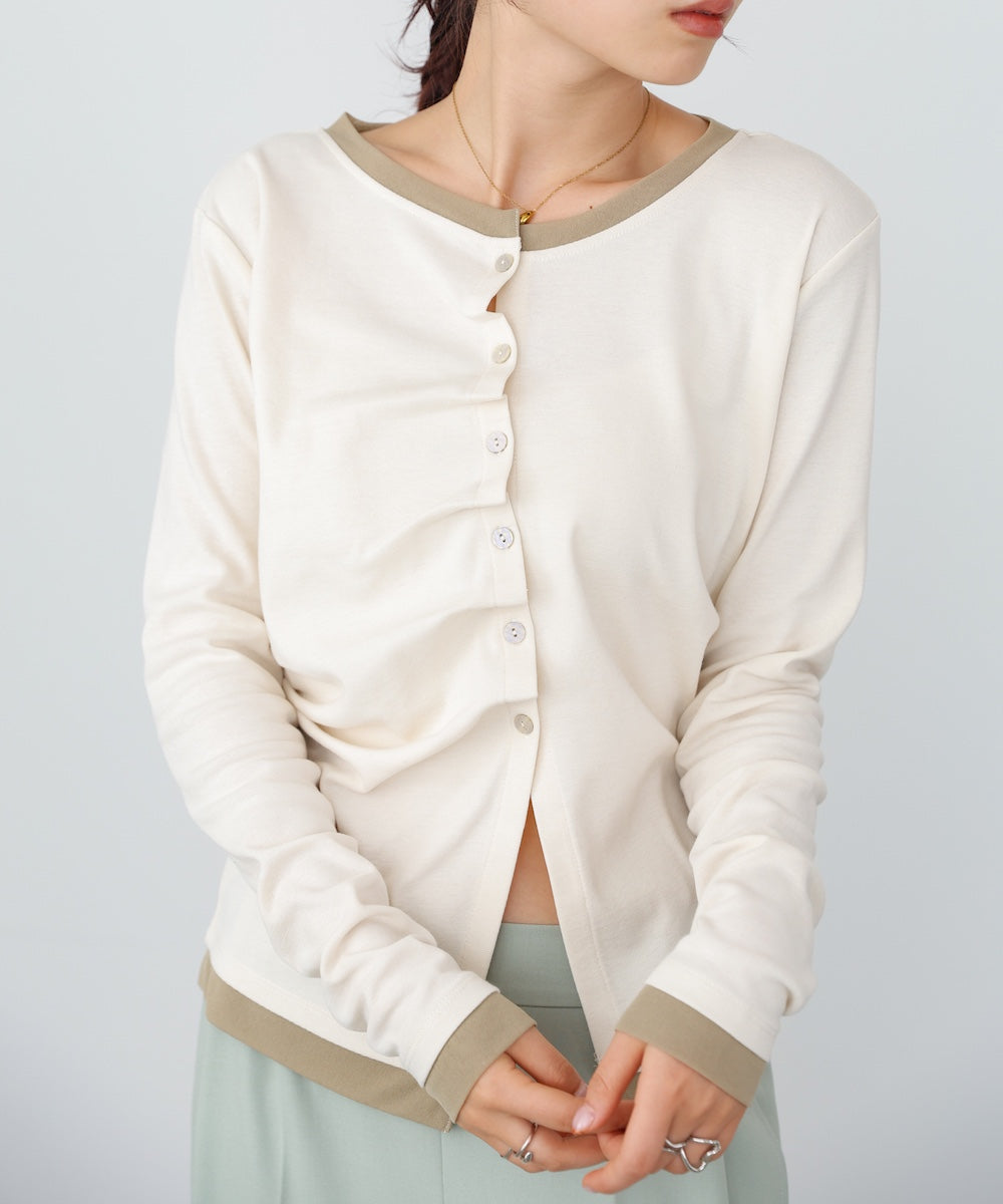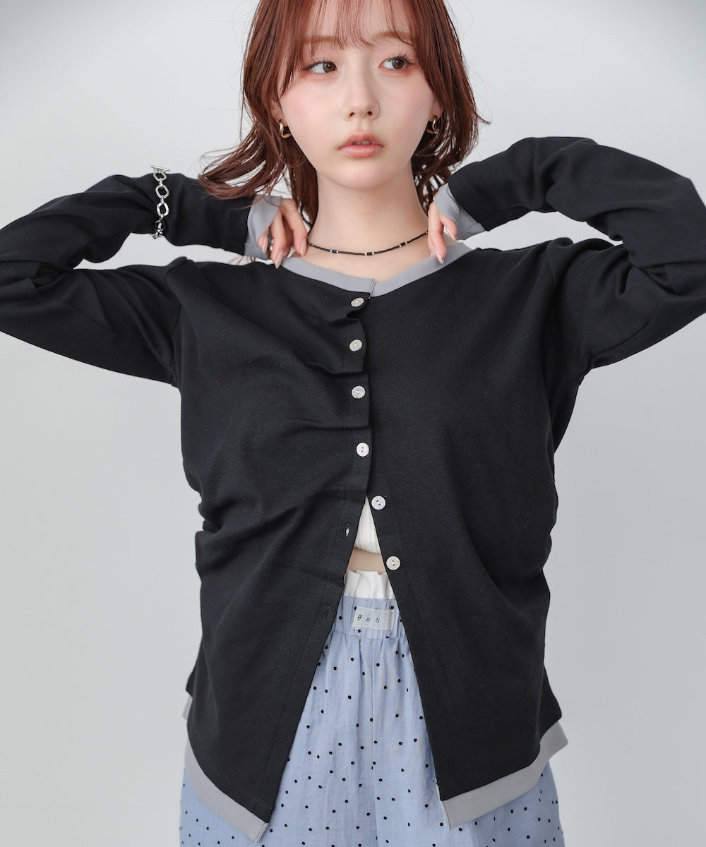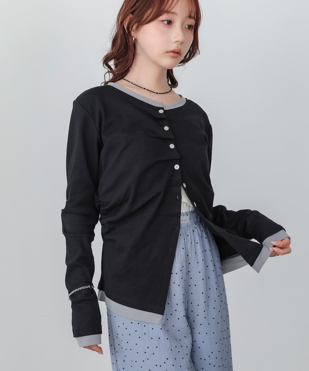 アシンメトリーに寄せたドレープデザインが目を惹く、配色レイヤードカーディガン。さりげなく覗く配色カラーが、シンプルな中にひとクセを添えるポイントです。立体感のあるシルエットで、羽織るだけでコーデがぐっとこなれた印象に。アイボリーは柔らかく上品に、グレーはニュアンス感たっぷりに、ブラックはモードに仕上がります。